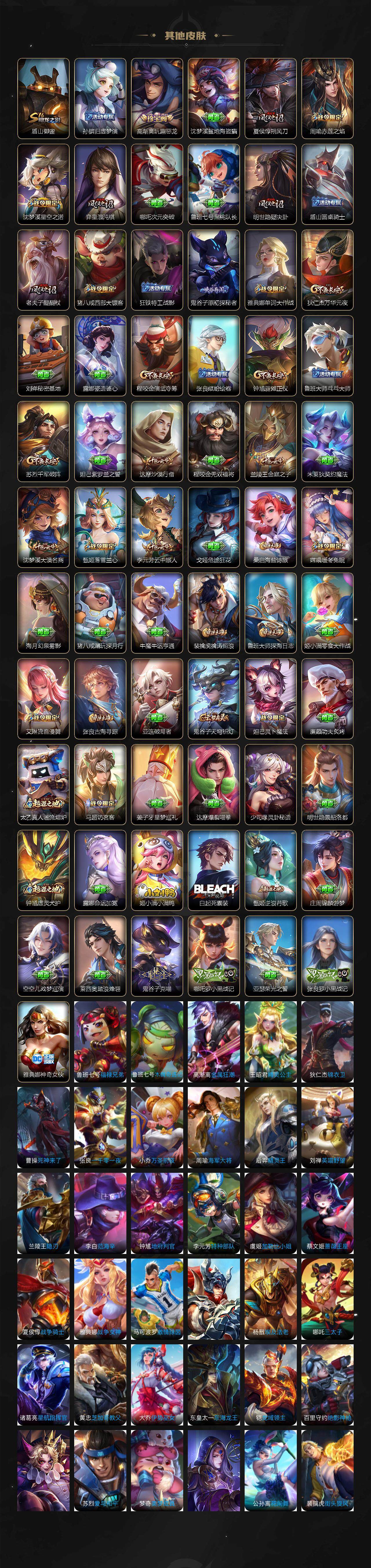 关羽冰锋战神,裴擒虎李小龙,上官婉儿梁祝,马超神威,伽罗太华,哪吒逐梦之翼,百里守约朱雀志,小乔纯白花嫁,孙悟空大圣娶亲,露娜一生所爱,孙悟空至尊宝,雅典娜神奇女侠,干将莫邪冰霜恋舞曲,妲己时之彼端,孙尚香异界灵契,孙悟空孙行者,司空震愿照·山河定