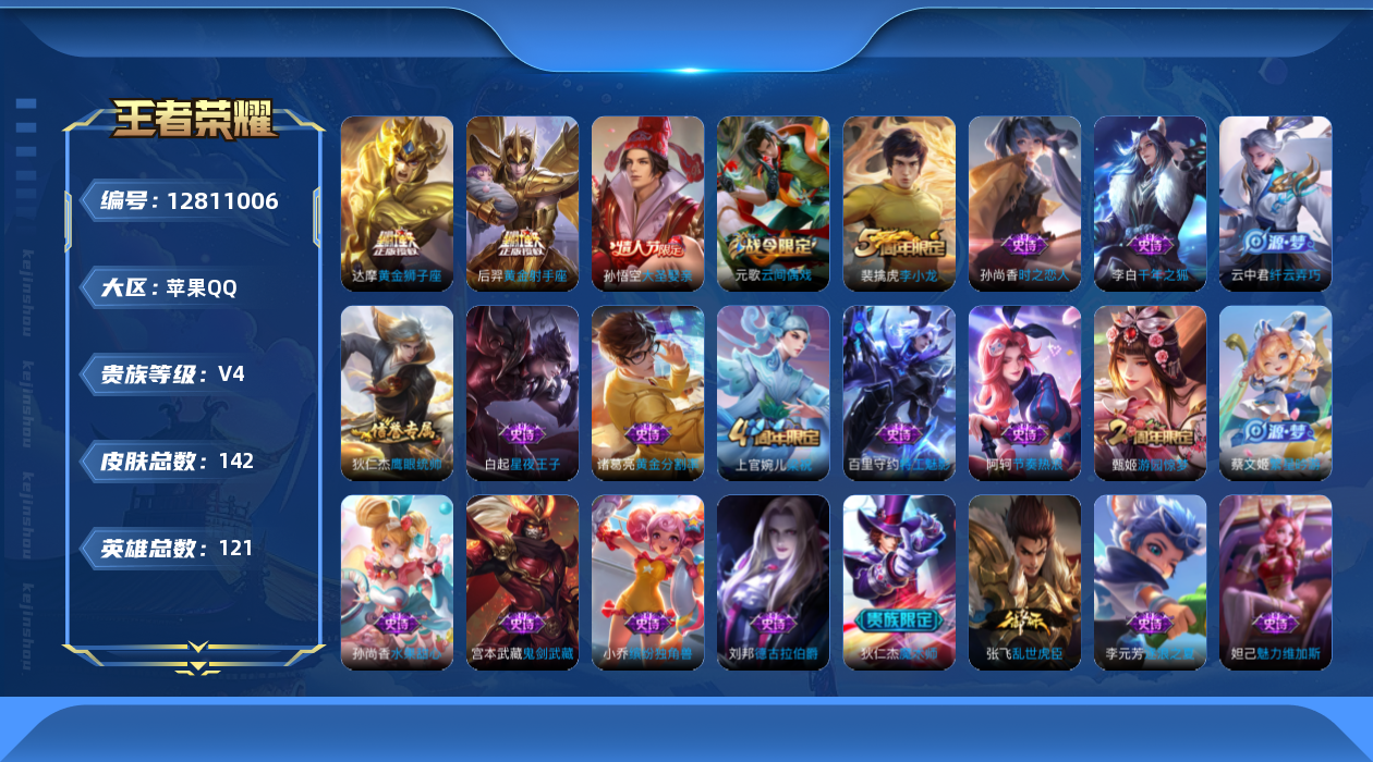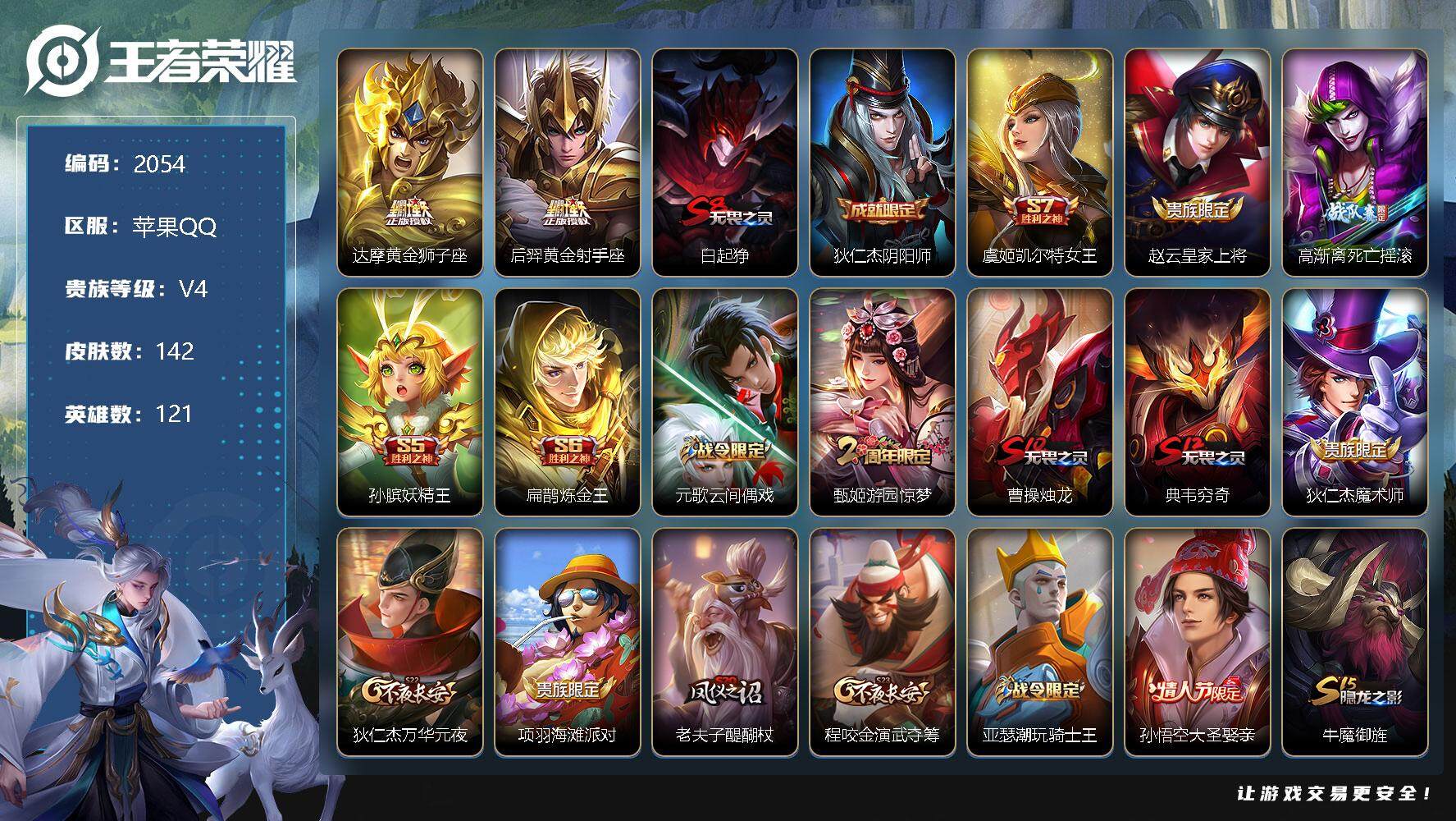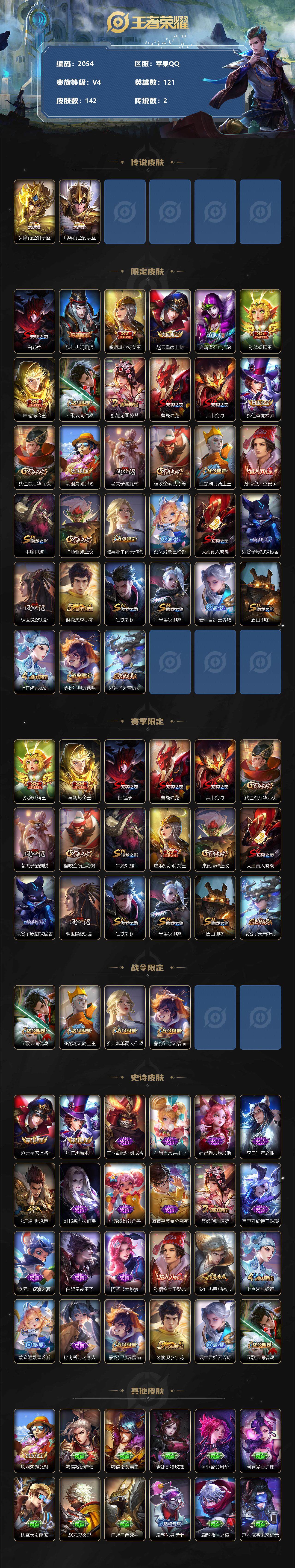 [12811006]苹果Q-V4-至尊星耀V段位-121英雄-142皮肤-0典藏-0珍品无双-0无双-0珍品传说-2传说-24史诗