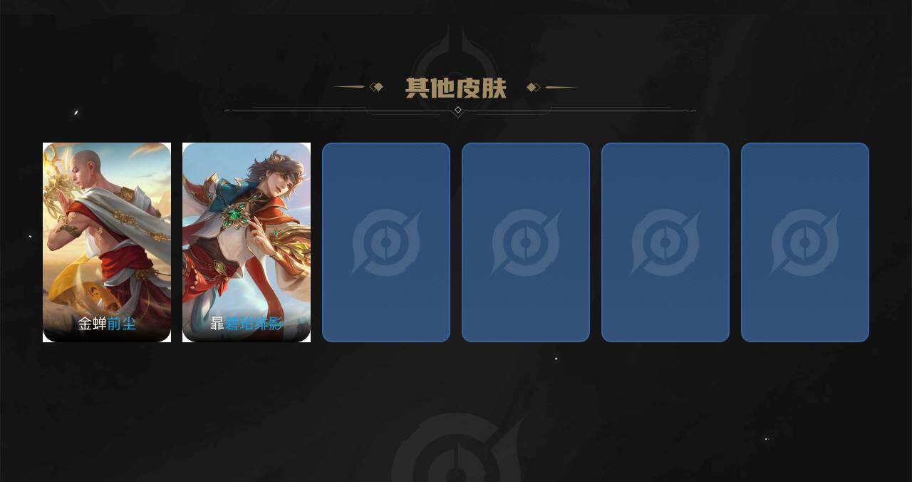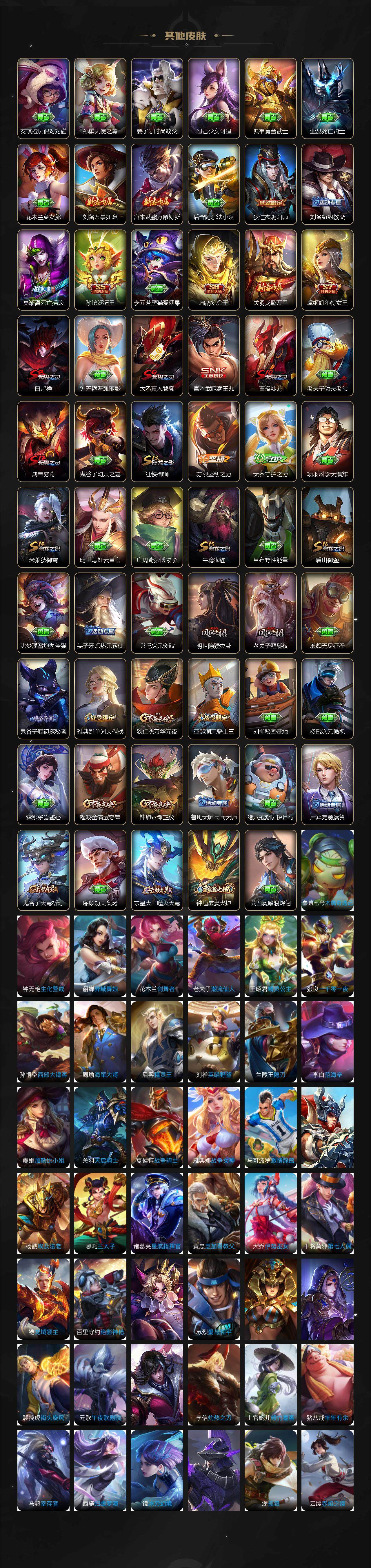 【其他皮肤】:项羽海滩派对,韩信教廷特使,韩信街头霸王,露娜哥特玫瑰,阿轲致命风华,阿轲爱心护理,达摩大发明家,赵云忍炎影,白起白色死神,扁鹊化身博士,扁鹊救世之瞳,宫本武藏未来纪元,安琪拉玩偶对对碰,孙膑天使之翼,姜子牙时尚教父,妲己少女阿狸,典韦黄金武士,亚瑟死亡骑士,花木兰兔女郎,刘备万事如意,宫本武藏万象初新,后羿阿尔法小队,狄仁杰阴阳师,刘备纽约教父,高渐离死亡摇滚,孙膑妖精王,李元芳黑猫爱糖果,扁鹊炼金王,关羽龙腾万里,虞姬凯尔特女王,白起狰,钟无艳海滩丽影,太乙真人饕餮,宫本武藏霸王丸,曹操烛龙,老夫子功夫老勺,典韦穷奇,鬼谷子幻乐之宴,狂铁御狮,苏烈坚韧之力,大乔守护之力,项羽科学大爆炸,米莱狄御霄,明世隐虹云星官,庄周奇妙博物学,牛魔