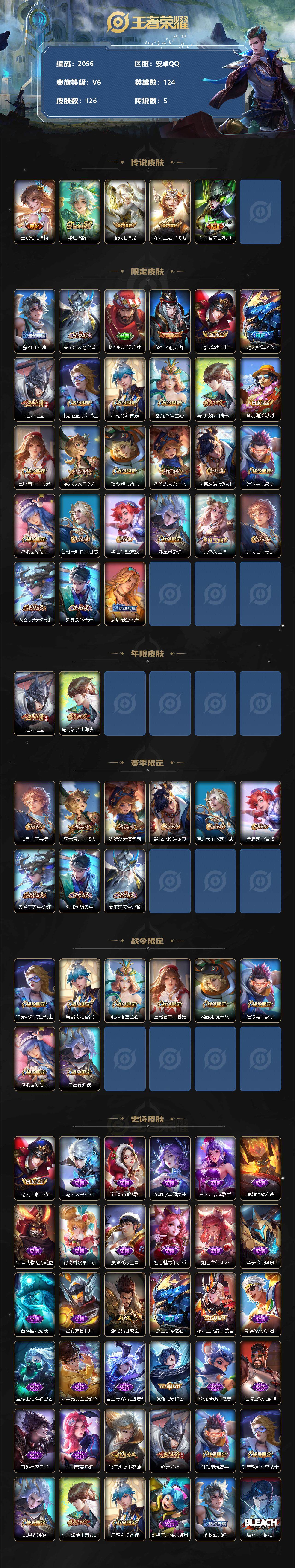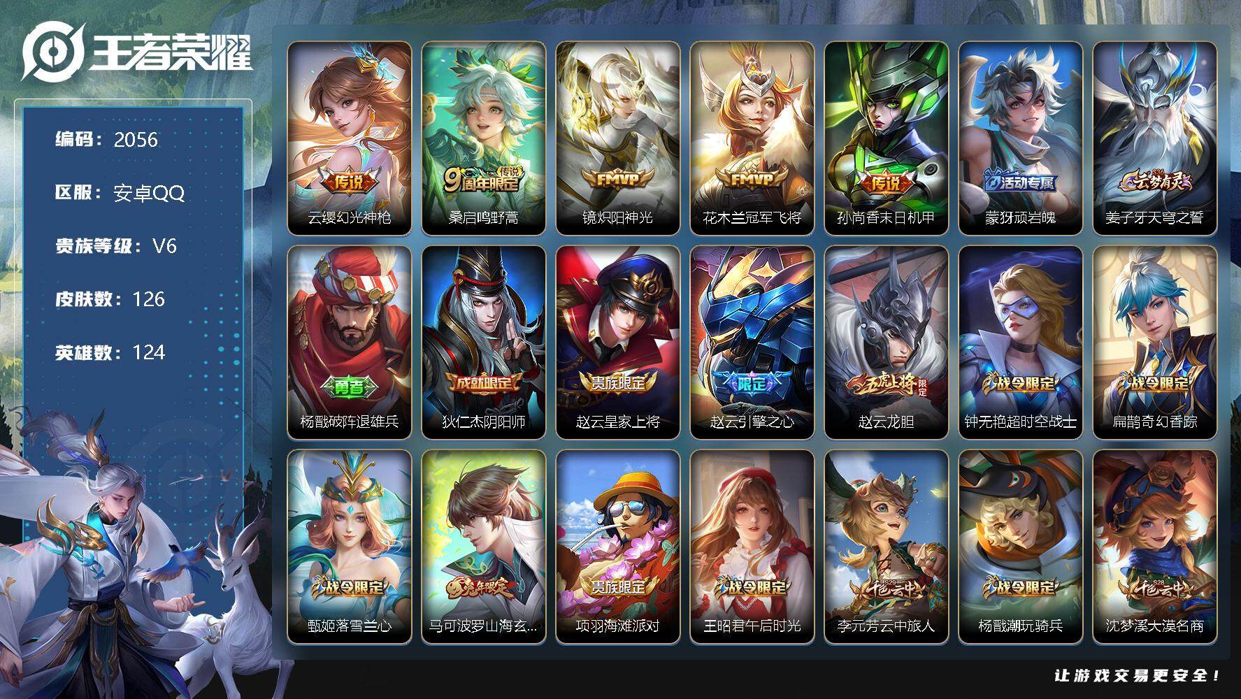 [12811036]安卓Q-V5-至尊星耀III段位-124英雄-126皮肤-0典藏-0珍品无双-0无双-0珍品传说-5传说-38史诗 【传说皮肤】:云缨幻光神枪,桑启鸣野蒿,镜炽阳神光,花木兰冠军飞将,孙尚香末日机甲 【限定皮肤】:蒙犽顽岩魄,姜子牙天穹之誓,杨戬破阵退雄兵,狄仁杰阴阳师,赵云皇家上将,赵云引擎之心,赵云龙胆,钟无艳超时空战士,扁鹊奇幻香踪,甄姬落雪兰心,马可波罗山海玄木吟,项羽海滩派对,王昭君午后时光,李元芳云中旅人,杨戬潮玩骑兵,沈梦溪大漠名商,裴擒虎擒涛扼浪,狂铁电玩高手,嫦娥暖冬兔眠,鲁班大师探海日志,桑启海盐诗旅,暃星界游侠,艾琳女武神,张良古海寻踪,鬼谷子天穹祈灯,刘邦剑破天穹,周瑜熔金海岸 【年限皮肤】:赵云龙胆,马可波罗山海玄木吟 【赛季限定】:张良古海寻踪,李元芳云中旅人,沈梦溪大漠名商,裴擒虎擒涛扼浪,鲁班大师探海日志,桑启海盐诗旅,鬼谷子天穹祈灯,刘邦剑破天穹,姜子牙天穹之誓 【战令限定】:钟无艳超时空战士,扁鹊奇幻香踪,甄姬落雪兰心,王昭君午后时光,杨戬潮玩骑兵,狂铁电玩高手,嫦娥暖冬兔眠,暃星界游侠 【史诗皮肤】:赵云皇家上将,赵云未来纪元,貂蝉圣诞恋歌,甄姬冰雪圆舞曲,王昭君偶像歌手,廉颇地狱岩魂,宫本武藏鬼剑武藏,孙尚香水果甜心,嬴政摇滚巨星,妲己魅力维加斯,妲己女仆咖啡,墨子金属风暴,曹操幽灵船长,吕布末日机甲,张飞乱世虎臣,赵云引擎之心,花木兰水晶猎龙者,夏侯惇乘风破浪,兰陵王暗隐猎兽者,诸葛亮黄金分割率,百里守约特工魅影,铠曙光守护者,李元芳逐浪之夏,程咬金功夫厨神,白起星夜王子,阿轲节奏热浪,狄仁杰鹰眼统帅,赵云龙胆,狂铁电玩高手,钟无艳超时空战士,暃星界游侠,马可波罗山海玄木吟,扁鹊奇幻香踪,刘禅电玩爆裂旋风,蒙犽顽岩魄,后羿石田雨龙,黄忠百相守梦,公孙离涂山容容 【其他皮肤】:项羽海滩派对,韩信教廷特使,韩信街头霸王,赵云忍炎影,艾琳女武神,白起白色死神,牛魔西部大镖客,扁鹊化身博士,扁鹊救世之瞳,宫本武藏未来纪元,安琪拉玩偶对对碰,孙膑天使之翼,妲己少女阿狸,典韦黄金武士,亚瑟死亡骑士,达摩拳王,花木兰兔女郎,狄仁杰阴阳师,刘备纽约教父,关羽龙腾万里,钟无艳海滩丽影,狂铁命运角斗场,老夫子功夫老勺,孙尚香沉稳之力,鬼谷子幻乐之宴,明世隐虹云星官,小乔丁香结,哪吒次元突破,鲁班大师乓乓大师,典韦铁甲之心,程咬金无双福将,王昭