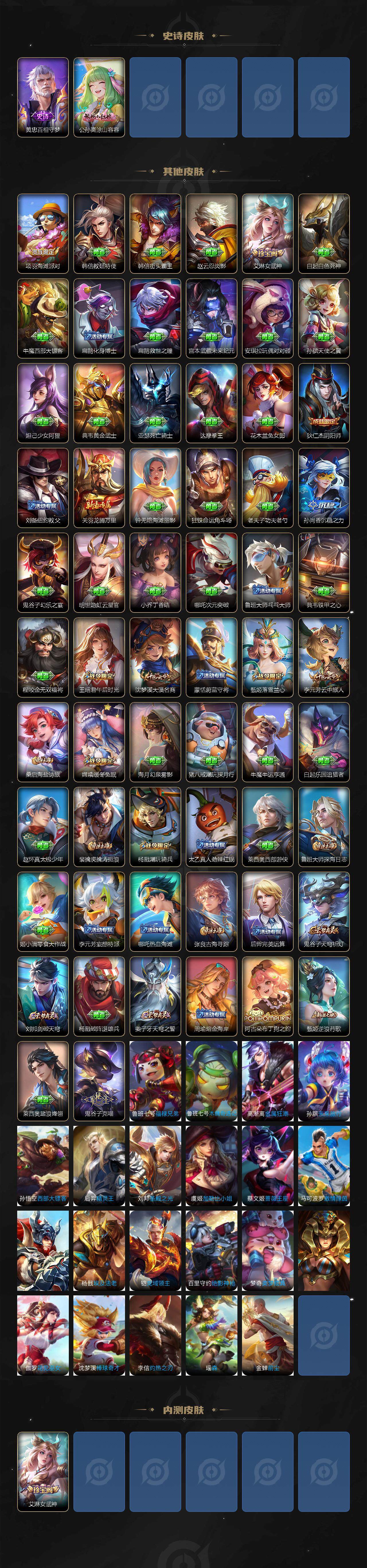 【史诗皮肤】:赵云皇家上将,赵云未来纪元,貂蝉圣诞恋歌,甄姬冰雪圆舞曲,王昭君偶像歌手,廉颇地狱岩魂,宫本武藏鬼剑武藏,孙尚香水果甜心,嬴政摇滚巨星,妲己魅力维加斯,妲己女仆咖啡,墨子金属风暴,曹操幽灵船长,吕布末日机甲,张飞乱世虎臣,赵云引擎之心,花木兰水晶猎龙者,夏侯惇乘风破浪,兰陵王暗隐猎兽者,诸葛亮黄金分割率,百里守约特工魅影,铠曙光守护者,李元芳逐浪之夏,程咬金功夫厨神,白起星夜王子,阿轲节奏热浪,狄仁杰鹰眼统帅,赵云龙胆,狂铁电玩高手,钟无艳超时空战士,暃星界游侠,马可波罗山海玄木吟,扁鹊奇幻香踪,刘禅电玩爆裂旋风,蒙犽顽岩魄,后羿石田雨龙,黄忠百相守梦,公孙离涂山容容