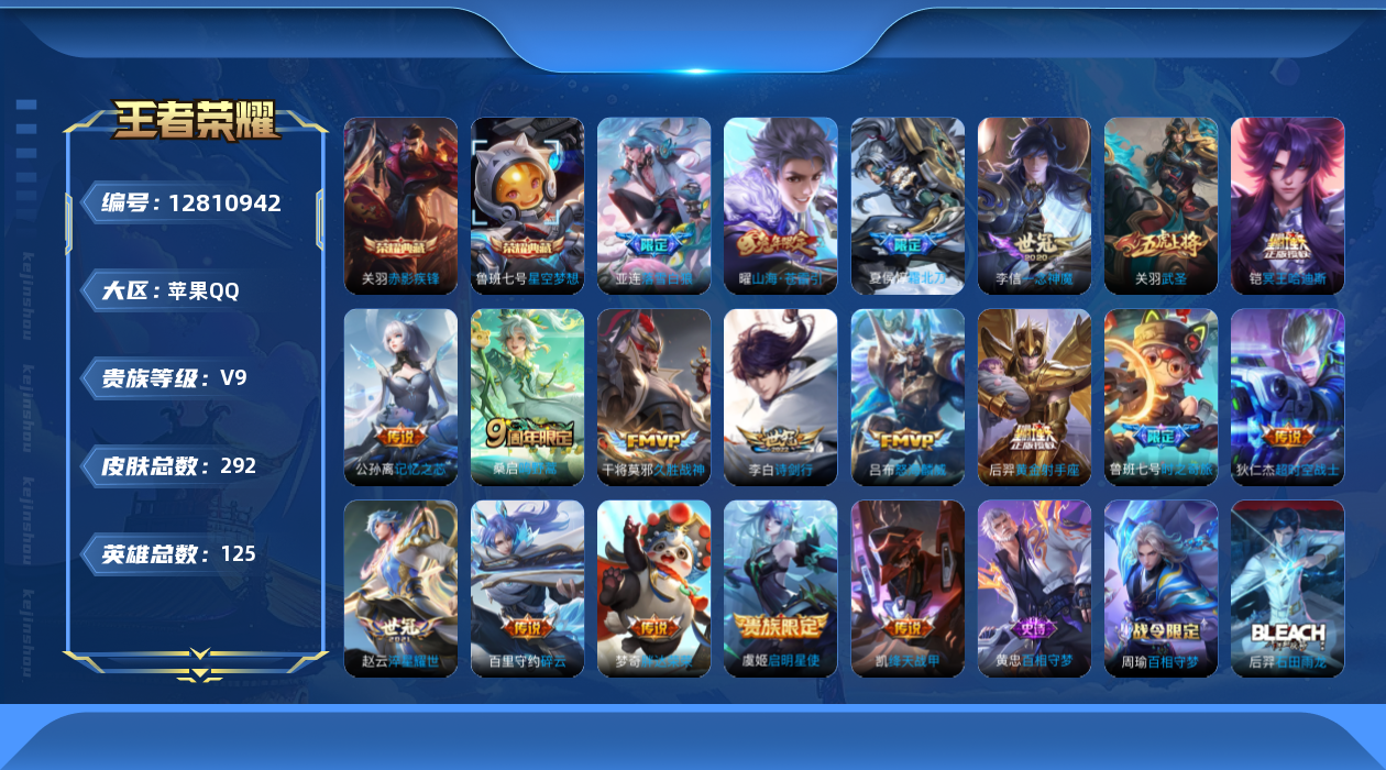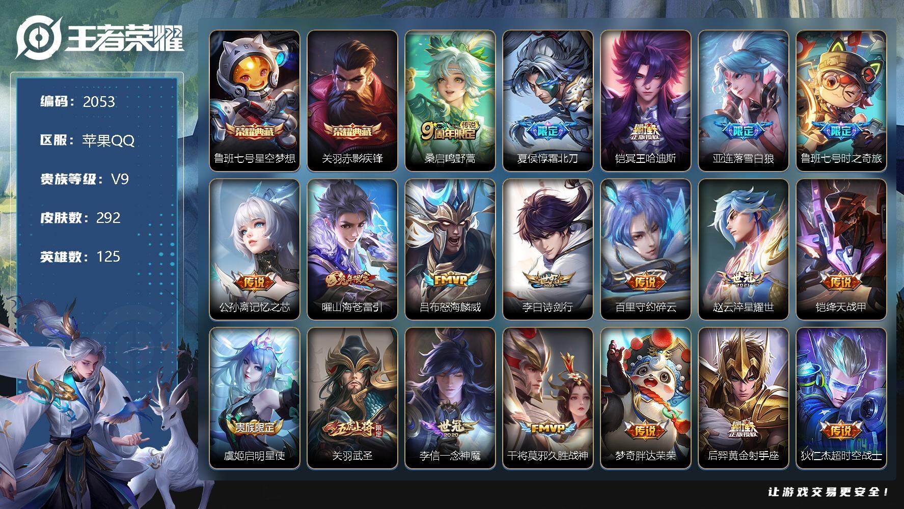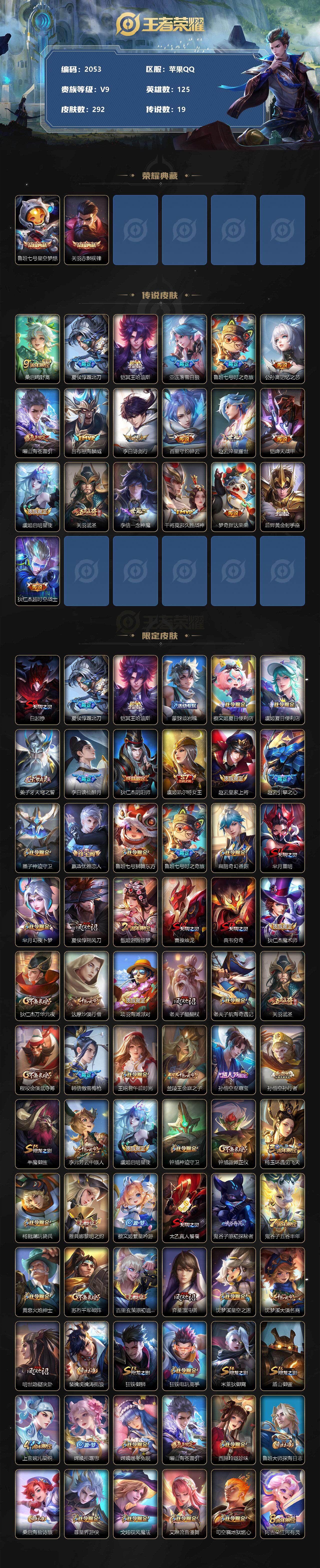 [12810942]苹果Q-V9-永恒钻石III段位-125英雄-292皮肤-2典藏-0珍品无双-0无双-0珍品传说-19传说-78史诗 【荣耀典藏】:鲁班七号星空梦想,关羽赤影疾锋 【传说皮肤】:桑启鸣野蒿,夏侯惇霜北刀,铠冥王哈迪斯,亚连落雪白狼,鲁班七号时之奇旅,公孙离记忆之芯,曜山海苍雷引,吕布怒海麟威,李白诗剑行,百里守约碎云,赵云淬星耀世,铠绛天战甲,虞姬启明星使,关羽武圣,李信一念神魔,干将莫邪久胜战神,梦奇胖达荣荣,后羿黄金射手座,狄仁杰超时空战士 【限定皮肤】:白起狰,夏侯惇霜北刀,铠冥王哈迪斯,蒙犽顽岩魄,蔡文姬夏日便利店,虞姬夏日便利店,姜子牙天穹之誓,李白谪仙醉月,狄仁杰阴阳师,虞姬凯尔特女王,赵云皇家上将,赵云引擎之心,墨子神迹守卫,嬴政优雅恋人,鲁班七号狮舞东方,鲁班七号时之奇旅,扁鹊奇幻香踪,芈月重明,芈月幻夜卜梦,夏侯惇朔风刀,甄姬游园惊梦,曹操烛龙,典韦穷奇,狄仁杰魔术师,狄仁杰万华元夜,达摩沙漠行僧,项羽海滩派对,老夫子醍醐杖,老夫子航海奇遇记,关羽武圣,程咬金演武夺筹,韩信傲雪梅枪,王昭君午后时光,兰陵王金庭之子,孙悟空至尊宝,孙悟空孙行者,牛魔御旌,李元芳云中旅人,虞姬启明星使,钟馗神迹守卫,钟馗驱傩正仪,杨玉环遇见飞天,杨戬潮玩骑兵,雅典娜黎明之约,蔡文姬繁星吟游,太乙真人饕餮,鬼谷子原初探秘者,鬼谷子五谷丰年,黄忠火炮绅士,苏烈千军破阵,百里玄策原初追逐者,弈星混沌棋,沈梦溪星空之诺,沈梦溪大漠名商,明世隐疑决卦,裴擒虎擒涛扼浪,狂铁御狮,狂铁电玩高手,米莱狄御霄,盾山御銮,上官婉儿梁祝,嫦娥拒霜思,嫦娥暖冬兔眠,曜山海苍雷引,西施玲珑珍味,鲁班大师探海日志,桑启海盐诗旅,暃星界游侠,戈娅驭风魔法,艾琳流音漫舞,司空震地狱燃心,阿古朵江河有灵,张良古海寻踪,蒙犽百解令,高渐离燃音魔法,妲己灵卜魔法,鬼谷子天穹祈灯,姬小满妄想食味,亚连落雪白狼,鲁班七号蔬乡物语,李元芳蔬乡物语,刘邦剑破天穹 【年限皮肤】:关羽武圣,曜山海苍雷引 【赛季限定】:白起狰,芈月重明,夏侯惇朔风刀,曹操烛龙,典韦穷奇,狄仁杰万华元夜,达摩沙漠行僧,老夫子醍醐杖,程咬金演武夺筹,兰陵王金庭之子,张良古海寻踪,牛魔御旌,李元芳云中旅人,虞姬凯尔特女王,钟馗驱傩正仪,雅典娜黎明之约,太乙真人饕餮,鬼谷子原初探秘者,苏烈千军破阵,百里玄策原初追逐者,弈星混沌棋,沈梦溪大漠名