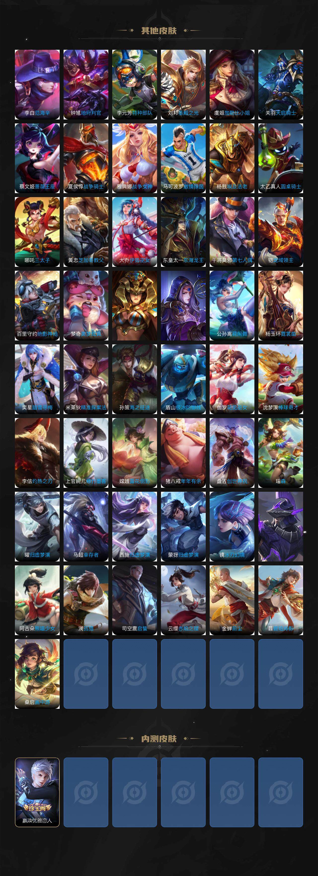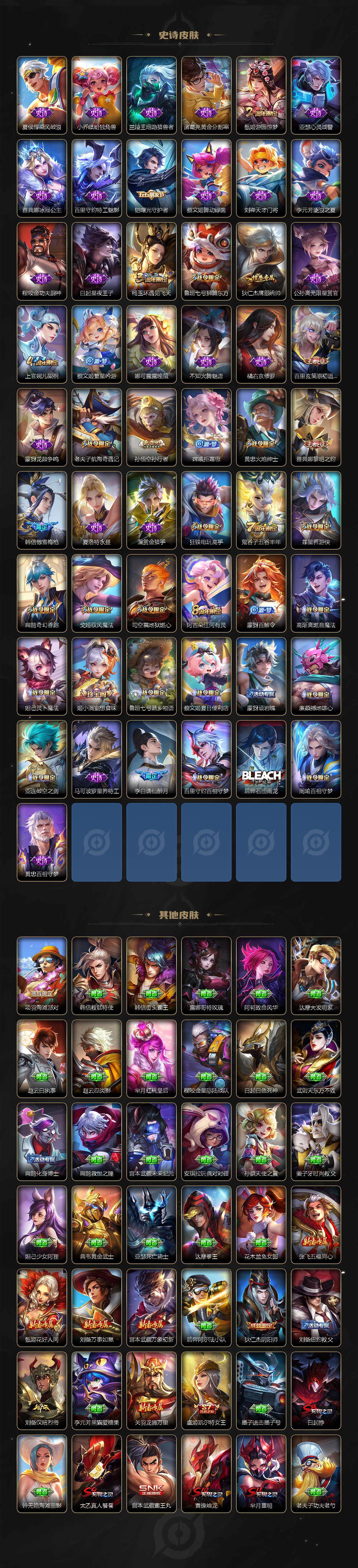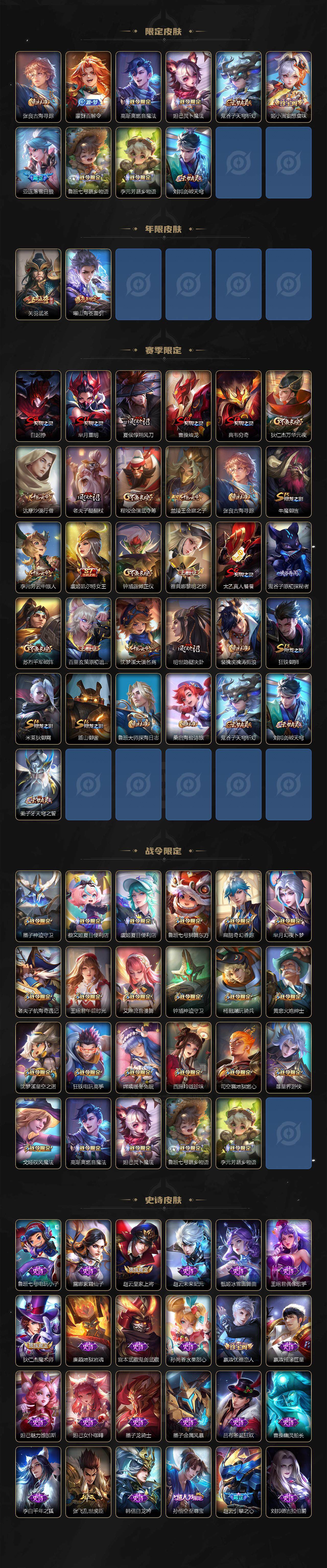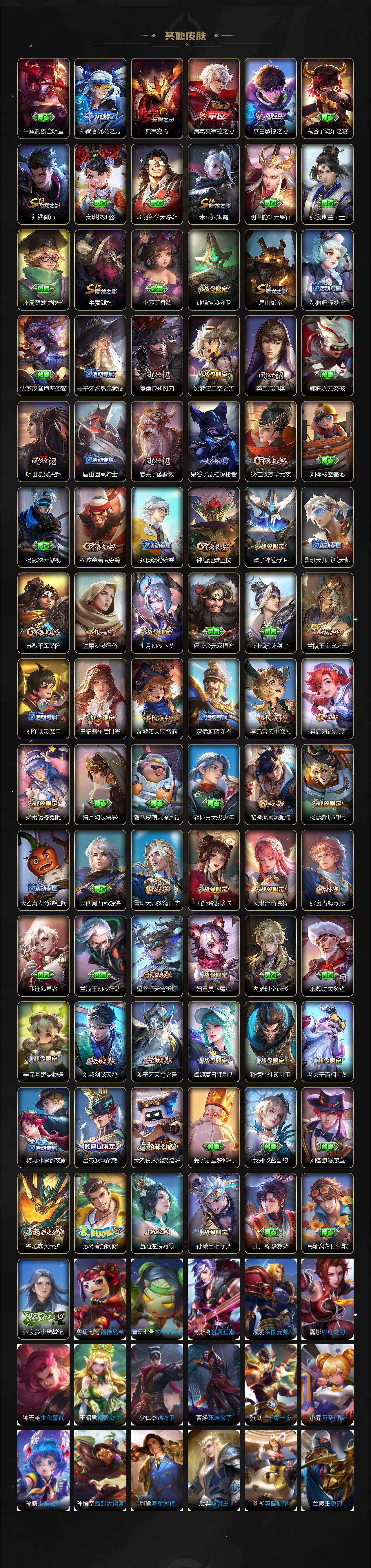 【限定皮肤】:白起狰,夏侯惇霜北刀,铠冥王哈迪斯,蒙犽顽岩魄,蔡文姬夏日便利店,虞姬夏日便利店,姜子牙天穹之誓,李白谪仙醉月,狄仁杰阴阳师,虞姬凯尔特女王,赵云皇家上将,赵云引擎之心,墨子神迹守卫,嬴政优雅恋人,鲁班七号狮舞东方,鲁班七号时之奇旅,扁鹊奇幻香踪,芈月重明,芈月幻夜卜梦,夏侯惇朔风刀,甄姬游园惊梦,曹操烛龙,典韦穷奇,狄仁杰魔术师,狄仁杰万华元夜,达摩沙漠行僧,项羽海滩派对,老夫子醍醐杖,老夫子航海奇遇记,关羽武圣,程咬金演武夺筹,韩信傲雪梅枪,王昭君午后时光,兰陵王金庭之子,孙悟空至尊宝,孙悟空孙行者,牛魔御旌,李元芳云中旅人,虞姬启明星使,钟馗神迹守卫,钟馗驱傩正仪,杨玉环遇见飞天,杨戬潮玩骑兵,雅典娜黎明之约,蔡文姬繁星吟游,太乙真人饕餮,鬼谷子原初探秘者,鬼谷子五谷丰年,黄忠火炮绅士,苏烈千军破阵,百里玄策原初追逐者,弈星混沌棋,沈梦溪星空之诺,沈梦溪大漠名商,明世隐疑决卦,裴擒虎擒涛扼浪,狂铁御狮,狂铁电玩高手,米莱狄御霄,盾山御銮,上官婉儿梁祝,嫦娥拒霜思,嫦娥暖冬兔眠,曜山海苍雷引,西施玲珑珍味,鲁班大师探海日志,桑启海盐诗旅,暃星界游侠,戈娅驭风魔法,艾琳流音漫舞,司空震地狱燃心,阿古朵江河有灵,张良古海寻踪,蒙犽百解令,高渐离燃音魔法,妲己灵卜魔法,鬼谷子天穹祈灯,姬小满妄想食味,亚连落雪白狼,鲁班七号蔬乡物语,李元芳蔬乡物语,刘邦剑破天穹