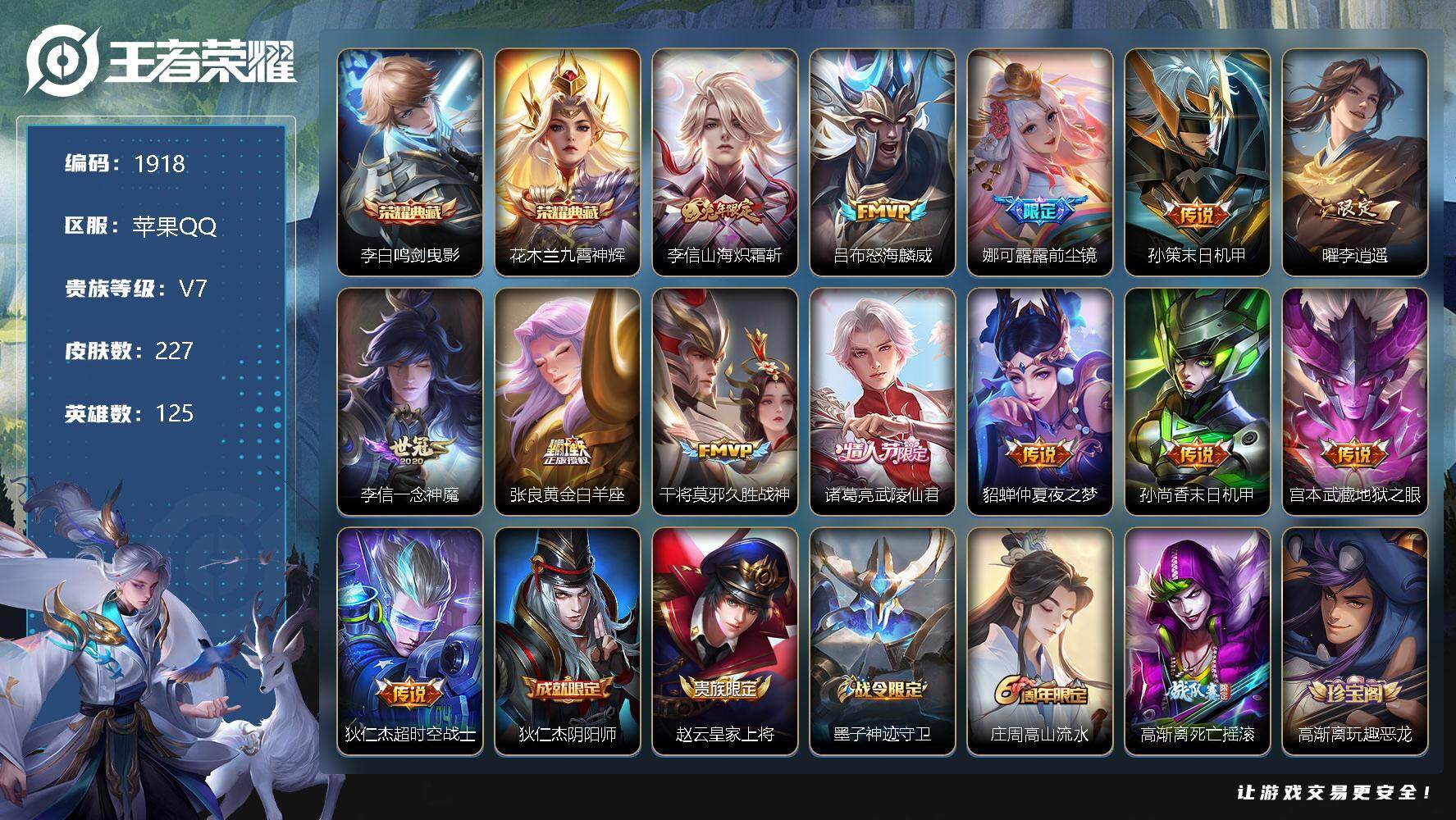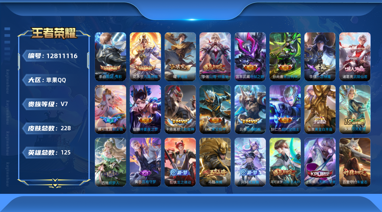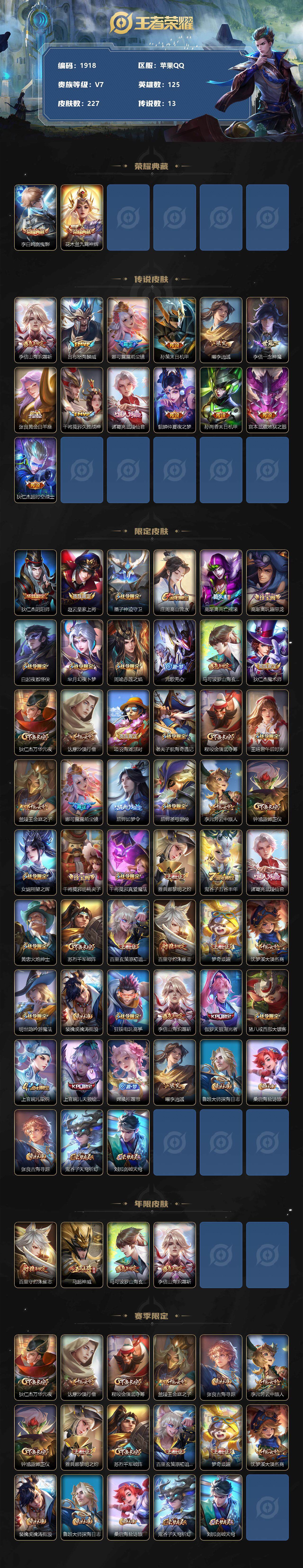 [12811116]苹果Q-V7-最强王者段位-125英雄-227皮肤-2典藏-0珍品无双-0无双-0珍品传说-13传说-61史诗