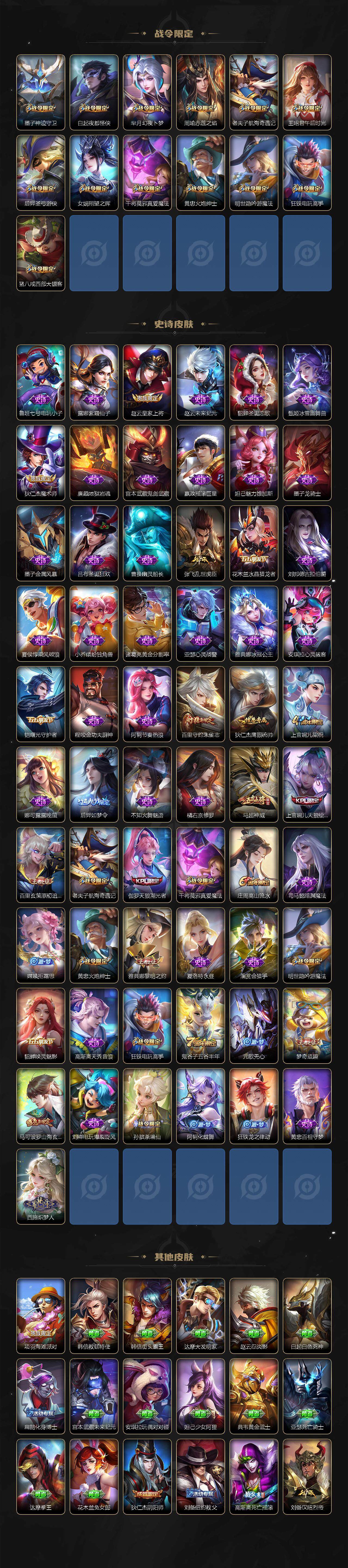 【限定皮肤】:狄仁杰阴阳师,赵云皇家上将,墨子神迹守卫,庄周高山流水,高渐离死亡摇滚,高渐离玩趣恶龙,白起夜都怪侠,芈月幻夜卜梦,周瑜赤莲之焰,元歌无心,马可波罗山海玄木吟,狄仁杰魔术师,狄仁杰万华元夜,达摩沙漠行僧,项羽海滩派对,老夫子航海奇遇记,程咬金演武夺筹,王昭君午后时光,兰陵王金庭之子,娜可露露前尘镜,后羿如梦令,后羿圣弓游侠,李元芳云中旅人,钟馗驱傩正仪,女娲朔望之晖,干将莫邪胡桃夹子,干将莫邪真爱魔法,雅典娜黎明之约,鬼谷子五谷丰年,诸葛亮武陵仙君,黄忠火炮绅士,苏烈千军破阵,百里玄策原初追逐者,百里守约朱雀志,梦奇顽趣,沈梦溪大漠名商,明世隐吟游魔法,裴擒虎擒涛扼浪,狂铁电玩高手,李信山海炽霜斩,伽罗天狼溯光者,猪八戒西部大镖客,上官婉儿梁祝,上官婉儿天狼绘梦者,嫦娥拒霜思,曜李逍遥 ,鲁班大师探海日志,桑启海盐诗旅,张良古海寻踪,鬼谷子天穹祈灯,刘邦剑破天穹
