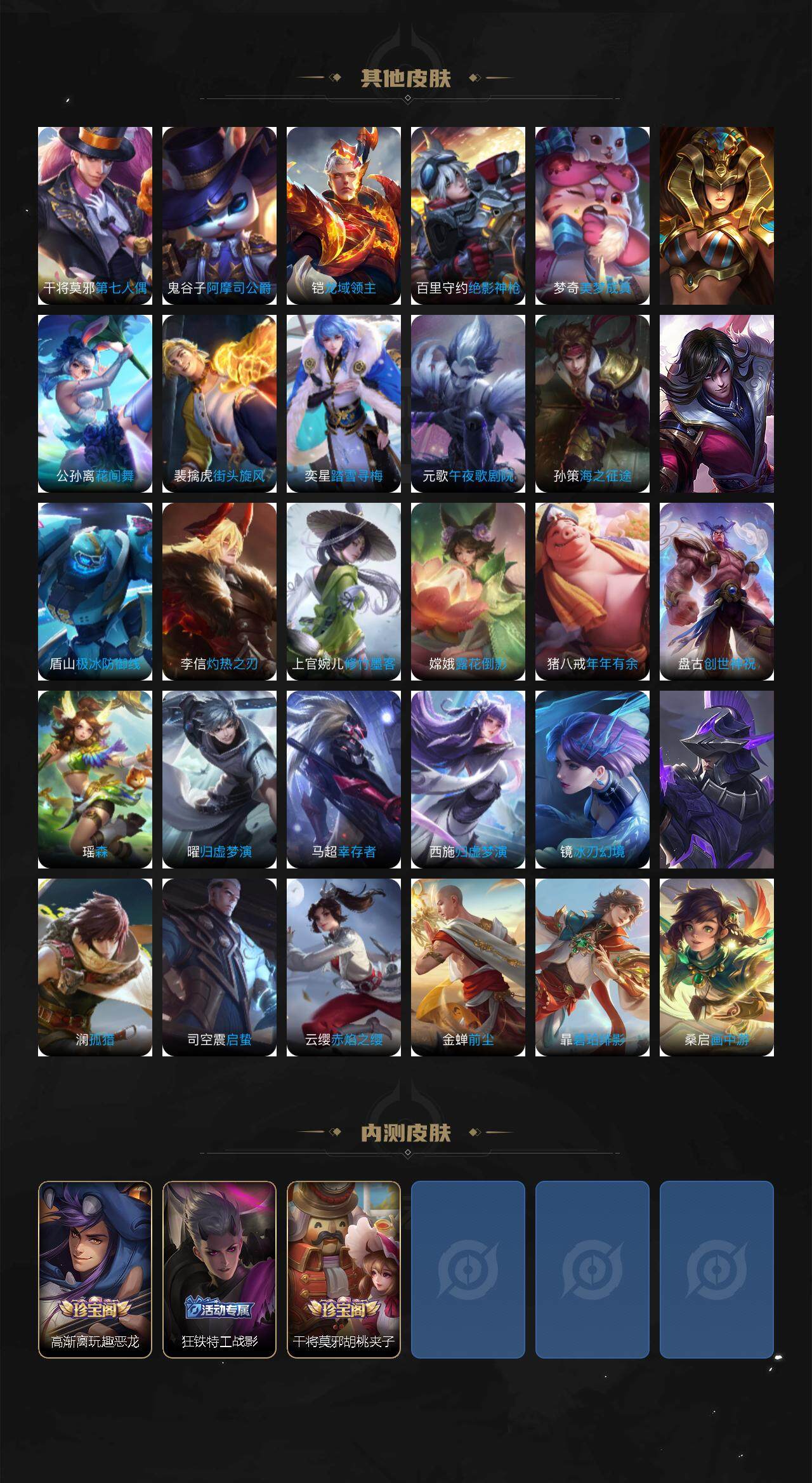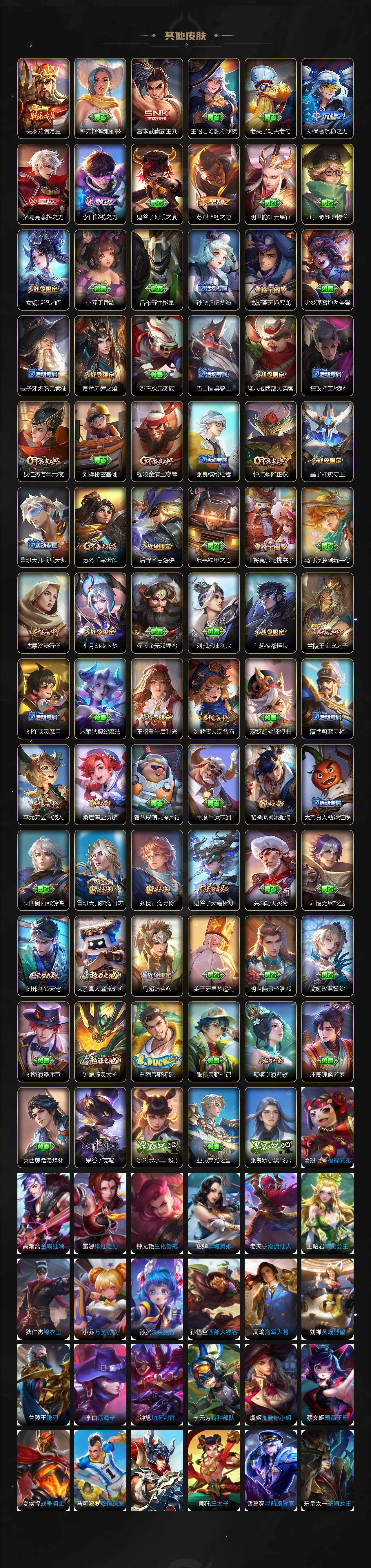 【赛季限定】:狄仁杰万华元夜,达摩沙漠行僧,程咬金演武夺筹,兰陵王金庭之子,张良古海寻踪,李元芳云中旅人,钟馗驱傩正仪,雅典娜黎明之约,苏烈千军破阵,百里玄策原初追逐者,梦奇顽趣,沈梦溪大漠名商,裴擒虎擒涛扼浪,鲁班大师探海日志,桑启海盐诗旅,鬼谷子天穹祈灯,刘邦剑破天穹