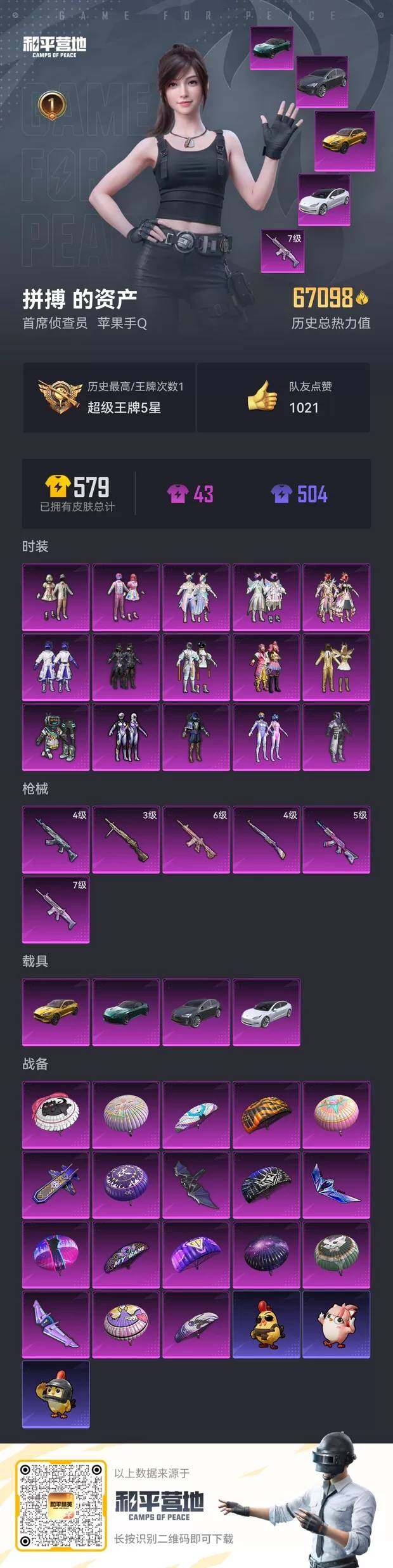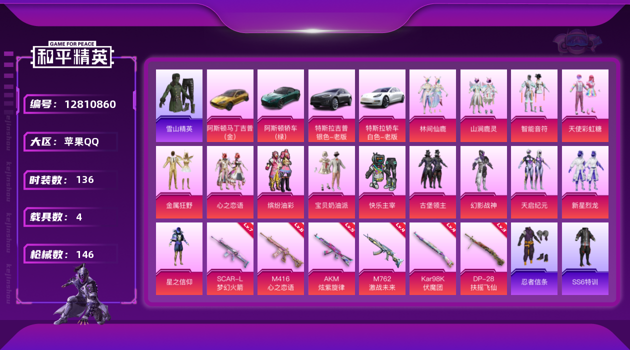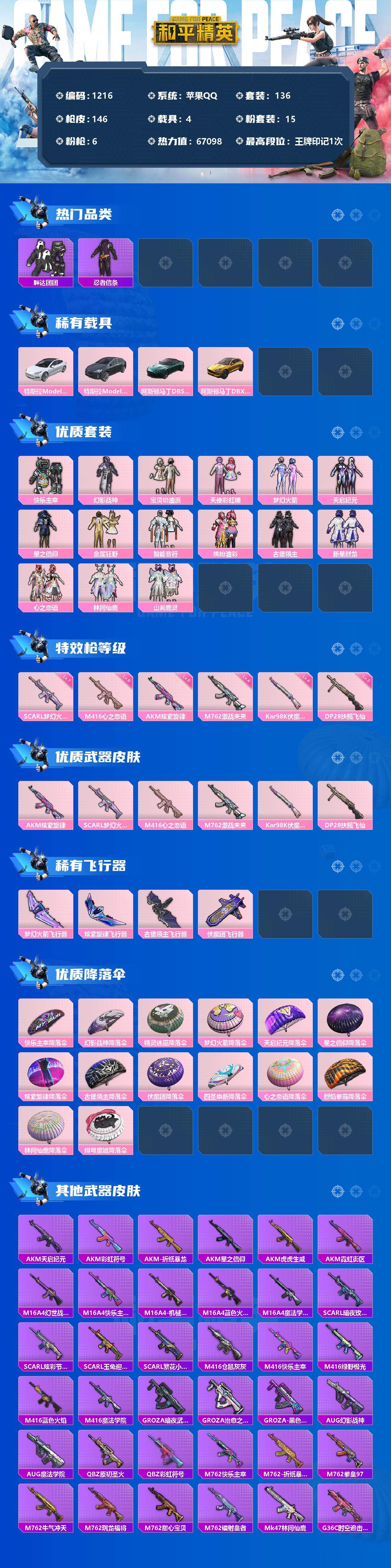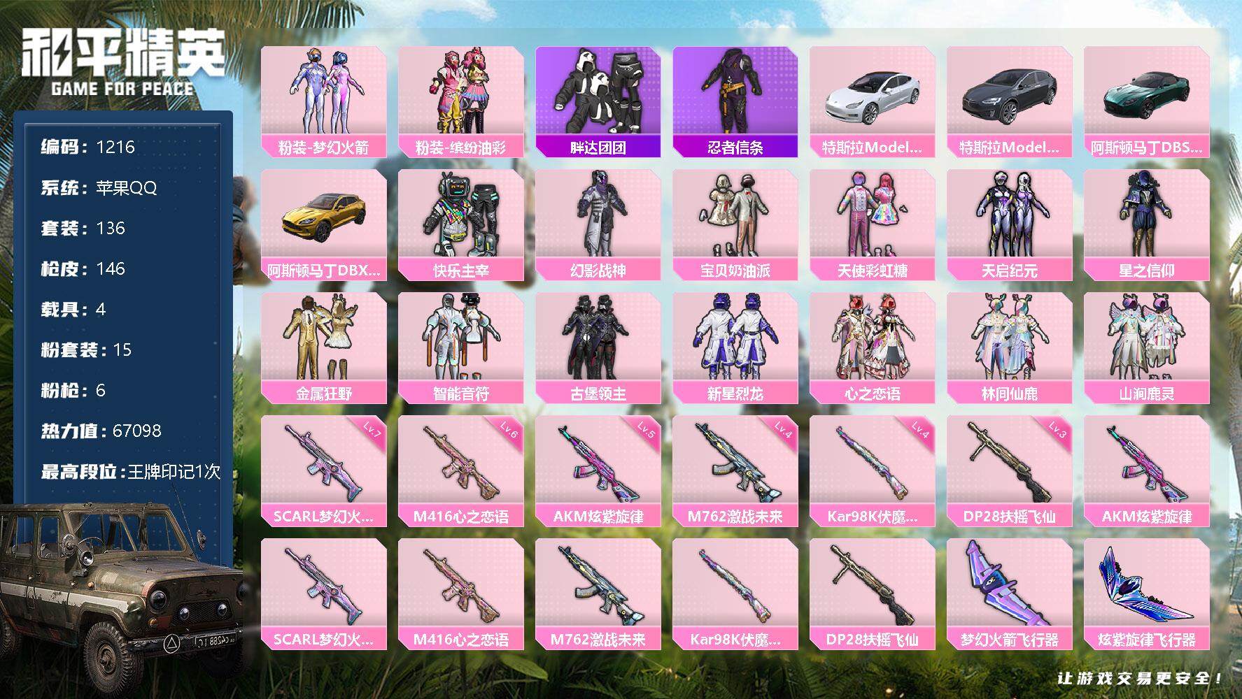[12810860]苹果 手Q-15粉装-6特效枪-4载具-4粉色飞行器-67098热力值-1王牌印记-136套装-146枪皮 【热门品类】:粉装-梦幻火箭,粉装-缤纷油彩,套装-胖达团团,套装-忍者信条 【粉色载具】:特斯拉Model 3(珍珠白),特斯拉Model X(冷光银),阿斯顿马丁DBS(绿),阿斯顿马丁DBX(金) 【粉色套装】:粉装-快乐主宰,粉装-幻影战神,粉装-宝贝奶油派,粉装-天使彩虹糖,粉装-梦幻火箭,粉装-天启纪元,粉装-星之信仰,粉装-金属狂野,粉装-智能音符,粉装-缤纷油彩,粉装-古堡领主,粉装-新星烈龙,粉装-心之恋语,粉装-林间仙鹿,粉装-山涧鹿灵 【粉色枪皮等级】:AKM-炫紫旋律(五级),SCAR-L-梦幻火箭(七级),M416-心之恋语(六级),M762-激战未来(四级),Kar98K-伏魔团(四级),DP-28-扶摇飞仙(三级) 【粉色枪皮】:AKM-炫紫旋律,SCAR-L-梦幻火箭,M416-心之恋语,M762-激战未来,Kar98K-伏魔团,DP-28-扶摇飞仙 【粉色飞行器】:梦幻火箭飞行器,炫紫旋律飞行器,古堡领主飞行器,伏魔团飞行器 【粉色降落伞】:快乐主宰降落伞,幻影战神降落伞,精灵迷巫降落伞,梦幻火箭降落伞,天启纪元降落伞,星之信仰降落伞,炫紫旋律降落伞,古堡领主降落伞,伏魔团降落伞,四圣焕新降落伞,心之恋语降落伞,烈焰拳霸降落伞,林间仙鹿降落伞,绯穹魔姬降落伞 【稀有枪皮】:AKM-天启纪元,AKM-彩虹符号,AKM-折纸暴龙,AKM-星之信仰,AKM-虎虎生威,AKM-霓虹街区,M16A4-幻世战舞者,M16A4-快乐主宰,M16A4-机械英豪,M16A4-蓝色火焰,M16A4-魔法学院,SCAR-L-暗夜玫瑰,SCAR-L-炫彩节奏,SCAR-L-玉兔迎春,SCAR-L-繁花小夜曲,M416-仓鼠灰灰,M416-快乐主宰,M416-绿野极光,M416-蓝色火焰,M416-魔法学院,GROZA-暗夜武装,GROZA-治愈之星,GROZA-黑色刀锋,AUG-幻影战神,AUG-魔法学院,QBZ-原初圣火,QBZ-彩虹符号,M762-快乐主宰,M762-折纸暴龙,M762-拳皇97,M762-牛气冲天,M762-瑞龙福将,M762-甜心宝贝,M762-镭射皇者,Mk47-林间仙鹿,G36C-时空追击者,UZI-古堡领主,UZI-幻