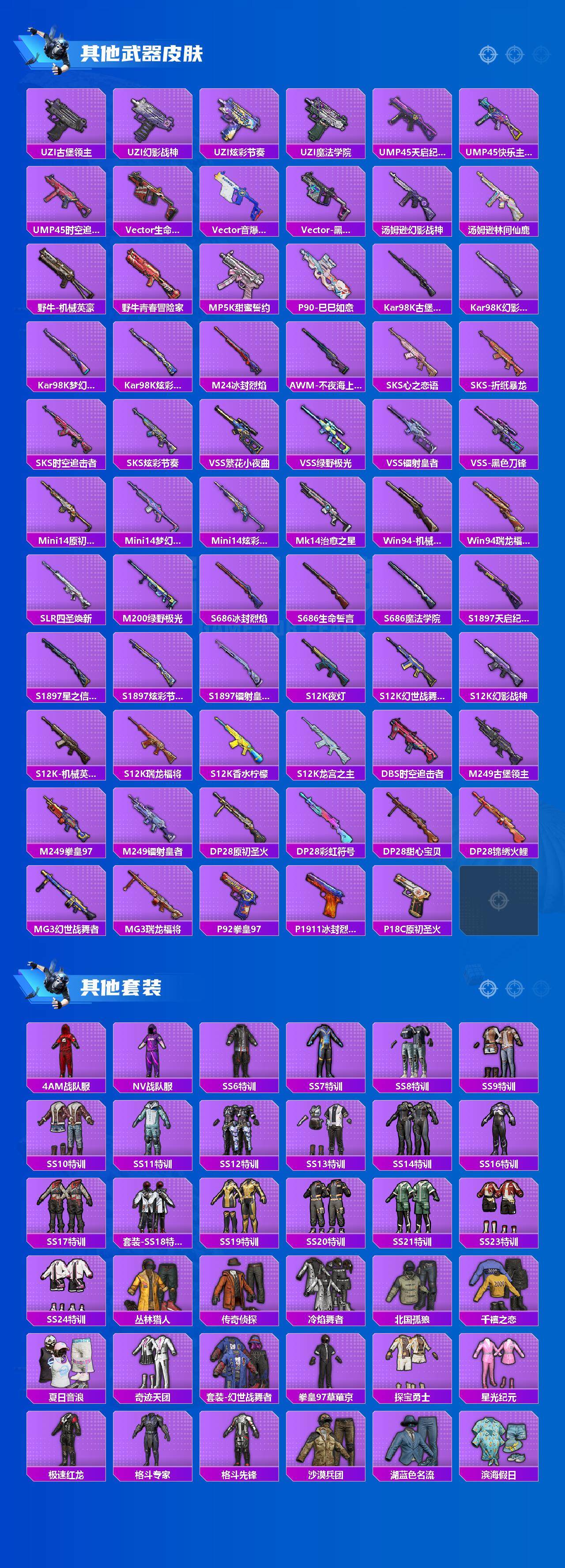 【稀有枪皮】:AKM-天启纪元,AKM-彩虹符号,AKM-折纸暴龙,AKM-星之信仰,AKM-虎虎生威,AKM-霓虹街区,M16A4-幻世战舞者,M16A4-快乐主宰,M16A4-机械英豪,M16A4-蓝色火焰,M16A4-魔法学院,SCAR-L-暗夜玫瑰,SCAR-L-炫彩节奏,SCAR-L-玉兔迎春,SCAR-L-繁花小夜曲,M416-仓鼠灰灰,M416-快乐主宰,M416-绿野极光,M416-蓝色火焰,M416-魔法学院,GROZA-暗夜武装,GROZA-治愈之星,GROZA-黑色刀锋,AUG-幻影战神,AUG-魔法学院,QBZ-原初圣火,QBZ-彩虹符号,M762-快乐主宰,M762-折纸暴龙,M762-拳皇97,M762-牛气冲天,M762-瑞龙福将,M762-甜心宝贝,M762-镭射皇者,Mk47-林间仙鹿,G36C-时空追击者,UZI-古堡领主,UZI-幻