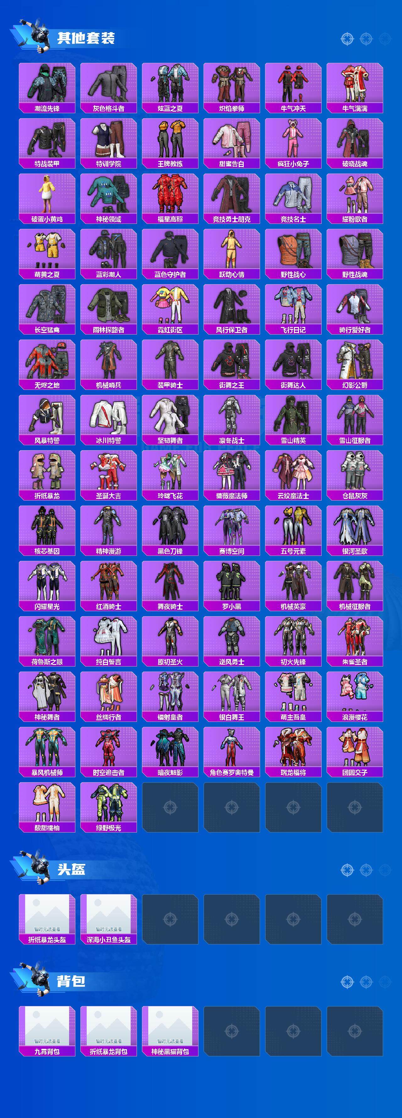 忍者信条套装,套装-极速红龙,套装-破蛋小黄鸡,套装-雪山精英,套装-折纸暴龙,套装-黑色刀锋,赛博空间套装,套装-机械英豪,套装-纯白誓言,套装-朱雀圣者,角色-赛罗奥特曼,套装-瑞龙福将,套装-团圆交子