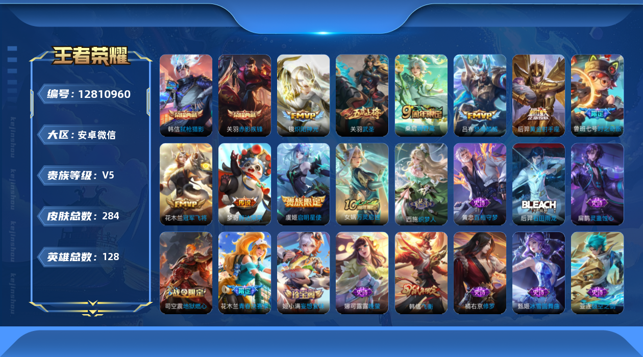 [12810960]安卓WX-V5-最强王者段位-126英雄-279皮肤-2典藏-0珍品无双-0无双-0珍品传说-9传说-72史诗