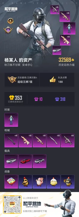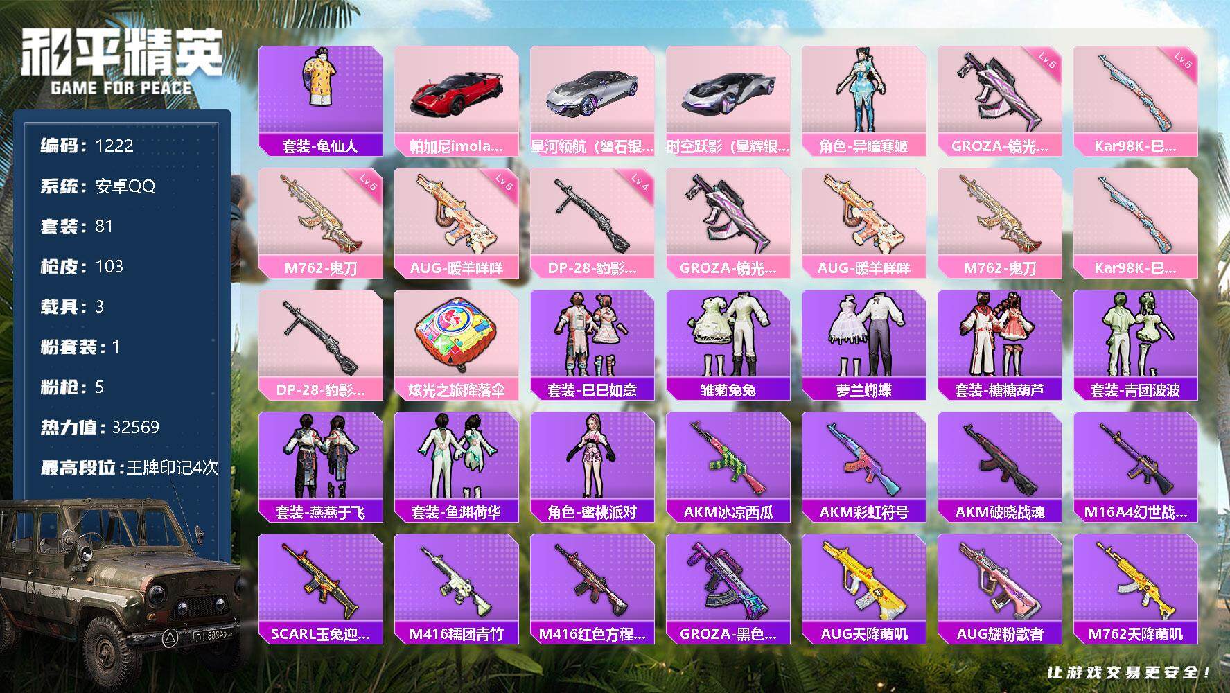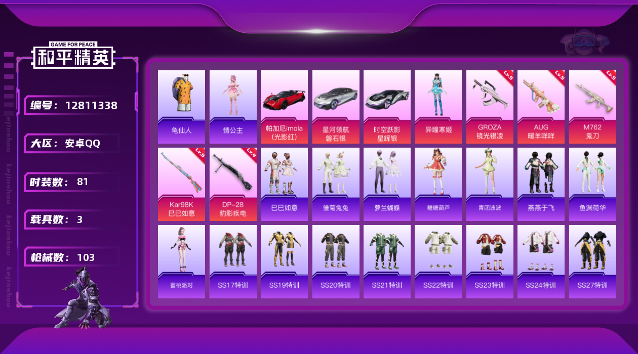 [12811338]安卓 手Q-1粉装-5特效枪-3载具-0粉色飞行器-32569热力值-4王牌印记-81套装-103枪皮