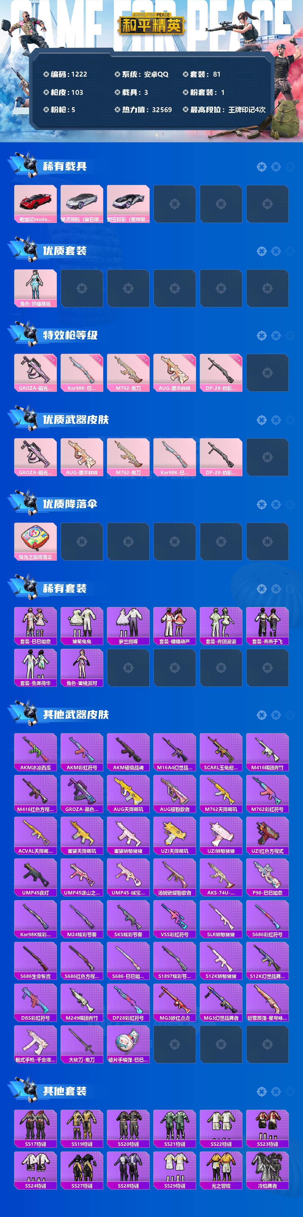 [12811338]安卓 手Q-1粉装-5特效枪-3载具-0粉色飞行器-32569热力值-4王牌印记-81套装-103枪皮 【热门品类】:套装-龟仙人 【粉色载具】:帕加尼imola(光影红),星河领航(磐石银),时空跃影(星辉银) 【粉色套装】:角色-异瞳寒姬 【粉色枪皮等级】:GROZA-镜光银凌(五级),AUG-暖羊咩咩(五级),M762-鬼刀(五级),Kar98K-巳巳如意(五级),DP-28-豹影疾电(四级) 【粉色枪皮】:GROZA-镜光银凌,AUG-暖羊咩咩,M762-鬼刀,Kar98K-巳巳如意,DP-28-豹影疾电 【粉色降落伞】:炫光之旅降落伞 【稀有套装】:套装-龟仙人,套装-巳巳如意,套装-雏菊兔兔,套装-萝兰蝴蝶,套装-糖糖葫芦,套装-青团波波,套装-燕燕于飞,套装-鱼渊荷华,角色-蜜桃派对 【稀有枪皮】:AKM-冰凉西瓜,AKM-彩虹符号,AKM-破晓战魂,M16A4-幻世战舞者,SCAR-L-玉兔迎春,M416-糯团青竹,M416-红色方程式,GROZA-黑色刀锋,AUG-天降萌叽,AUG-耀粉歌者,M762-天降萌叽,M762-彩虹符号,AC-VAL-天降萌叽,蜜獾-天降萌叽,蜜獾-娇憨猪猪,UZI-天降萌叽,UZI-娇憨猪猪,UZI-红色方程式,UMP45-夜灯,UMP45-涂山之恋,UMP45-绒宝小鹅,汤姆逊-耀粉歌者,AKS-74U-鬼刀,P90-巳巳如意,Kar98K-炫彩节奏,M24-炫彩节奏,SKS-炫彩节奏,VSS-彩虹符号,SLR-娇憨猪猪,S686-彩虹符号,S686-生命誓言,S686-红色方程式,S686-巳巳如意,S1897-炫彩节奏,S12K-娇憨猪猪,S12K-幻世战舞者,DBS-彩虹符号,M249-糯团青竹,DP-28-彩虹符号,MG3-妙红点点,MG3-幻世战舞者,短管霰弹-星穹咏叹调,蝎式手枪-千金淑猫,大砍刀-鬼刀,破片手榴弹-巳巳如意 【其他套装】:套装-SS17特训,套装-SS19特训,套装-SS20特训,套装-SS21特训,套装-SS22特训,套装-SS23特训,套装-SS24特训,套装-SS27特训,套装-SS28特训,套装-SS29特训,套装-光之冒险,套装-冷焰舞者,套装-完美偶像,套装-幻世战舞者,套装-柠萌假日,套装-森林游猎者,套装-海岛探路者,套装-涂山之恋,套装-湖蓝色名流,套装-滨海厨神,套