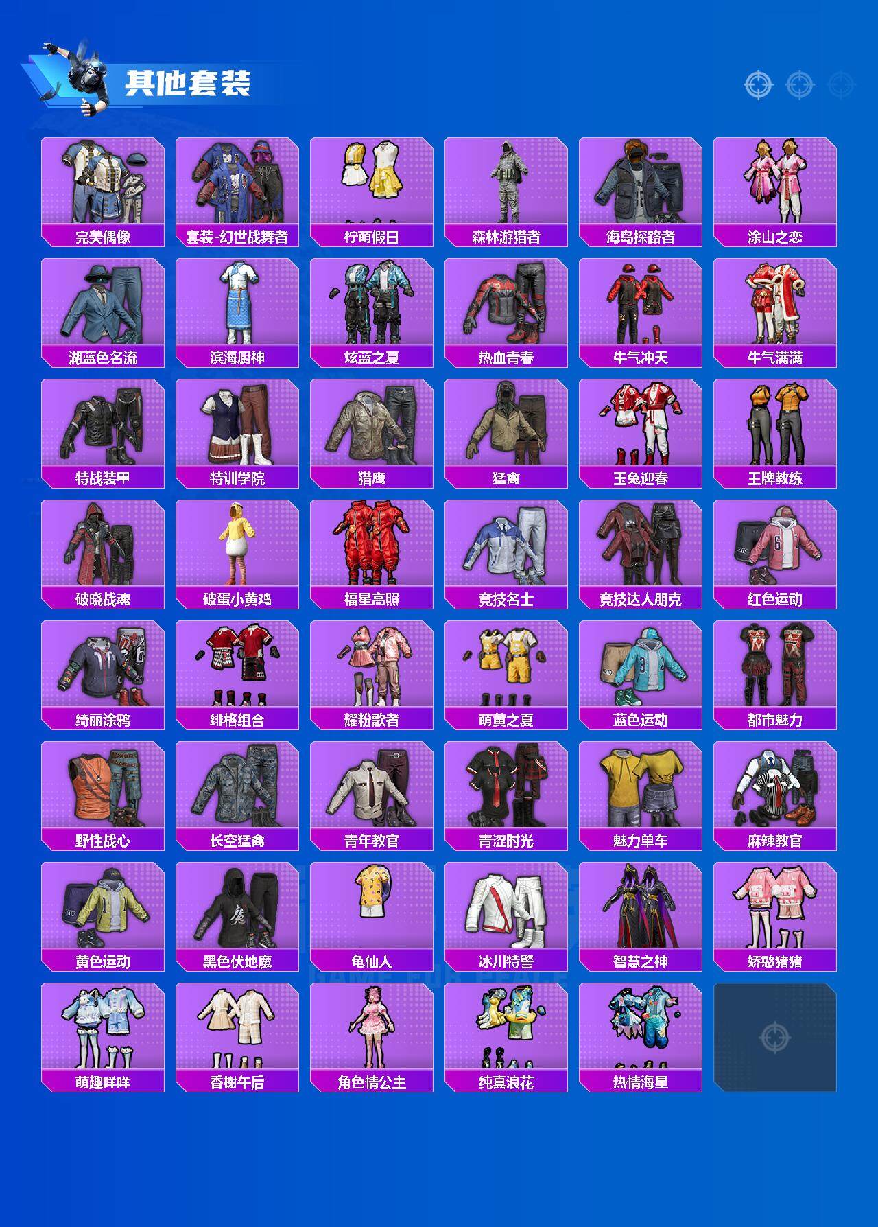 【其他套装】:套装-SS17特训,套装-SS19特训,套装-SS20特训,套装-SS21特训,套装-SS22特训,套装-SS23特训,套装-SS24特训,套装-SS27特训,套装-SS28特训,套装-SS29特训,套装-光之冒险,套装-冷焰舞者,套装-完美偶像,套装-幻世战舞者,套装-柠萌假日,套装-森林游猎者,套装-海岛探路者,套装-涂山之恋,套装-湖蓝色名流,套装-滨海厨神,套