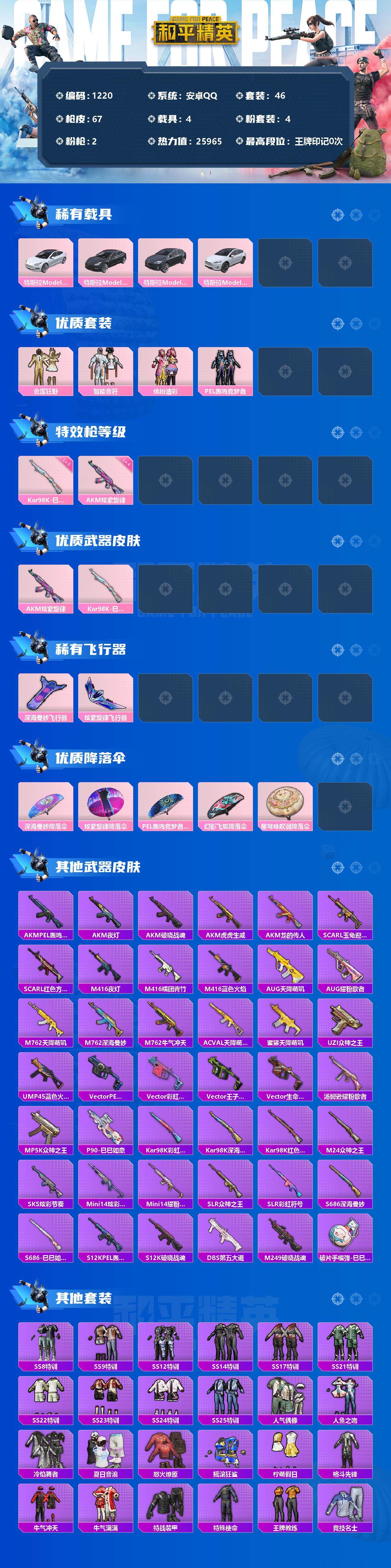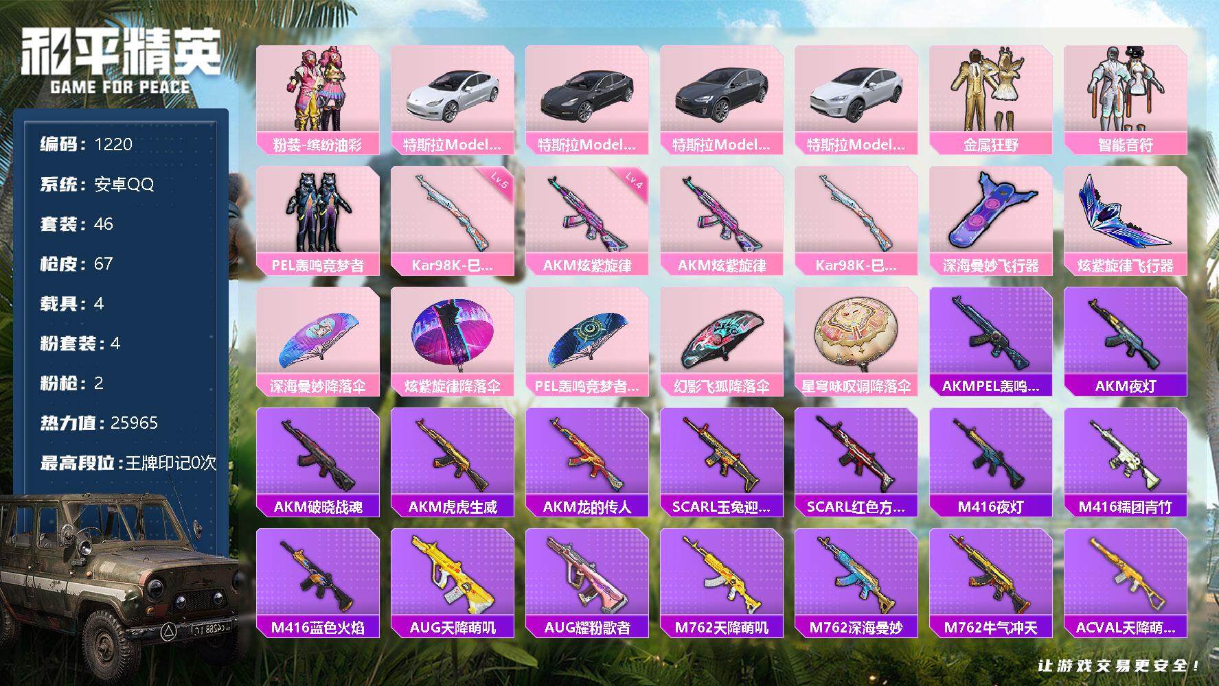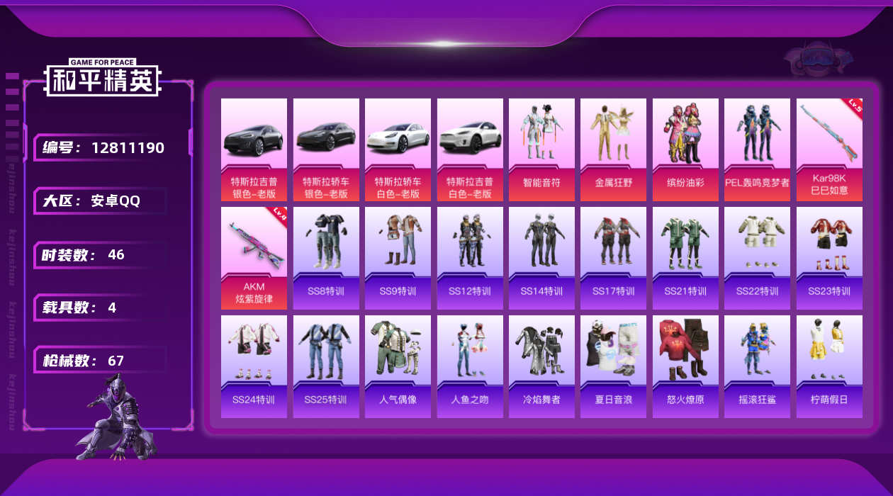 [12811190]安卓 手Q-4粉装-2特效枪-4载具-2粉色飞行器-25965热力值-1王牌印记-46套装-67枪皮 【热门品类】:粉装-缤纷油彩 【粉色载具】:特斯拉Model 3(珍珠白),特斯拉Model 3(冷光银),特斯拉Model X(冷光银),特斯拉Model X(珍珠白) 【粉色套装】:粉装-金属狂野,粉装-智能音符,粉装-缤纷油彩,粉装-PEL轰鸣竞梦者 【粉色枪皮等级】:AKM-炫紫旋律(四级),Kar98K-巳巳如意(五级) 【粉色枪皮】:AKM-炫紫旋律,Kar98K-巳巳如意 【粉色飞行器】:深海曼妙飞行器,炫紫旋律飞行器 【粉色降落伞】:深海曼妙降落伞,炫紫旋律降落伞,PEL轰鸣竞梦者降落伞,幻影飞狐降落伞,星穹咏叹调降落伞 【稀有枪皮】:AKM-PEL轰鸣竞梦者,AKM-夜灯,AKM-破晓战魂,AKM-虎虎生威,AKM-龙的传人,SCAR-L-玉兔迎春,SCAR-L-红色方程式,M416-夜灯,M416-糯团青竹,M416-蓝色火焰,AUG-天降萌叽,AUG-耀粉歌者,M762-天降萌叽,M762-深海曼妙,M762-牛气冲天,AC-VAL-天降萌叽,蜜獾-天降萌叽,UZI-众神之王,UMP45-蓝色火焰,Vector-PEL轰鸣竞梦者,Vector-彩虹符号,Vector-王子的夏天,Vector-生命誓言,汤姆逊-耀粉歌者,MP5K-众神之王,P90-巳巳如意,Kar98K-彩虹符号,Kar98K-深海曼妙,Kar98K-红色方程式,M24-众神之王,SKS-炫彩节奏,Mini14-炫彩节奏,Mini14-耀粉歌者,SLR-众神之王,SLR-彩虹符号,S686-深海曼妙,S686-巳巳如意,S12K-破晓战魂,S12K-PEL轰鸣竞梦者,DBS-第五大道,M249-破晓战魂,破片手榴弹-巳巳如意 【其他套装】:套装-SS8特训,套装-SS9特训,套装-SS12特训,套装-SS14特训,套装-SS17特训,套装-SS21特训,套装-SS22特训,套装-SS23特训,套装-SS24特训,套装-SS25特训,套装-人气偶像,套装-人鱼之吻,套装-冷焰舞者,套装-夏日音浪,套装-怒火燎原,套装-摇滚狂鲨,套装-柠萌假日,套装-格斗先锋,套装-牛气冲天,套装-牛气满满,套装-特战装甲,套装-特殊使命,套装-王牌教练,套装-竞技名士,套装-缤纷果语,套装-萌