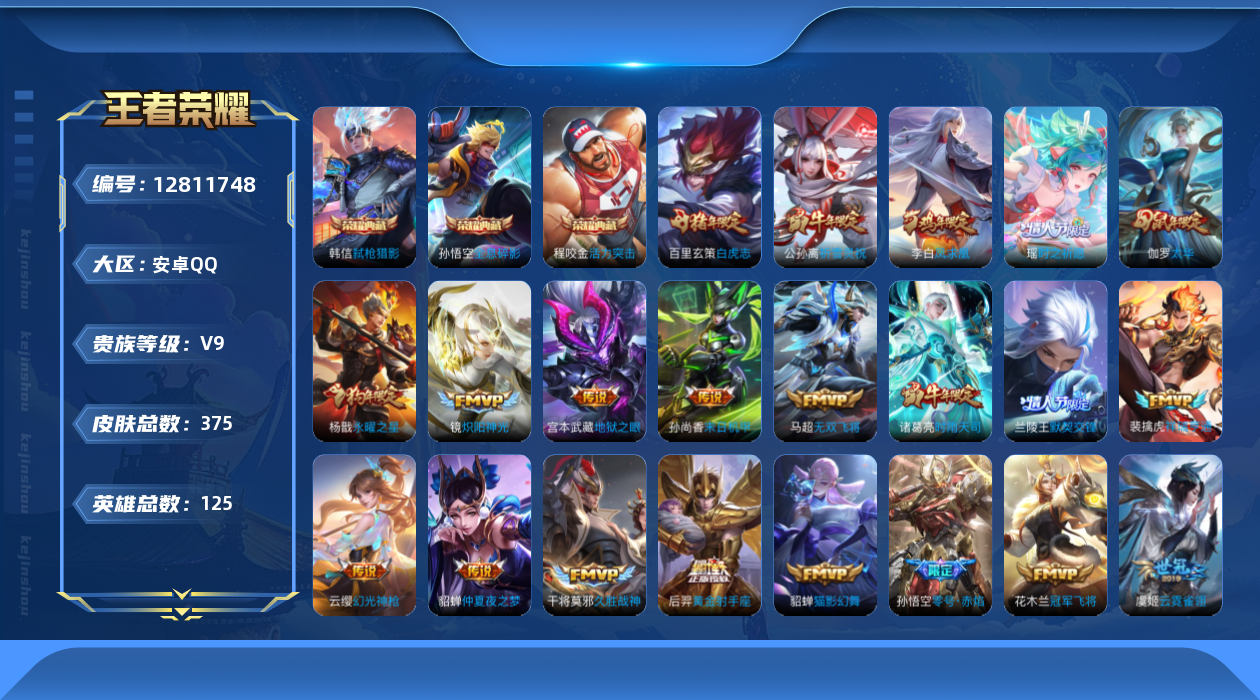 [12811748]安卓Q-V9-永恒钻石IV段位-125英雄-375皮肤-3典藏-0珍品无双-0无双-0珍品传说-23传说-115史诗