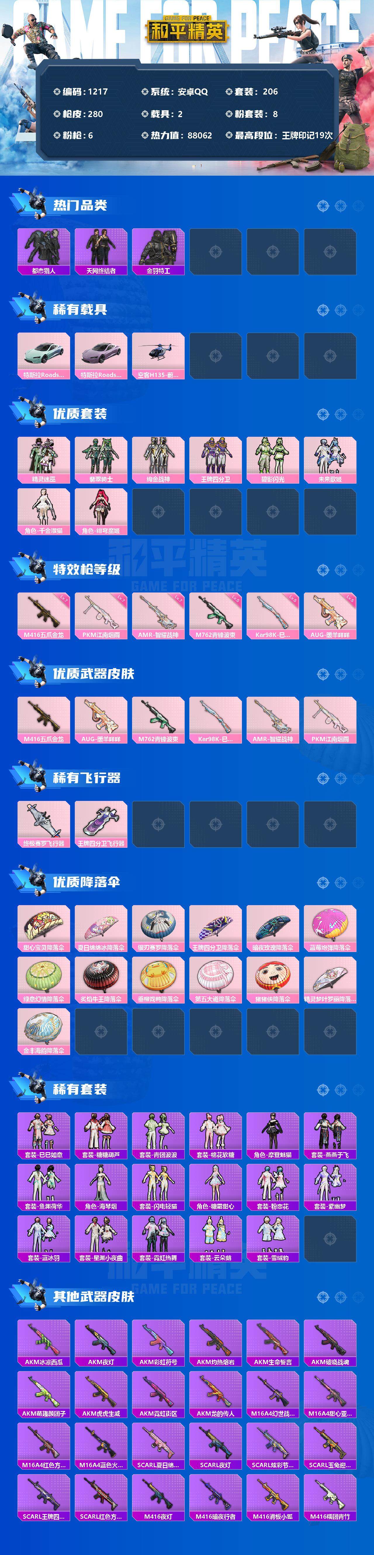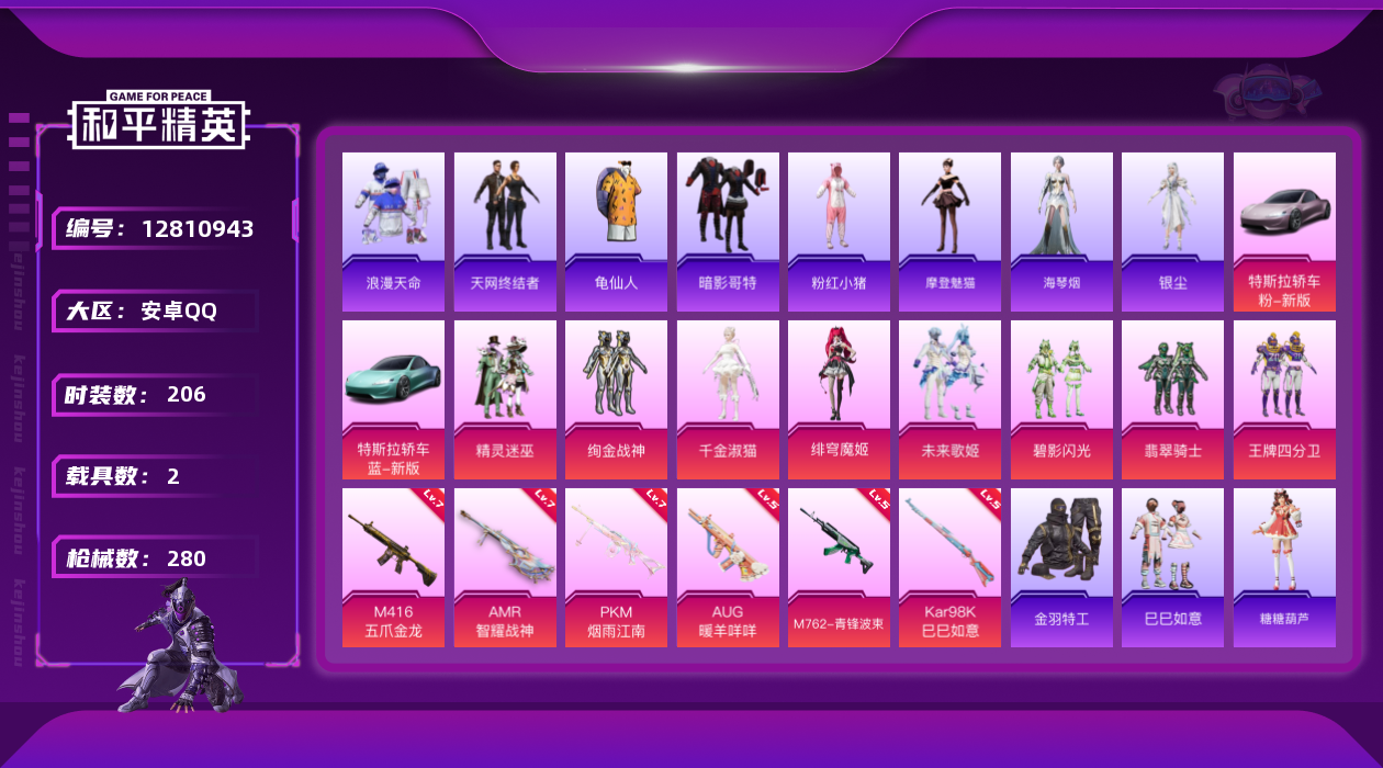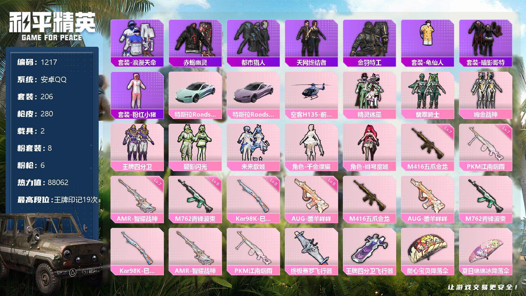 [12810943]安卓 手Q-8粉装-6特效枪-2载具-2粉色飞行器-88062热力值-19王牌印记-206套装-280枪皮 【热门品类】:套装-浪漫天命,套装-赤蝎幽灵,套装-都市猎人,套装-天网终结者,套装-金羽特工,套装-龟仙人,套装-暗影哥特,套装-粉红小猪 【粉色载具】:特斯拉Roadster(水滴蓝),特斯拉Roadster(沁心粉),空客H135-蔚蓝之翼 【粉色套装】:粉装-精灵迷巫,粉装-翡翠骑士,粉装-绚金战神,粉装-王牌四分卫,粉装-碧影闪光,粉装-未来歌姬,角色-千金淑猫,角色-绯穹魔姬 【粉色枪皮等级】:M416-五爪金龙(七级),AUG-暖羊咩咩(五级),M762-青锋波束(五级),Kar98K-巳巳如意(五级),AMR-智耀战神(七级),PKM-江南烟雨(七级) 【粉色枪皮】:M416-五爪金龙,AUG-暖羊咩咩,M762-青锋波束,Kar98K-巳巳如意,AMR-智耀战神,PKM-江南烟雨 【粉色飞行器】:终极赛罗飞行器,王牌四分卫飞行器 【粉色降落伞】:甜心宝贝降落伞,夏日绵绵冰降落伞,银刃赛罗降落伞,王牌四分卫降落伞,暗夜玫瑰降落伞,蓝莓炮弹降落伞,绿意幻情降落伞,炙焰牛王降落伞,垂柳戏鸭降落伞,第五大道降落伞,猪猪侠降落伞,精灵梦叶罗丽降落伞,金丰海韵降落伞 【稀有套装】:套装-龟仙人,套装-巳巳如意,套装-糖糖葫芦,套装-青团波波,套装-棉花软糖,角色-摩登魅猫,套装-燕燕于飞,套装-鱼渊荷华,角色-海琴烟,套装-闪电轻猫,角色-糖霜甜心,套装-粉恋花,套装-紫幽梦,套装-蓝冰羽,套装-星渊小夜曲,套装-霓虹热舞,套装-云朵鹅,套装-雪绒豹 【稀有枪皮】:AKM-冰凉西瓜,AKM-夜灯,AKM-彩虹符号,AKM-灼热熔岩,AKM-生命誓言,AKM-破晓战魂,AKM-萌趣颜团子,AKM-虎虎生威,AKM-霓虹街区,AKM-龙的传人,M16A4-幻世战舞者,M16A4-甜心亚梦,M16A4-红色方程式,M16A4-蓝色火焰,SCAR-L-夏日绵绵冰,SCAR-L-夜灯,SCAR-L-炫彩节奏,SCAR-L-玉兔迎春,SCAR-L-王牌四分卫,SCAR-L-红色方程式,M416-夜灯,M416-暗夜行者,M416-滑板小狐,M416-糯团青竹,M416-红色方程式,M416-蓝色火焰,GROZA-异彩先驱,GROZA-彩虹符号,GROZA-影袭,G