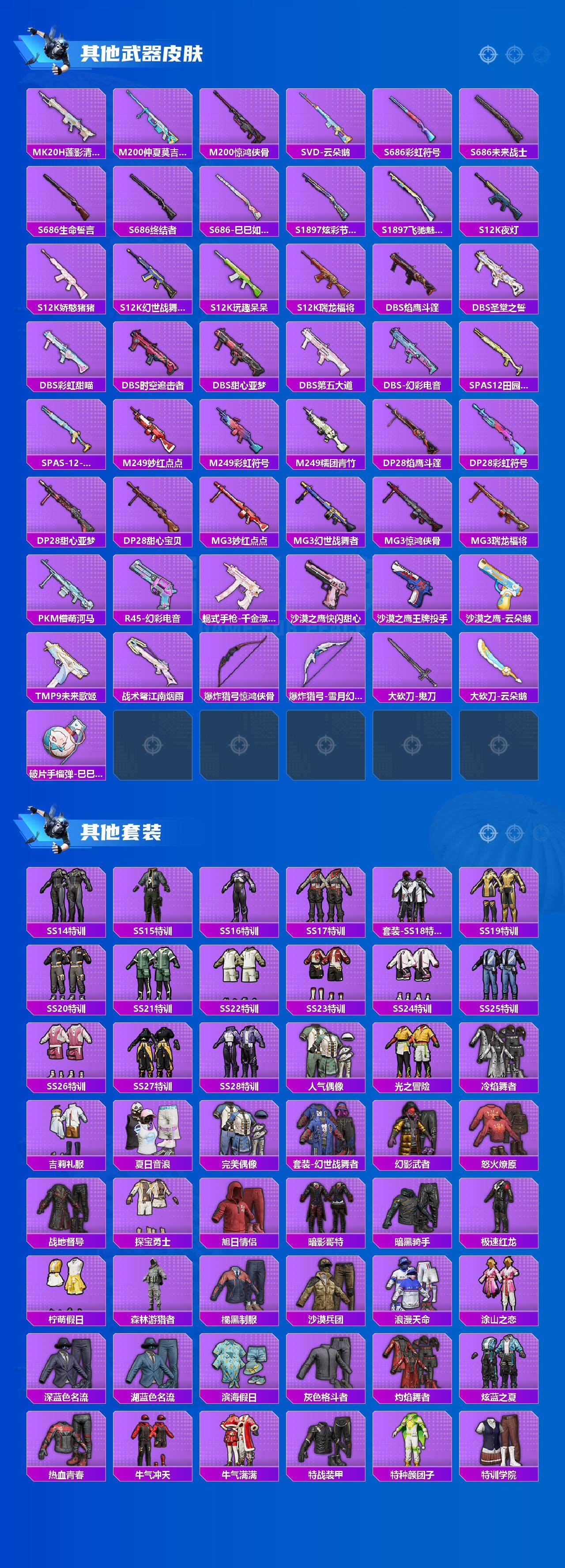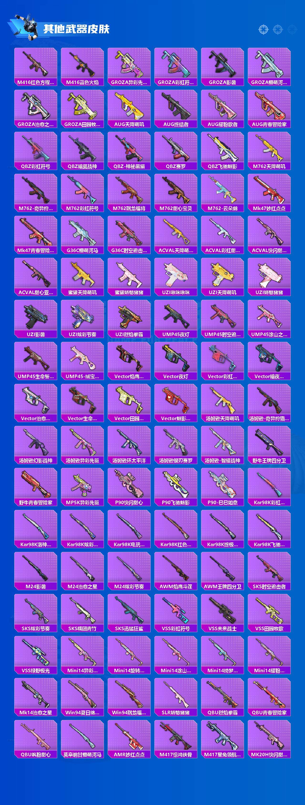 【稀有枪皮】:AKM-冰凉西瓜,AKM-夜灯,AKM-彩虹符号,AKM-灼热熔岩,AKM-生命誓言,AKM-破晓战魂,AKM-萌趣颜团子,AKM-虎虎生威,AKM-霓虹街区,AKM-龙的传人,M16A4-幻世战舞者,M16A4-甜心亚梦,M16A4-红色方程式,M16A4-蓝色火焰,SCAR-L-夏日绵绵冰,SCAR-L-夜灯,SCAR-L-炫彩节奏,SCAR-L-玉兔迎春,SCAR-L-王牌四分卫,SCAR-L-红色方程式,M416-夜灯,M416-暗夜行者,M416-滑板小狐,M416-糯团青竹,M416-红色方程式,M416-蓝色火焰,GROZA-异彩先驱,GROZA-彩虹符号,GROZA-影袭,G