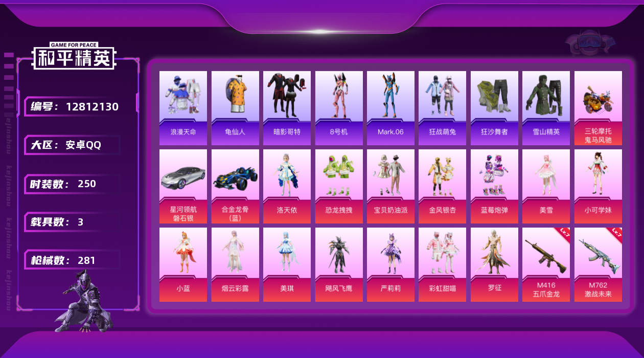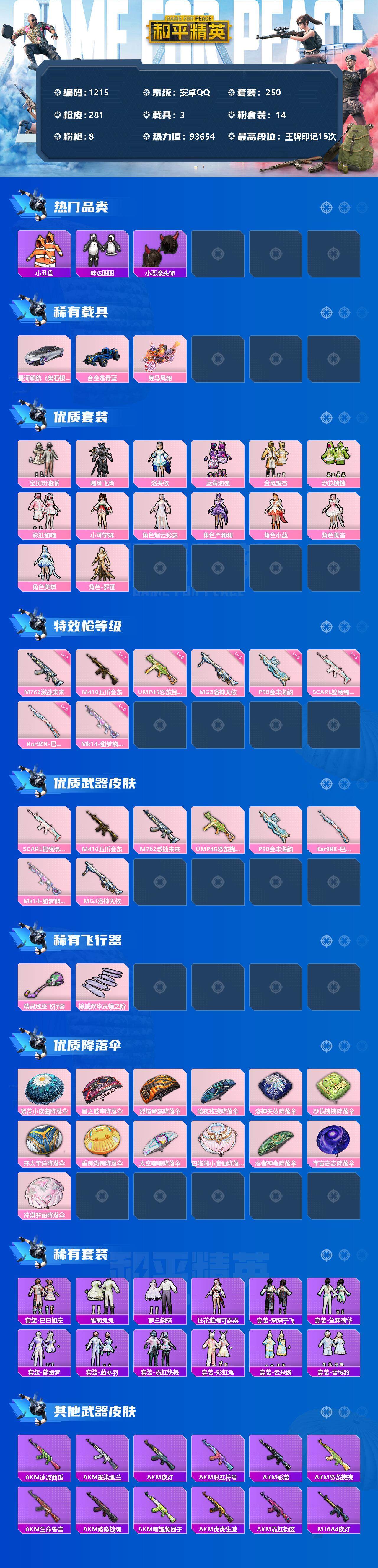 [12812130]安卓 手Q-14粉装-8特效枪-3载具-2粉色飞行器-93654热力值-15王牌印记-250套装-281枪皮 【热门品类】:套装-浪漫天命,套装-小丑鱼,套装-奇异狩猎者,套装-胖达圆圆,套装-龟仙人,套装-潮萌小黄鸭,套装-暗影哥特,角色-8号机,角色-Mark.06,小恶魔头饰 【粉色载具】:星河领航(磐石银),合金龙骨(蓝),鬼马风驰 【粉色套装】:粉装-宝贝奶油派,粉装-飓风飞鹰,角色-洛天依,粉装-蓝莓炮弹,粉装-金风银杏,粉装-恐龙拽拽,粉装-彩虹甜喵,角色-小可学妹,角色-烟云彩露,角色-严莉莉,角色-小蓝,角色-美雪,角色-美琪,角色-罗征 【粉色枪皮等级】:SCAR-L-锦绣绵绵(五级),M416-五爪金龙(七级),M762-激战未来(七级),UMP45-恐龙拽拽(六级),P90-金丰海韵(五级),Kar98K-巳巳如意(五级),Mk14-甜梦熊击(五级),MG3-洛神天依(五级) 【粉色枪皮】:SCAR-L-锦绣绵绵,M416-五爪金龙,M762-激战未来,UMP45-恐龙拽拽,P90-金丰海韵,Kar98K-巳巳如意,Mk14-甜梦熊击,MG3-洛神天依 【粉色飞行器】:精灵迷巫飞行器,镜域双华-灵镜之阶 【粉色降落伞】:繁花小夜曲降落伞,星之彼岸降落伞,烈焰拳霸降落伞,暗夜玫瑰降落伞,洛神天依降落伞,恐龙拽拽降落伞,环太平洋降落伞,垂柳戏鸭降落伞,太空嘟嘟降落伞,巴啦啦小魔仙降落伞,忍者神龟降落伞,宇宙意志降落伞,冷漠罗丽降落伞 【稀有套装】:套装-龟仙人,套装-巳巳如意,套装-雏菊兔兔,套装-萝兰蝴蝶,角色-狂花道·娜可露露,套装-燕燕于飞,套装-鱼渊荷华,套装-紫幽梦,套装-蓝冰羽,套装-霓虹热舞,套装-彩虹兔,套装-云朵鹅,套装-雪绒豹 【稀有枪皮】:AKM-冰凉西瓜,AKM-墨染幽兰,AKM-夜灯,AKM-彩虹符号,AKM-影袭,AKM-恐龙拽拽,AKM-生命誓言,AKM-破晓战魂,AKM-萌趣颜团子,AKM-虎虎生威,AKM-霓虹街区,M16A4-夜灯,M16A4-幻世战舞者,M16A4-甜心亚梦,M16A4-红色方程式,SCAR-L-夜灯,SCAR-L-炫彩节奏,SCAR-L-玉兔迎春,SCAR-L-红色方程式,SCAR-L-金风玉露,SCAR-L-青丘仙客,M416-动感兔斯基,M416-夜灯,M416-糯团青竹,M416-红