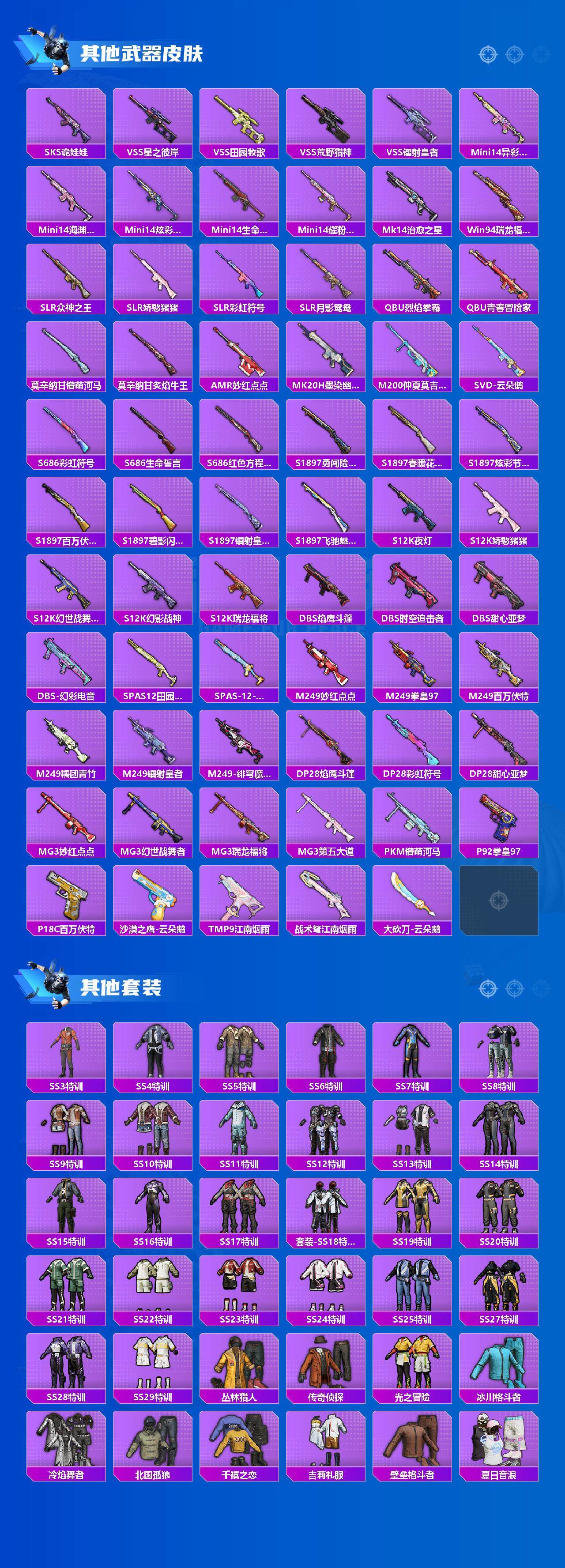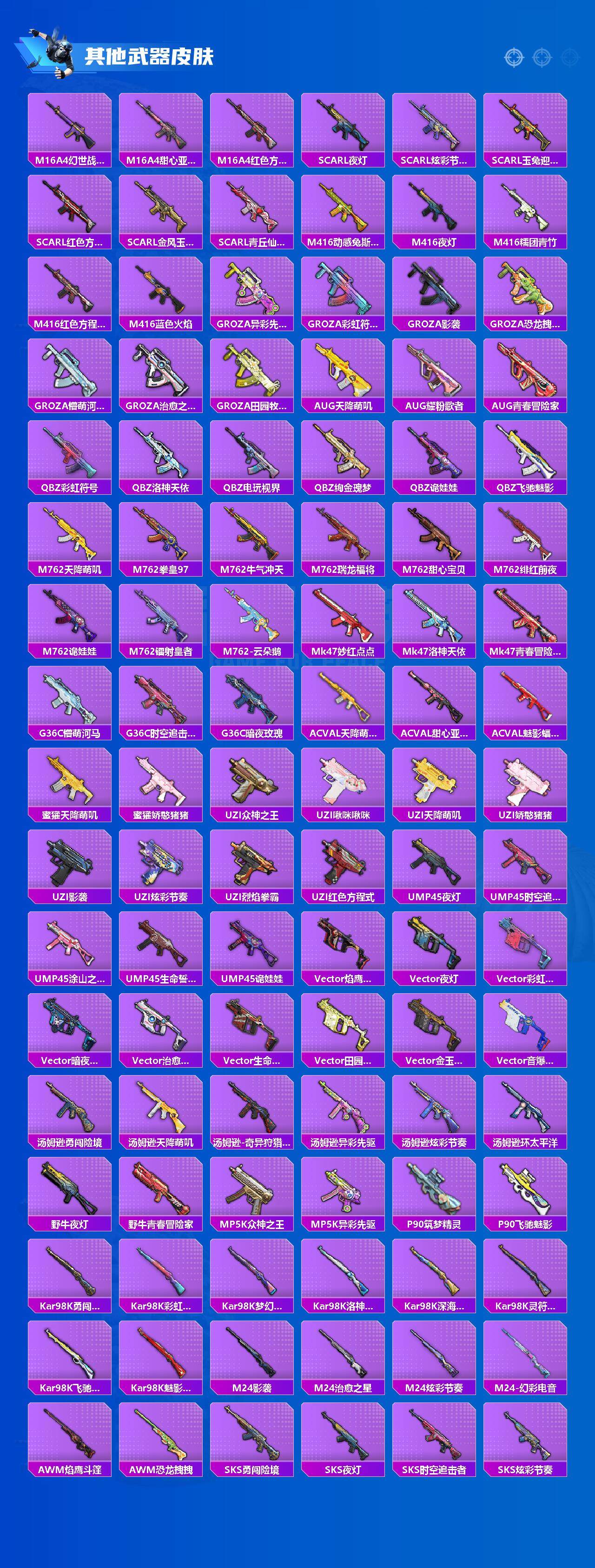 【稀有枪皮】:AKM-冰凉西瓜,AKM-墨染幽兰,AKM-夜灯,AKM-彩虹符号,AKM-影袭,AKM-恐龙拽拽,AKM-生命誓言,AKM-破晓战魂,AKM-萌趣颜团子,AKM-虎虎生威,AKM-霓虹街区,M16A4-夜灯,M16A4-幻世战舞者,M16A4-甜心亚梦,M16A4-红色方程式,SCAR-L-夜灯,SCAR-L-炫彩节奏,SCAR-L-玉兔迎春,SCAR-L-红色方程式,SCAR-L-金风玉露,SCAR-L-青丘仙客,M416-动感兔斯基,M416-夜灯,M416-糯团青竹,M416-红
