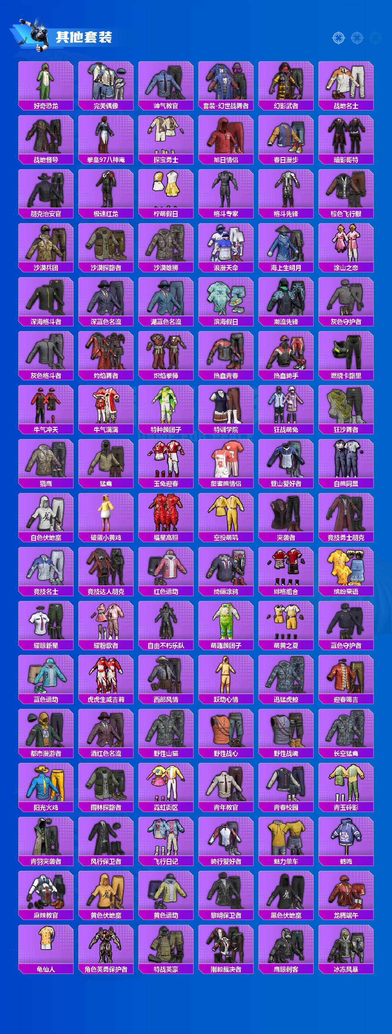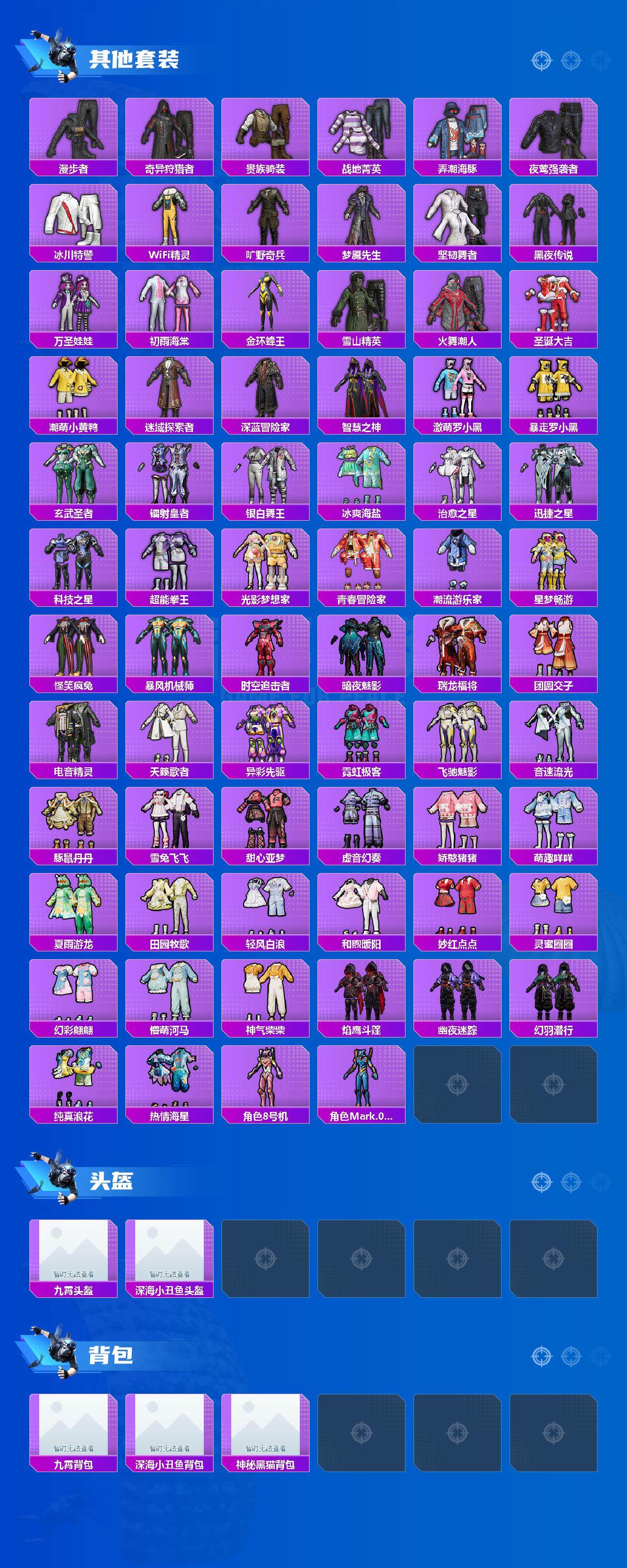 套装-浪漫天命,套装-龟仙人,套装-暗影哥特,角色-8号机,角色-Mark.06,套装-极速红龙,套装-狂沙舞者,套装-破蛋小黄鸡,角色-英勇保护者,套装-漫步者,套装-弄潮海豚,套装-雪山精英,套装-玄武圣者,套装-冰爽海盐,套装-怪笑疯兔,套装-瑞龙福将,套装-团圆交子,套装-豚鼠丹丹