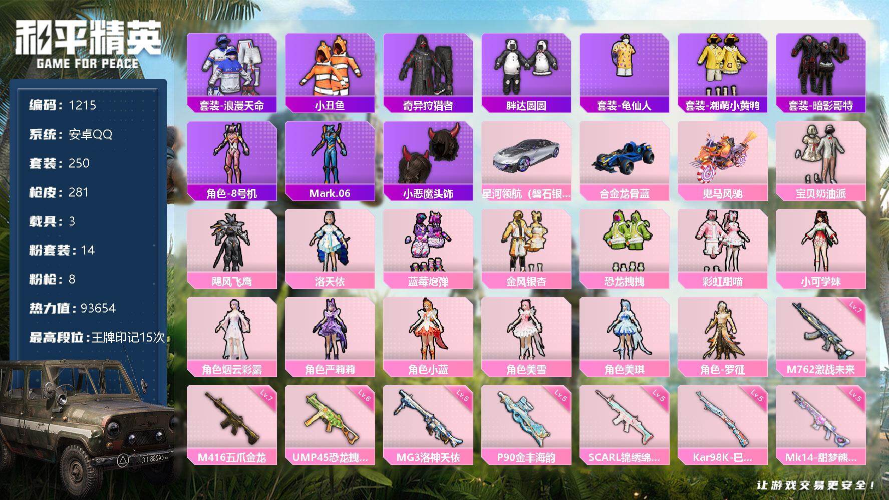 [12812130]安卓 手Q-14粉装-8特效枪-3载具-2粉色飞行器-93654热力值-15王牌印记-250套装-281枪皮