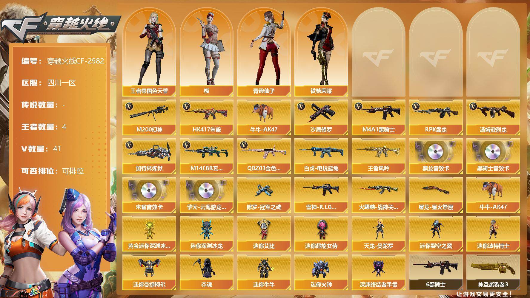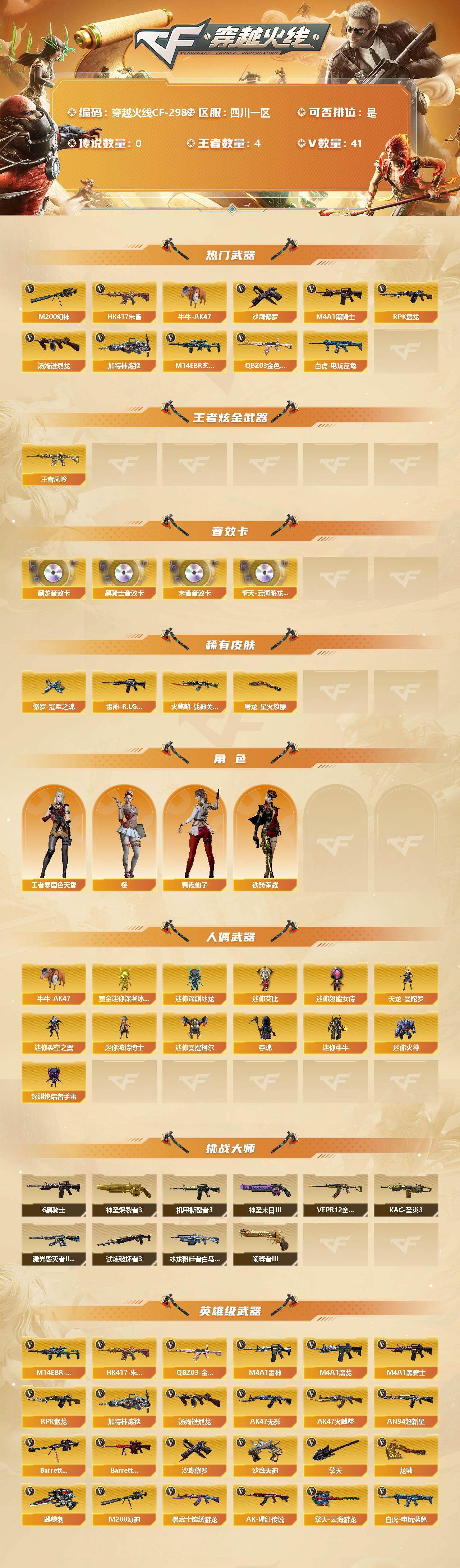 [12812422]四川一区-41V-4王者-0炫金 【热门武器】:QBZ03-金色蔷薇,M14EBR-玄武,HK417-朱雀,M200-幻神,白虎-电玩蓝兔,牛牛-AK47,M4A1-黑骑士*6,汤姆逊-烈龙*2,RPK-盘龙,加特林-炼狱*2,沙鹰-修罗*3 【王者炫金武器】:王者凤吟 【音效卡】:擎天-云海游龙音效卡,M4A1-黑龙音效卡,M4A1-黑骑士音效卡,HK417-朱雀音效卡 【稀有皮肤】:雷神-R.LGD-CFPLS18冠军,火麒麟-战神关羽,修罗-冠军之魂,屠龙-星火燎原 【角色】:王者-零-国色天香,樱,铁骑荣耀,青霞仙子 【人偶武器】:天龙-曼陀罗,牛牛-AK47,黄金迷你深渊冰龙,迷你深渊冰龙*2,迷你艾比,迷你超能女侍,迷你裂空之翼*7,迷你波特博士*2,迷你曼提柯尔*2,夺魂*7,迷你牛牛,迷你火种*4,深渊终结者手雷*2 【挑战大师】:神圣爆裂者III,机甲撕裂者III*2,神圣爆裂者-末日III,KAC-圣炎切割者III,阐释者III,试炼破坏者III*2,VEPR-12-金魔,激光毁灭者III-白马银枪*2,冰龙粉碎者-白马银枪 【英雄级武器】:QBZ03-金色蔷薇,M14EBR-玄武,HK417-朱雀,白虎-电玩蓝兔,M4A1-雷神*2,M4A1-黑龙,M4A1-黑骑士*6,RPK-盘龙,加特林-炼狱*2,汤姆逊-烈龙*2,AK47-无影,AK47-火麒麟,AN94-超新星,Barrett-毁灭,Barrett-极光,M200-幻神,黑武士-锦绣游龙,AK-47-猩红传说,沙鹰-天神,沙鹰-修罗*3,麒麟刺,擎天*2,龙啸,擎天-云海游龙 【特殊枪械】:6黑骑士,2烈龙,1盘龙,2炼狱