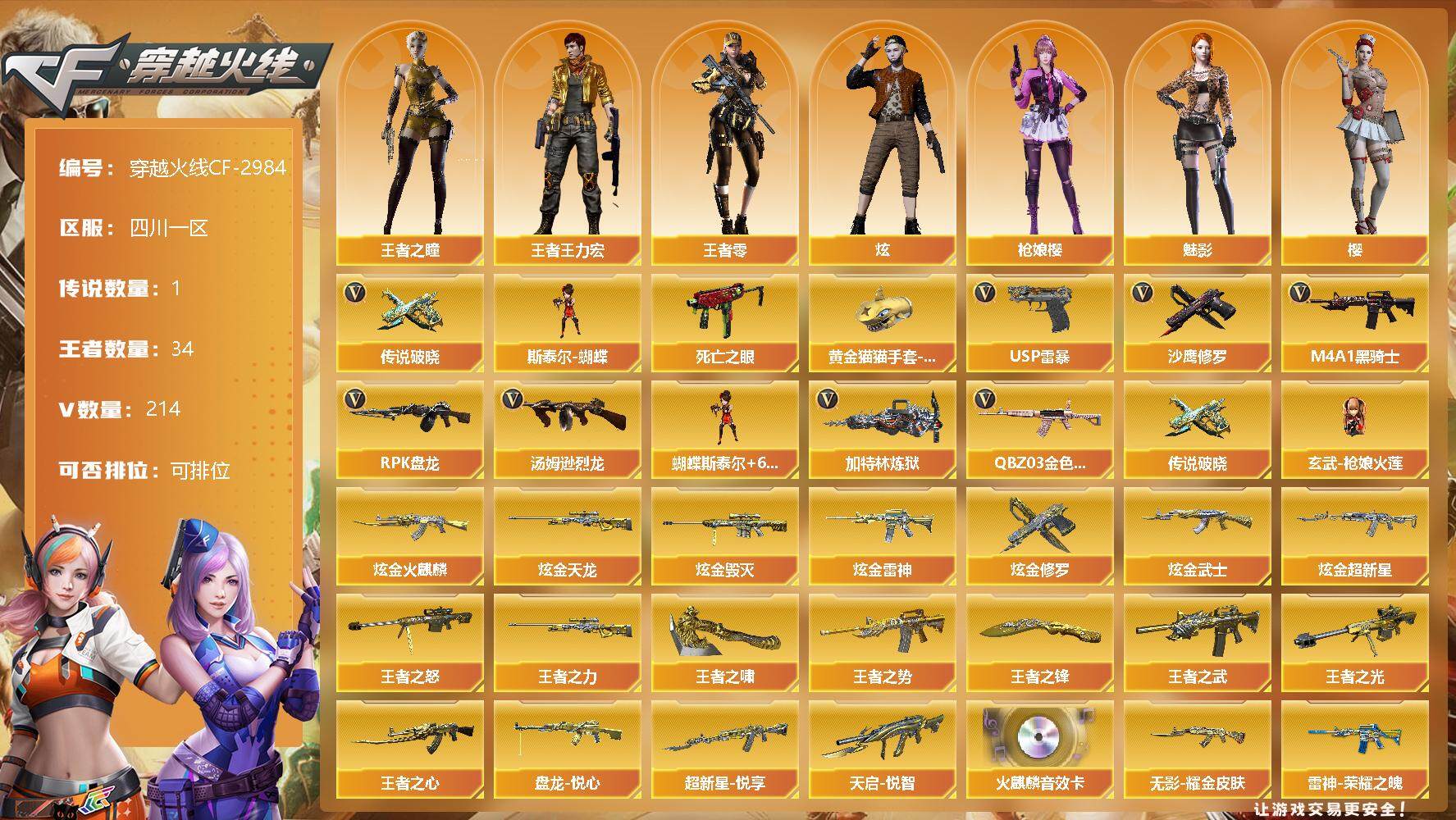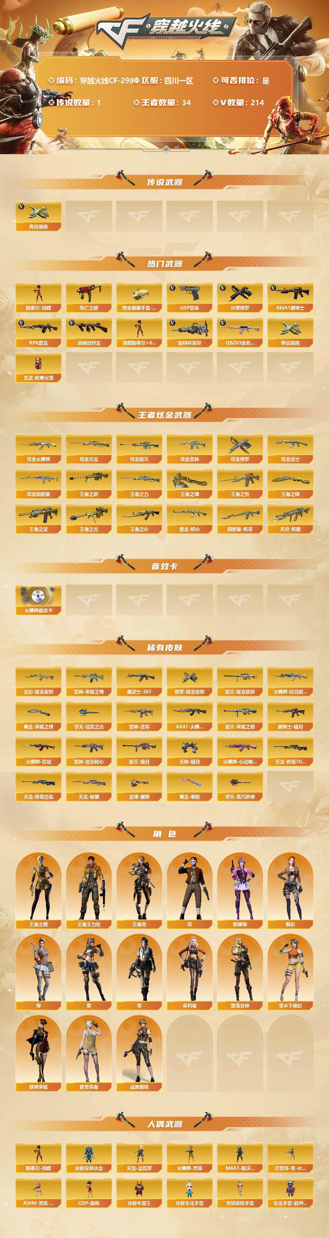 [12812755]四川一区-214V-34王者-10炫金 【传说武器】:传说破晓 【热门武器】:传说破晓,QBZ03-金色蔷薇*2,死亡之眼,M4A1-黑骑士*8,汤姆逊-烈龙*11,RPK-盘龙*15,加特林-炼狱*2,斯泰尔-蝴蝶,玄武-枪娘火莲,USP-雷暴,沙鹰-修罗*9,黄金猫猫手套-白鲨 【王者炫金武器】:炫金火麒麟,炫金天龙*2,炫金毁灭*3,炫金雷神,炫金修罗,炫金武士,炫金超新星,盘龙-悦心*4,超新星-悦享,天启-悦智*2,王者之势*3,王者之武,王者之光,王者之怒*2,王者之力*2,王者之心,王者之啸,王者之锋*2 【音效卡】:AK47-火麒麟音效卡 【稀有皮肤】:雷神-能量核心*2,雷神-荣耀之魄,雷神-虎将,AK47-火麒麟-传奇EVEN,火麒麟-轻羽皮肤,火麒麟-百城,火麒麟-心动糖果,黑骑士-暗月*3,毁灭-暗月*2,毁灭-荣耀之怒*2,毁灭耀金皮肤*2,天龙-秘银*2,AWM-天龙-传奇70KG*2,AWM-天龙-传奇白鲨,无影耀金皮肤,AK47-黑武士-361,修罗耀金皮肤*2,天神-暗月*4,屠龙-荣耀之锋*4,屠龙-春桃 皮肤,擎天-冠军之击,擎天-蒸汽钟表 皮肤,龙啸-醒狮 皮肤 【角色】:王者-零,王者之瞳,王者王力宏,堕落女神,零-水下丽影,审判者,零,葵,樱,魅影,炫,枪娘樱,战地猎狐,新灵狐者,铁骑荣耀 【人偶武器】:玄武-枪娘火莲,斯泰尔-蝴蝶,天龙-曼陀罗,火麒麟-灵狐,M4A1-斯沃特,巴雷特-零-水下丽影,AWM-灵狐-15周年嘉年华*2,COP-旗袍,迷你深渊冰龙,迷你牛魔王,迷你生化手雷*2,灵狐娃娃手雷,生化手雷-机甲核心,闪光弹-小乔 【暴走生化】:斯泰尔-蝴蝶,斯泰尔-枪娘暗刃,死亡之眼,超级对讲机 【挑战大师】:神圣爆裂者III,神圣爆裂者-末日III,激光毁灭者III*6,激光毁灭者III-白马银枪,冰龙粉碎者-白马银枪*3 【英雄级武器】:擎天-竞技荣光,麒麟刺-堕天神,龙啸-堕天神,AK47-雷暴,USP-雷暴,斩神刀-雷暴,M4A1-武圣,QBZ03-金色蔷薇*2,无影-神兵利器,M4A1-雷神*8,M4A1-黑龙*2,M4A1-玫瑰精灵,M4A1-黑骑士*8,M4A1-死神*3,RPK-盘龙*15,加特林-炼狱*2,汤姆逊-烈龙*11,AK47-无影*3,AK47-火麒麟*11,AK47-黑武士,AK12