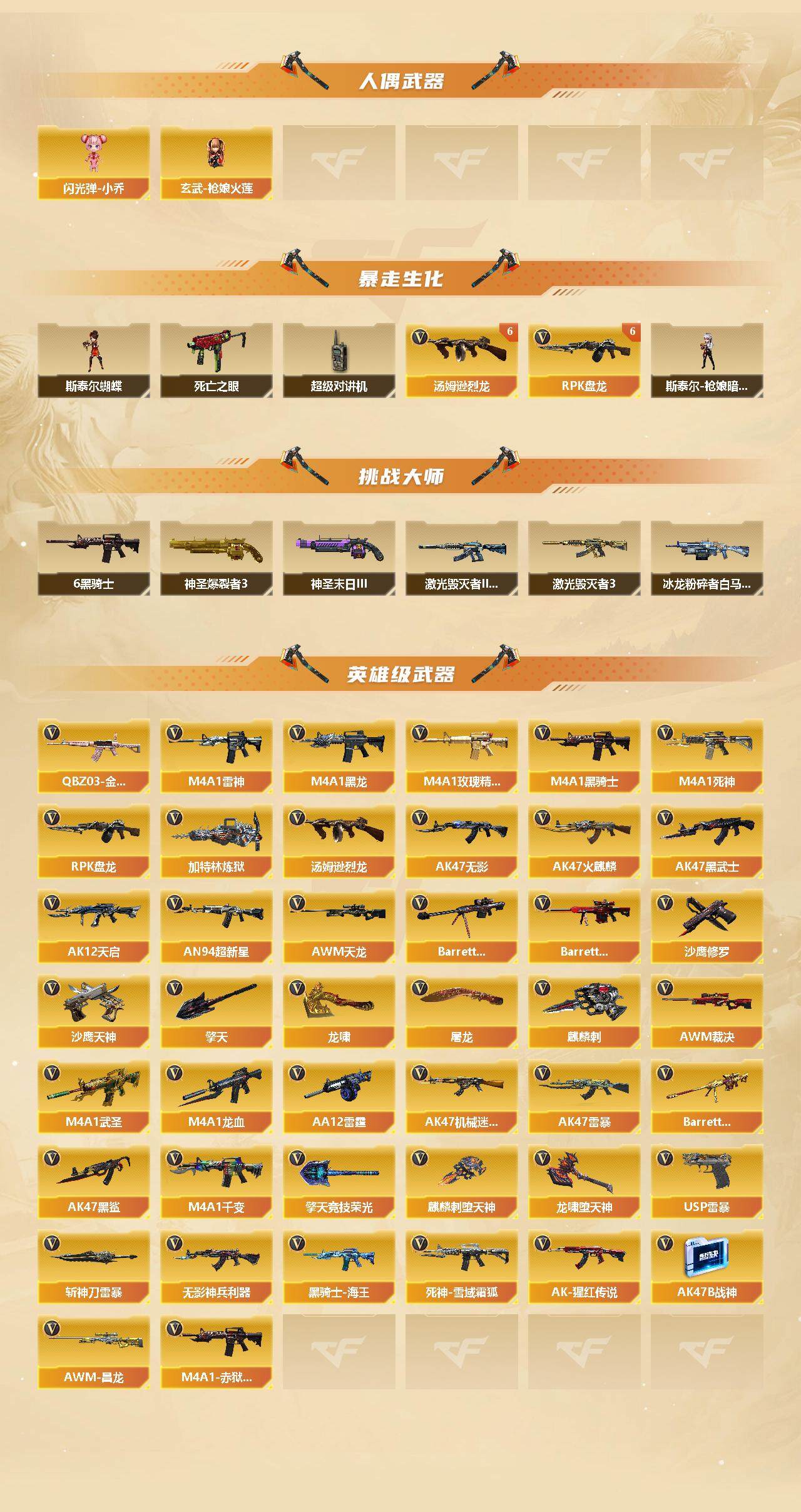 【英雄级武器】:擎天-竞技荣光,麒麟刺-堕天神,龙啸-堕天神,AK47-雷暴,USP-雷暴,斩神刀-雷暴,M4A1-武圣,QBZ03-金色蔷薇*2,无影-神兵利器,M4A1-雷神*8,M4A1-黑龙*2,M4A1-玫瑰精灵,M4A1-黑骑士*8,M4A1-死神*3,RPK-盘龙*15,加特林-炼狱*2,汤姆逊-烈龙*11,AK47-无影*3,AK47-火麒麟*11,AK47-黑武士,AK12