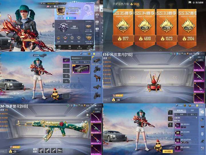 【粉色枪皮等级】:AKM-绿萝繁花(五级),M416-风花雪月(七级),Kar98K-巳巳如意(五级),AMR-炫光之旅(七级),DP-28-豹影疾电(五级),MG-36-沧焰双生(五级)