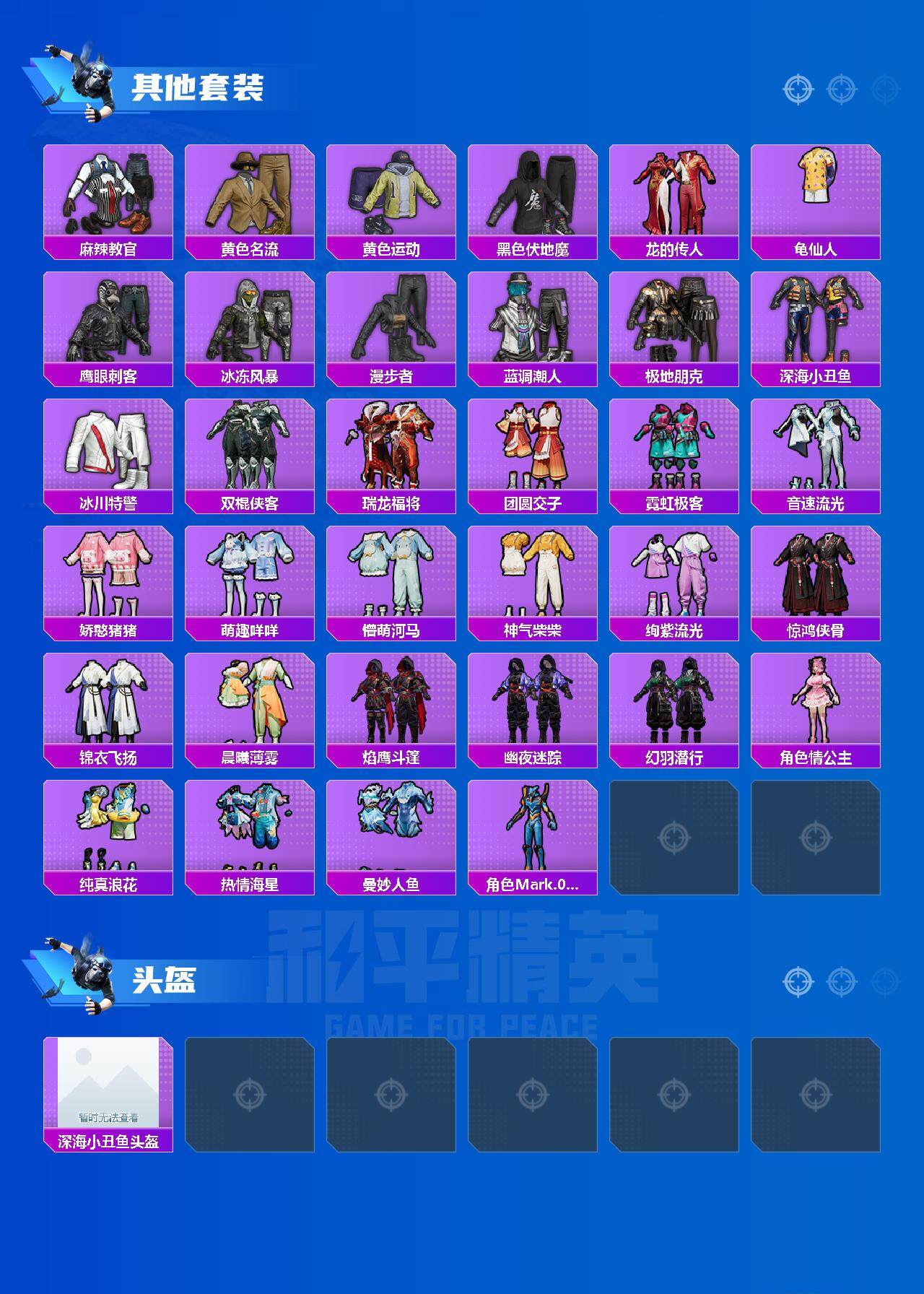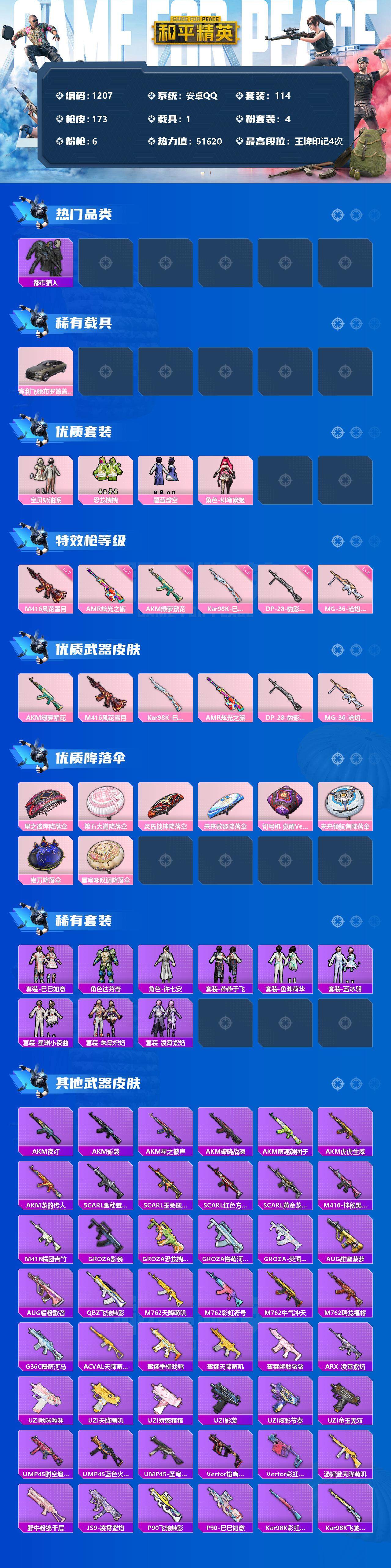 [12813121]安卓 手Q-4粉装-6特效枪-1载具-0粉色飞行器-51620热力值-4王牌印记-114套装-173枪皮 【热门品类】:套装-浪漫天命,套装-都市猎人,套装-深海小丑鱼,套装-龟仙人,套装-暗影哥特,角色-Mark.06 【粉色载具】:宾利飞驰(布罗德盖棕双色) 【粉色套装】:粉装-宝贝奶油派,粉装-恐龙拽拽,粉装-碧蓝澄空,角色-绯穹魔姬 【粉色枪皮等级】:AKM-绿萝繁花(五级),M416-风花雪月(七级),Kar98K-巳巳如意(五级),AMR-炫光之旅(七级),DP-28-豹影疾电(五级),MG-36-沧焰双生(五级) 【粉色枪皮】:AKM-绿萝繁花,M416-风花雪月,Kar98K-巳巳如意,AMR-炫光之旅,DP-28-豹影疾电,MG-36-沧焰双生 【粉色降落伞】:星之彼岸降落伞,第五大道降落伞,炎氏战神降落伞,未来歌姬降落伞,初号机 觉醒Ver.降落伞,未来领航者降落伞,鬼刀降落伞,星穹咏叹调降落伞 【稀有套装】:套装-龟仙人,套装-巳巳如意,角色-达芬奇,角色-许七安,套装-燕燕于飞,套装-鱼渊荷华,套装-蓝冰羽,套装-星渊小夜曲,套装-朱霞炽焰,套装-凌霄紫焰 【稀有枪皮】:AKM-夜灯,AKM-影袭,AKM-星之彼岸,AKM-破晓战魂,AKM-萌趣颜团子,AKM-虎虎生威,AKM-龙的传人,SCAR-L-幽秘魅影,SCAR-L-玉兔迎春,SCAR-L-红色方程式,SCAR-L-黄金龙骨,M416-神秘黑猫,M416-糯团青竹,GROZA-影袭,GROZA-恐龙拽拽,GROZA-懵萌河马,GROZA-荧海星豚,AUG-甜蜜菠萝,AUG-耀粉歌者,QBZ-飞驰魅影,M762-天降萌叽,M762-彩虹符号,M762-牛气冲天,M762-瑞龙福将,G36C-懵萌河马,AC-VAL-天降萌叽,蜜獾-垂柳戏鸭,蜜獾-天降萌叽,蜜獾-娇憨猪猪,ARX-凌霄紫焰,UZI-啾咪啾咪,UZI-天降萌叽,UZI-娇憨猪猪,UZI-影袭,UZI-炫彩节奏,UZI-金玉无双,UMP45-时空追击者,UMP45-蓝色火焰,UMP45-圣穹绘梦,Vector-焰鹰斗篷,Vector-彩虹符号,汤姆逊-天降萌叽,野牛-粉锦千层,JS9-凌霄紫焰,P90-飞驰魅影,P90-巳巳如意,Kar98K-彩虹符号,Kar98K-飞驰魅影,M24-影袭,M24-炫彩节奏,AWM-焰鹰斗