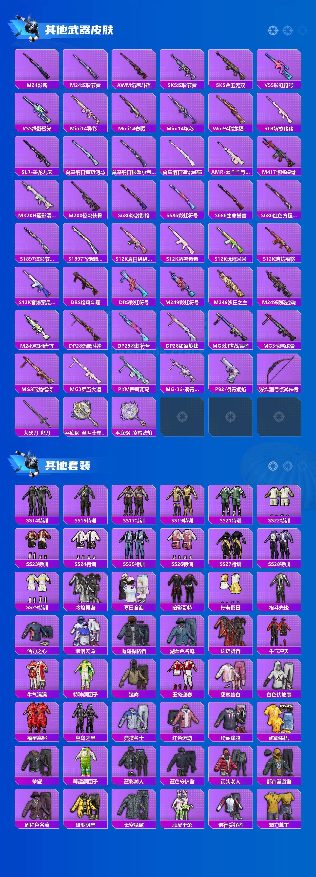 【稀有枪皮】:AKM-夜灯,AKM-影袭,AKM-星之彼岸,AKM-破晓战魂,AKM-萌趣颜团子,AKM-虎虎生威,AKM-龙的传人,SCAR-L-幽秘魅影,SCAR-L-玉兔迎春,SCAR-L-红色方程式,SCAR-L-黄金龙骨,M416-神秘黑猫,M416-糯团青竹,GROZA-影袭,GROZA-恐龙拽拽,GROZA-懵萌河马,GROZA-荧海星豚,AUG-甜蜜菠萝,AUG-耀粉歌者,QBZ-飞驰魅影,M762-天降萌叽,M762-彩虹符号,M762-牛气冲天,M762-瑞龙福将,G36C-懵萌河马,AC-VAL-天降萌叽,蜜獾-垂柳戏鸭,蜜獾-天降萌叽,蜜獾-娇憨猪猪,ARX-凌霄紫焰,UZI-啾咪啾咪,UZI-天降萌叽,UZI-娇憨猪猪,UZI-影袭,UZI-炫彩节奏,UZI-金玉无双,UMP45-时空追击者,UMP45-蓝色火焰,UMP45-圣穹绘梦,Vector-焰鹰斗篷,Vector-彩虹符号,汤姆逊-天降萌叽,野牛-粉锦千层,JS9-凌霄紫焰,P90-飞驰魅影,P90-巳巳如意,Kar98K-彩虹符号,Kar98K-飞驰魅影,M24-影袭,M24-炫彩节奏,AWM-焰鹰斗