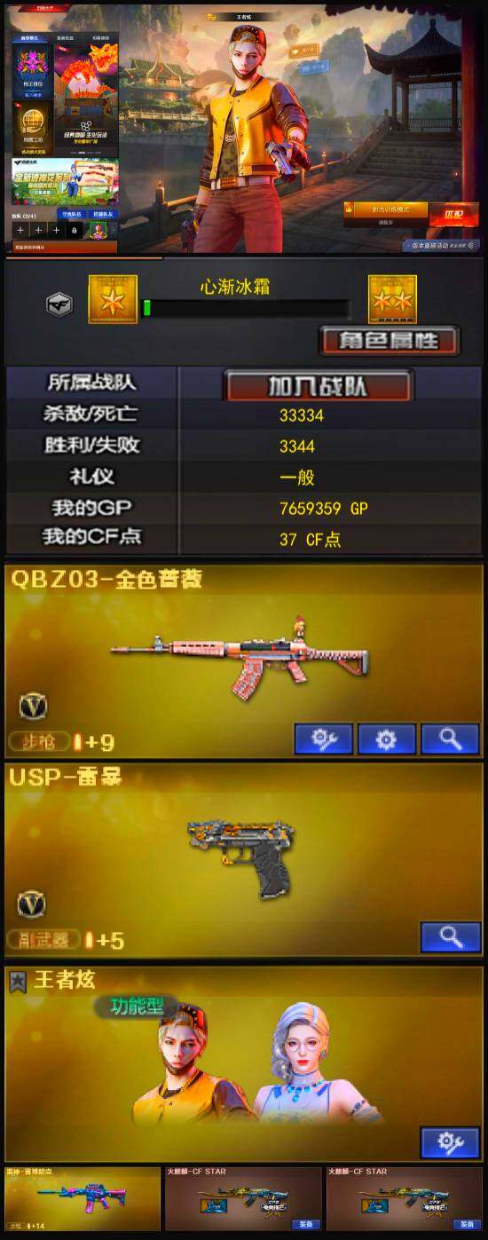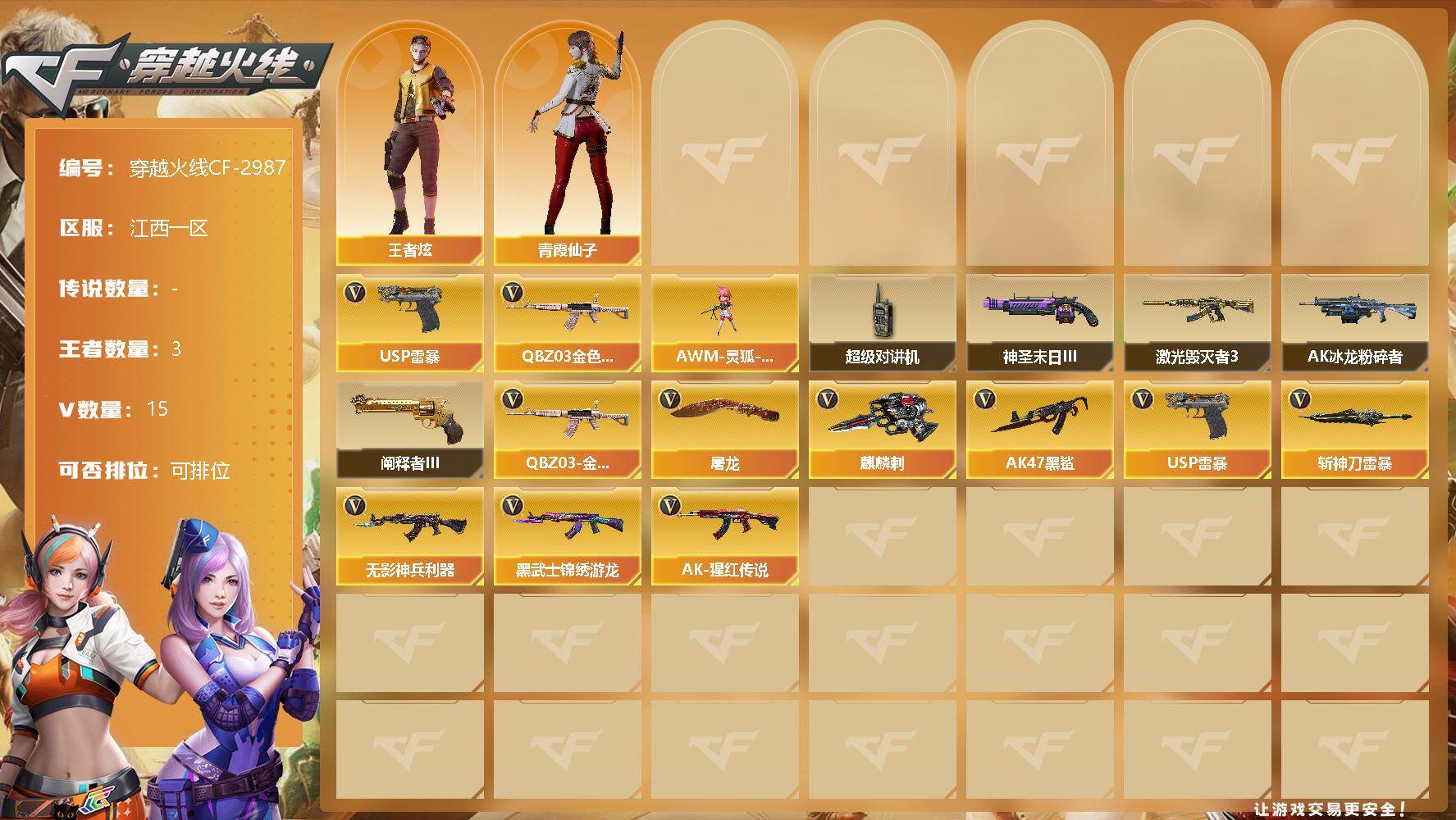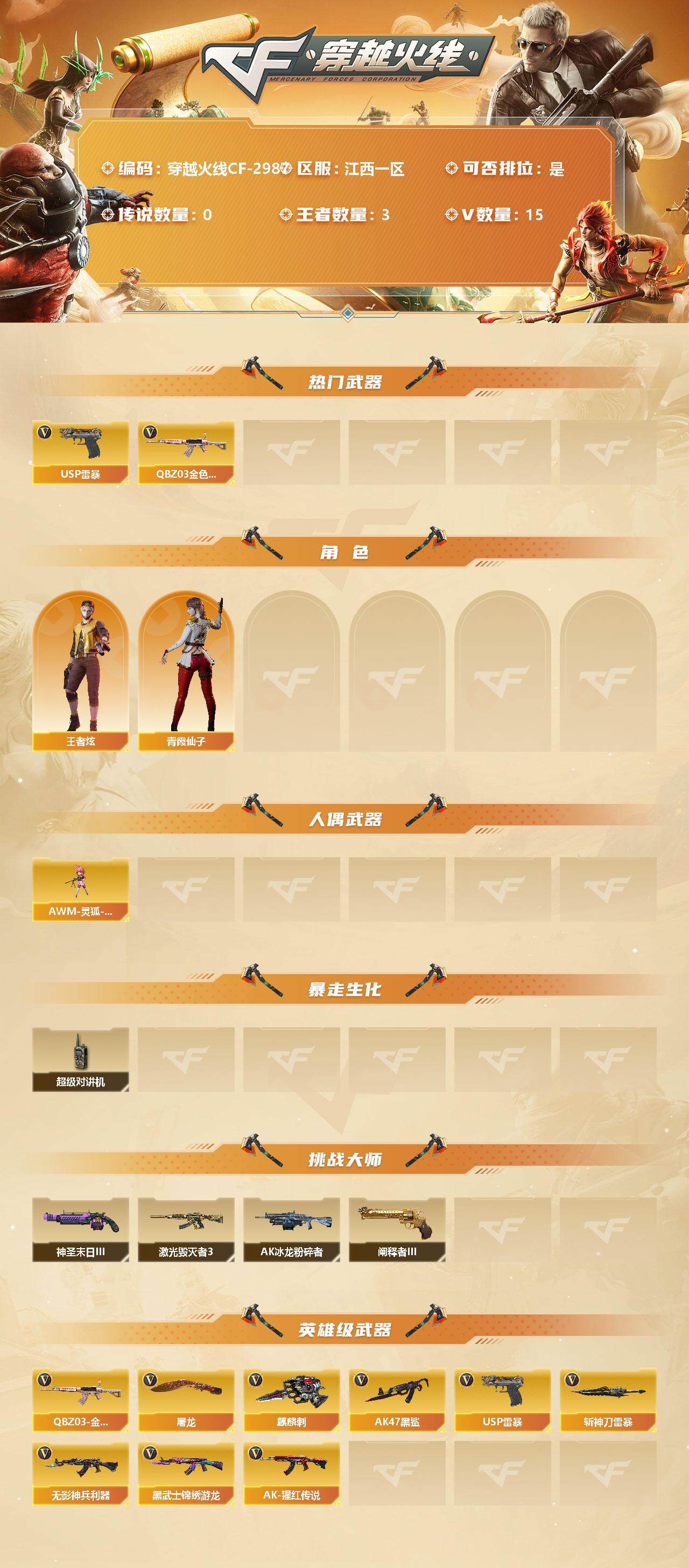 [12813497]江西一区-15V-3王者-0炫金 【热门武器】:QBZ03-金色蔷薇,USP-雷暴 【角色】:王者炫,青霞仙子 【人偶武器】:AWM-灵狐-15周年嘉年华 【暴走生化】:超级对讲机 【挑战大师】:神圣爆裂者-末日III,阐释者III,激光毁灭者III,AK47-冰龙粉碎者 【英雄级武器】:USP-雷暴,斩神刀-雷暴,QBZ03-金色蔷薇,无影-神兵利器,AK47-黑鲨,黑武士-锦绣游龙,AK-47-猩红传说*2,麒麟刺,屠龙 【特殊枪械】: