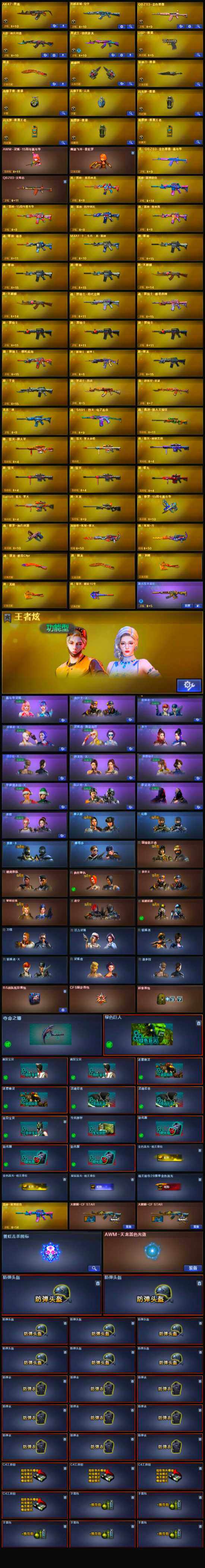 - [12710654]安徽一区-31V-5王者-0炫金 【热门武器】:QBZ03-金色蔷薇,M4A1-青龙,M200-幻神,白虎-电玩蓝兔,柯尔特-冠军之特*2,M4A1-黑骑士,汤姆逊-烈龙,加特林-炼狱,沙鹰-修罗*2,Knife-冠军之刃 【王者炫金武器】:王者之城 【音效卡】:M200-幻神音效卡,M4A1-黑骑士音效卡,Barrett-毁灭音效卡 【稀有皮肤】:幻神-巅峰荣耀,QBZ03-冠军之薇,雷神-荣耀之魄,火麒麟-轻羽皮肤,火麒麟-平天大圣,火麒麟-盘古,火麒麟-心动糖果,黑骑士-冠军之势,黑骑士-地狱火,毁灭-暗月,毁灭-荣耀之怒,修罗-星空 【角色】:关小雨,铁骑荣耀,青霞仙子 【人偶武器】:AWM-灵狐-15周年嘉年华,M4A1-雷神-精英刀锋,黄金迷你深渊冰龙,迷你超能女侍,生化手雷-机甲核心 【暴走生化】:超级对讲机 【英雄级武器】:尼泊尔-电竞装甲,马来剑-夜魔,QBZ03-金色蔷薇,M4A1-青龙,白虎-电玩蓝兔,M4A1-雷神,M4A1-黑骑士,加特林-炼狱,汤姆逊-烈龙,AK47-火麒麟,AK12-天启,Barrett-毁灭,AK47-机械迷城,M200-幻神,黑武士-锦绣游龙,AK-47-猩红传说*2,柯尔特-冠军之特*2,沙鹰-修罗*2,麒麟刺,屠龙 【特殊枪械】:1黑骑士,1烈龙,1炼狱