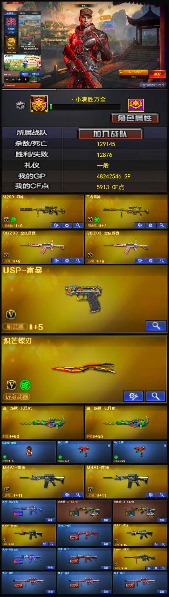 【热门武器】:QBZ03-金色蔷薇*2,M200-幻神,死亡之眼*2,M4A1-黑骑士,斯泰尔-蝴蝶,USP-雷暴,沙鹰-修罗*4,炽芒蝶刃