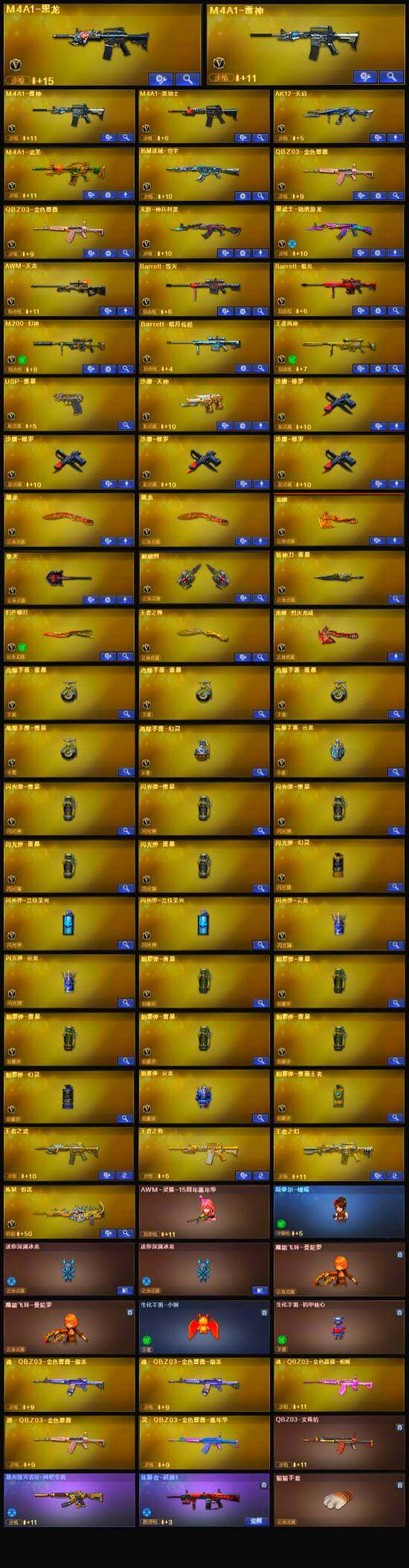 【英雄级武器】:闪光弹-竞技荣光*2,USP-雷暴,斩神刀-雷暴,M4A1-武圣,QBZ03-金色蔷薇*2,无影-神兵利器,M4A1-雷神*2,M4A1-黑龙,M4A1-黑骑士,AK12-天启,AWM-天龙,Barrett-毁灭,Barrett-极光,M200-幻神,黑武士-锦绣游龙,M4A1-赤狱骑士,沙鹰-天神,沙鹰-修罗*4,炽芒蝶刃,麒麟刺,擎天,龙啸,屠龙*2