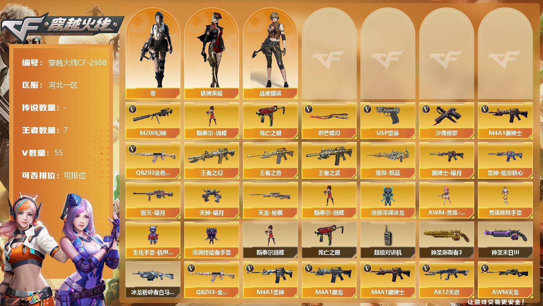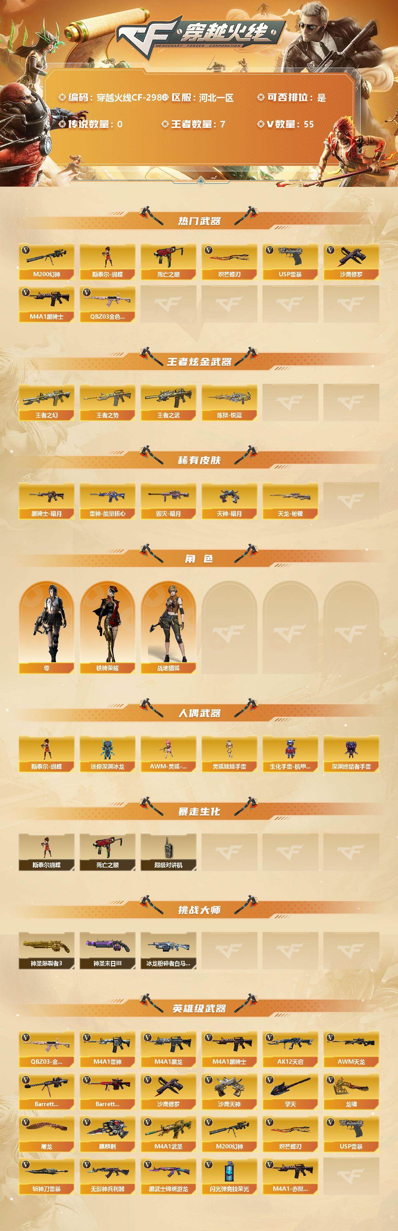 [12813595]河北一区-55V-7王者-0炫金 【热门武器】:QBZ03-金色蔷薇*2,M200-幻神,死亡之眼*2,M4A1-黑骑士,斯泰尔-蝴蝶,USP-雷暴,沙鹰-修罗*4,炽芒蝶刃 【王者炫金武器】:炼狱-悦蓝,王者之幻,王者之势,王者之武 【稀有皮肤】:雷神-能量核心,黑骑士-暗月,毁灭-暗月*3,天龙-秘银,天神-暗月 【角色】:零,战地猎狐,铁骑荣耀 【人偶武器】:斯泰尔-蝴蝶,AWM-灵狐-15周年嘉年华,迷你深渊冰龙*2,灵狐娃娃手雷,生化手雷-机甲核心,深渊终结者手雷 【暴走生化】:斯泰尔-蝴蝶,死亡之眼*2,超级对讲机 【挑战大师】:神圣爆裂者III*2,神圣爆裂者-末日III,冰龙粉碎者-白马银枪 【英雄级武器】:闪光弹-竞技荣光*2,USP-雷暴,斩神刀-雷暴,M4A1-武圣,QBZ03-金色蔷薇*2,无影-神兵利器,M4A1-雷神*2,M4A1-黑龙,M4A1-黑骑士,AK12-天启,AWM-天龙,Barrett-毁灭,Barrett-极光,M200-幻神,黑武士-锦绣游龙,M4A1-赤狱骑士,沙鹰-天神,沙鹰-修罗*4,炽芒蝶刃,麒麟刺,擎天,龙啸,屠龙*2 【特殊枪械】:蝴蝶斯泰尔+0烈龙,1黑骑士,1蝴蝶斯泰尔