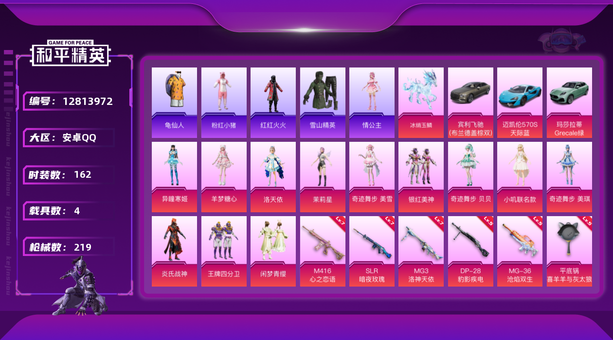 [12813972]安卓 手Q-12粉装-7特效枪-4载具-3粉色飞行器-78928热力值-11王牌印记-162套装-219枪皮 【热门品类】:套装-奇异狩猎者,套装-龟仙人,套装-粉红小猪,套装-红红火火,大砍刀-青龙偃月刀 【粉色载具】:玛莎拉蒂Grecale(薄荷绿),宾利飞驰(布罗德盖棕双色),迈凯伦570S(天际蓝),僚机-萌兔起飞,冰绡玉鳞 【粉色套装】:粉装-王牌四分卫,角色-洛天依,粉装-银红美神,粉装-炎氏战神,粉装-闲梦青缨,角色-茉莉星,角色-小叽联名款,角色-奇迹舞步 贝贝,角色-奇迹舞步 美琪,角色-奇迹舞步 美雪,角色-羊梦糖心,角色-异瞳寒姬 【粉色枪皮等级】:M416-心之恋语(七级),P90-魔童闹海 敖丙(三级),SLR-暗夜玫瑰(七级),DP-28-豹影疾电(五级),MG3-洛神天依(七级),MG-36-沧焰双生(五级),平底锅-喜羊羊与灰太狼(六级) 【粉色枪皮】:M416-心之恋语,P90-魔童闹海 敖丙,SLR-暗夜玫瑰,DP-28-豹影疾电,MG3-洛神天依,MG-36-沧焰双生,平底锅-喜羊羊与灰太狼 【粉色飞行器】:灵珠游龙飞行器 【粉色降落伞】:凝视深渊降落伞,春暖花开降落伞,梦幻火箭降落伞,童趣迷兔降落伞,星之彼岸降落伞,洛神天依降落伞,暗夜鎏金降落伞,炎氏战神降落伞,未来歌姬降落伞,龙行天下降落伞,圣堂之誓降落伞,小叽联名款降落伞,精灵梦叶罗丽降落伞,奇迹舞步降落伞,喜羊羊与灰太狼降落伞,魔童闹海 敖丙降落伞 【稀有套装】:套装-龟仙人,套装-朱霞炽焰,套装-凌霄紫焰,套装-擎苍青焰,玩偶服-懒羊羊,玩偶服-美羊羊,玩偶服-喜羊羊,角色-绯色魅影 【稀有枪皮】:AKM-夜灯,AKM-彩虹符号,AKM-春暖花开,AKM-破晓战魂,AKM-萌趣颜团子,AKM-虎虎生威,AKM-龙的传人,M16A4-幻世战舞者,M16A4-甜心亚梦,M16A4-莲影清波,SCAR-L-炫彩节奏,SCAR-L-玉兔迎春,SCAR-L-红色方程式,M416-糯团青竹,M416-红色方程式,GROZA-彩虹符号,GROZA-懵萌河马,GROZA-春暖花开,GROZA-田园牧歌,GROZA-紫翼圣骑,AUG-天降萌叽,AUG-青春冒险家,QBZ-原初圣火,QBZ-彩虹符号,QBZ-未来歌姬,QBZ-洛神天依,QBZ-潮汐统领,QBZ-电玩视界,QBZ-飞驰魅