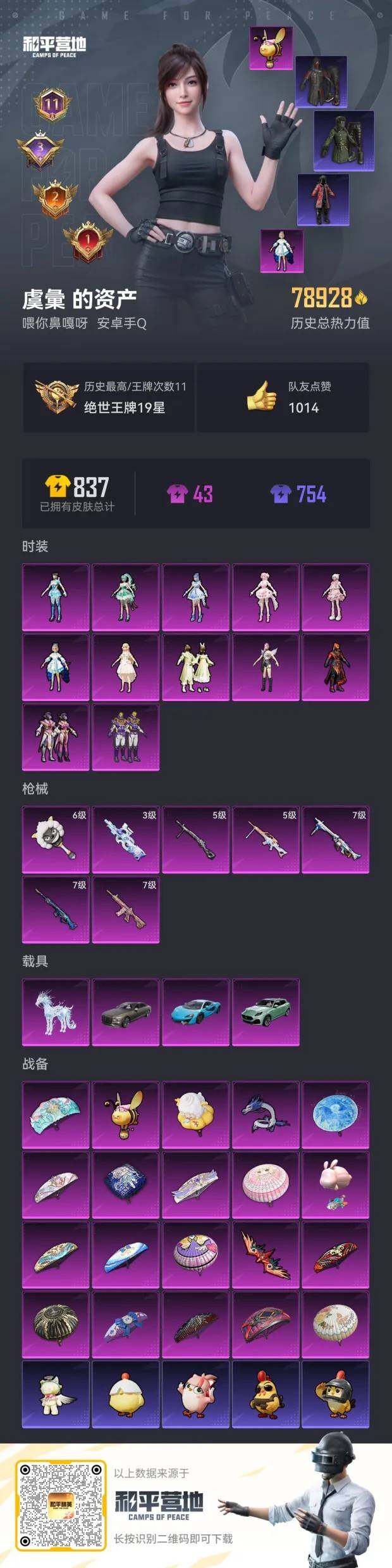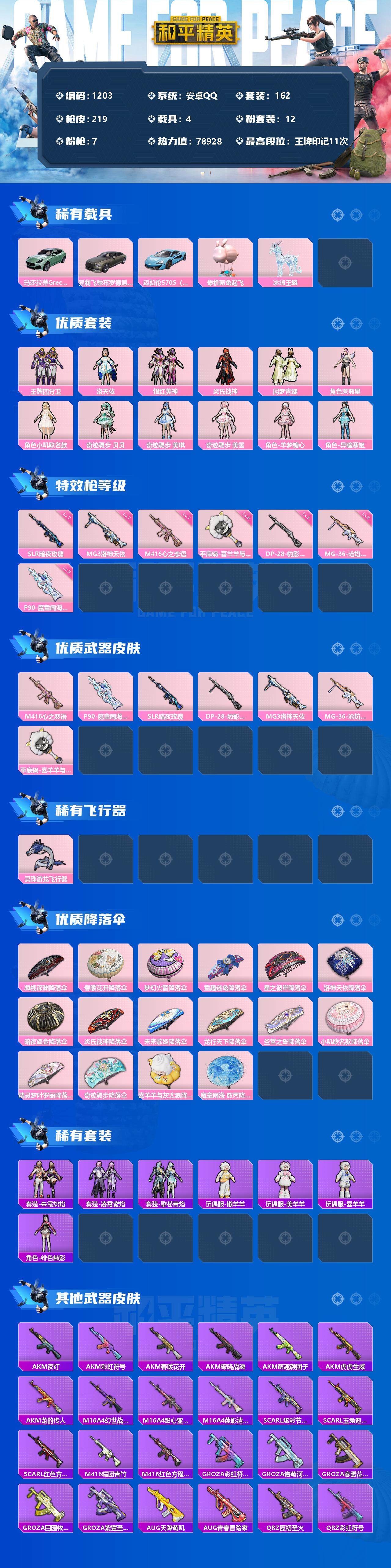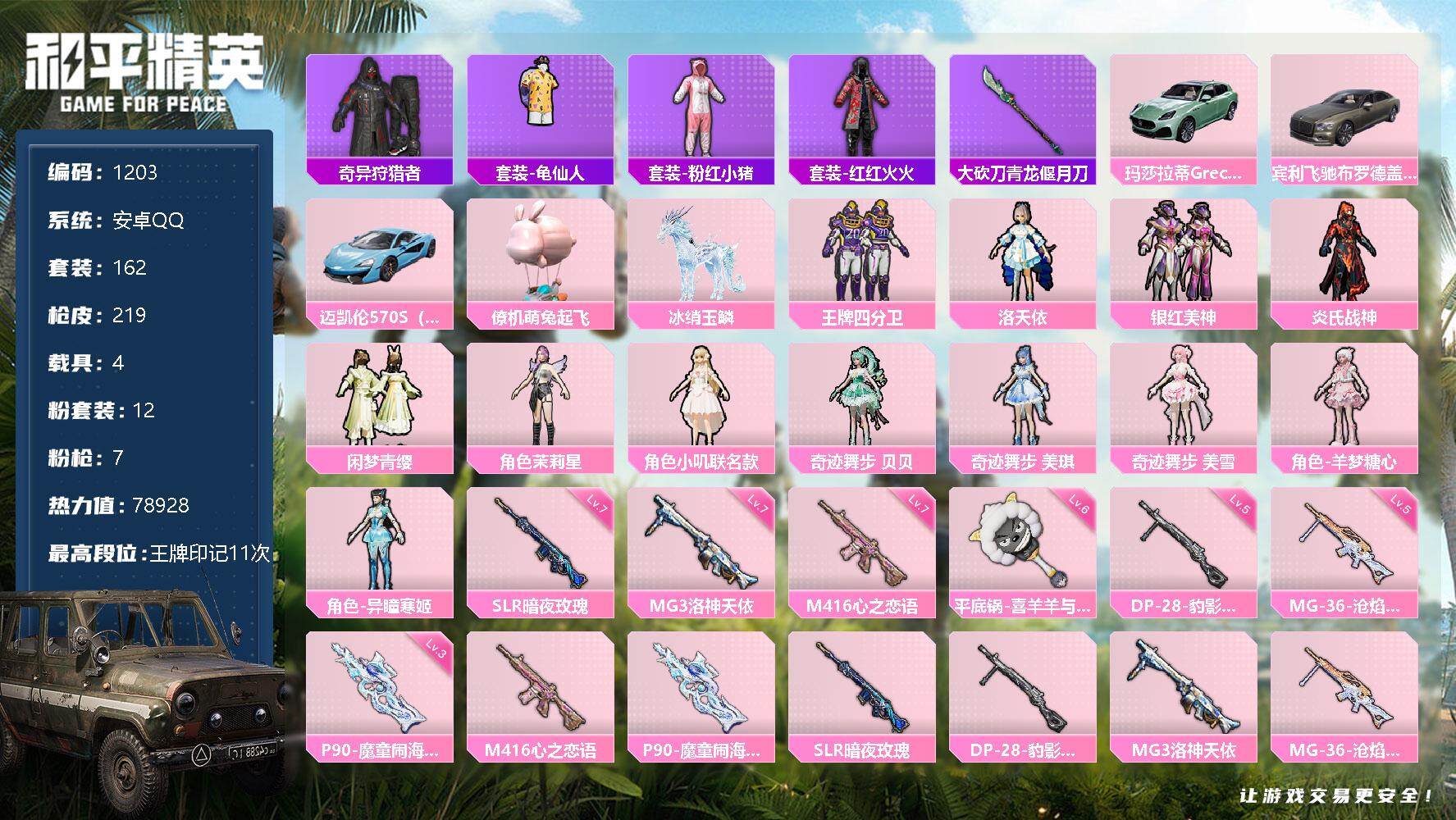 [12813972]安卓 手Q-12粉装-7特效枪-4载具-3粉色飞行器-78928热力值-11王牌印记-162套装-219枪皮