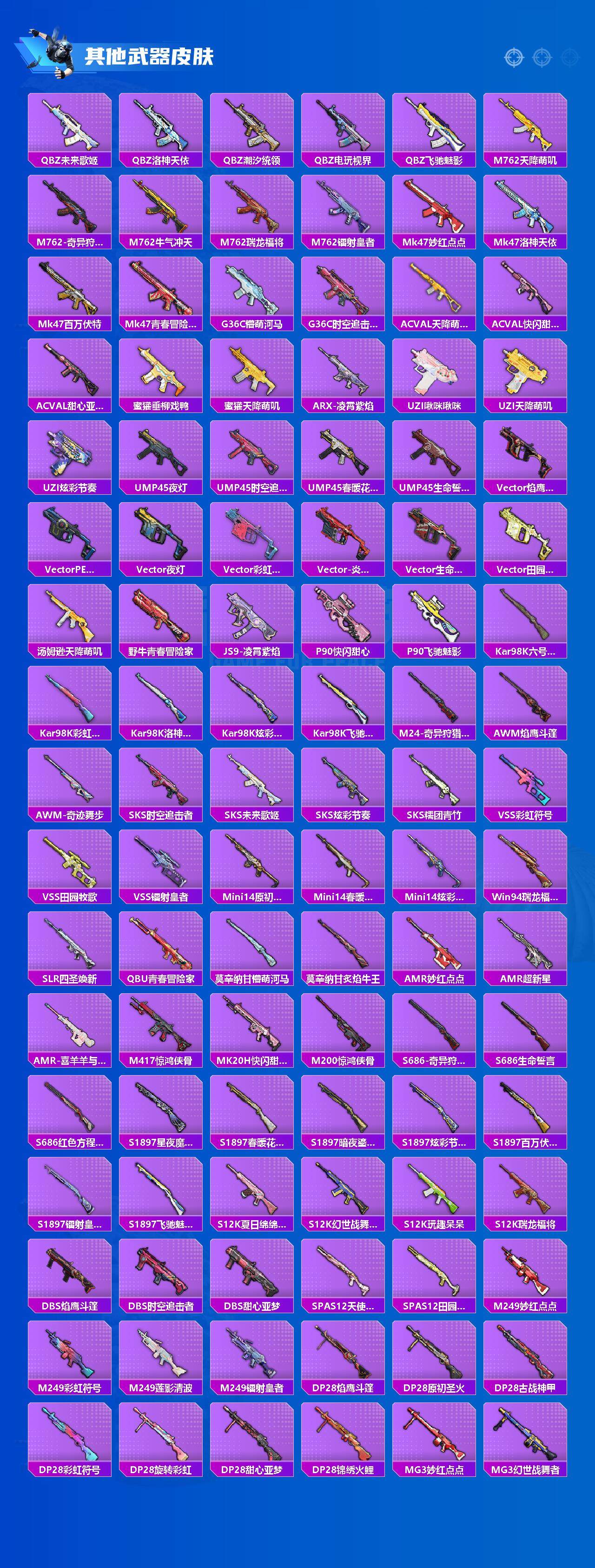 【稀有枪皮】:AKM-夜灯,AKM-彩虹符号,AKM-春暖花开,AKM-破晓战魂,AKM-萌趣颜团子,AKM-虎虎生威,AKM-龙的传人,M16A4-幻世战舞者,M16A4-甜心亚梦,M16A4-莲影清波,SCAR-L-炫彩节奏,SCAR-L-玉兔迎春,SCAR-L-红色方程式,M416-糯团青竹,M416-红色方程式,GROZA-彩虹符号,GROZA-懵萌河马,GROZA-春暖花开,GROZA-田园牧歌,GROZA-紫翼圣骑,AUG-天降萌叽,AUG-青春冒险家,QBZ-原初圣火,QBZ-彩虹符号,QBZ-未来歌姬,QBZ-洛神天依,QBZ-潮汐统领,QBZ-电玩视界,QBZ-飞驰魅
