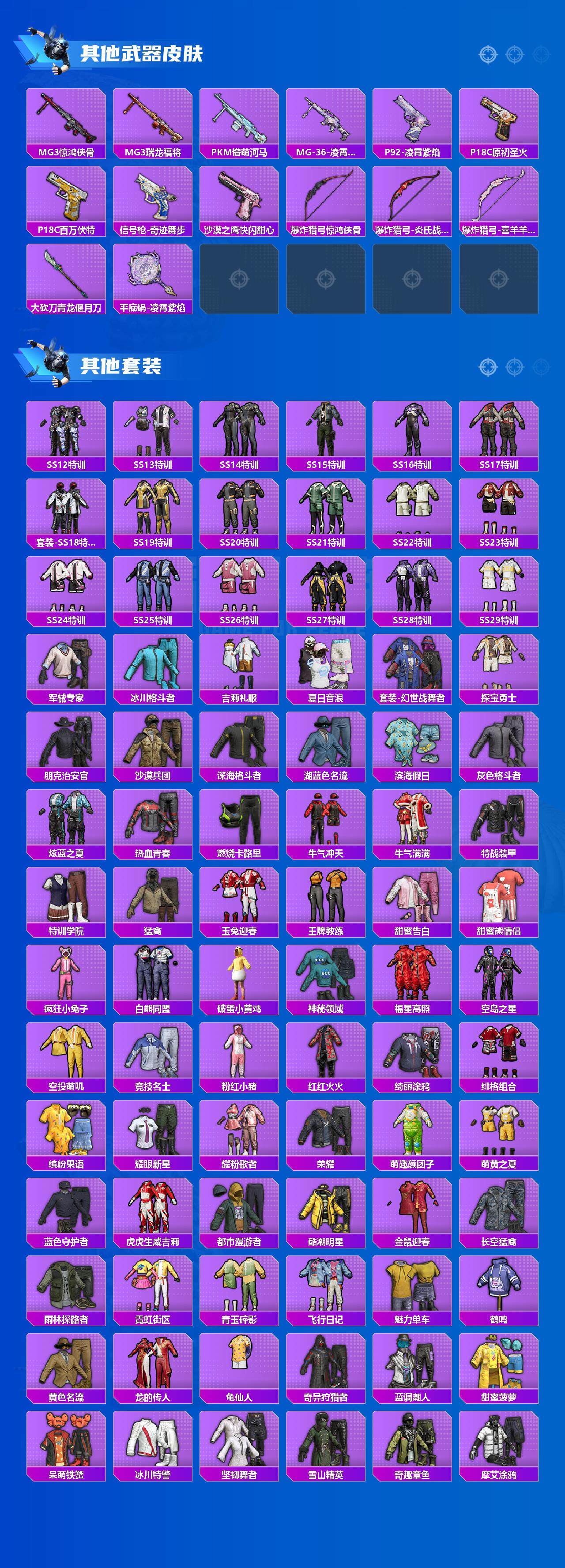 - [11651418]11粉装 4特效枪 2载具 3印记 可二次 可修改实名 优质装备:玛莎拉蒂Grecale(薄荷绿),玛莎拉蒂Quattroporte(夜幕蓝),梦幻火箭(新101)(新火箭少女101粉色套装),蝶舞迷情,天使彩虹糖,冰霜白皇,M416风花雪月,SCAR-L纯梦嫁纱,Kar98K-巳巳如意 热门装扮:蜜桃特工,橘柚倾心,寒光使者,太空嘟嘟,仲夏莫吉托,圣堂之誓,美雪,胖达圆圆 稀有枪皮:DP-28-豹影疾电 六级特效枪:六级M416-风花雪月 四级特效枪:四级SCAR-L-纯梦嫁纱 二级特效枪:二级Kar98K-巳巳如意 一级特效枪:一级DP-28-豹影疾电 紫色装扮:星夜迷魅,田园牧歌,轻风白浪,和煦暖阳,SS22特训,莱茵河畔,SS23特训,幻彩翩翩,妙红点点,摩登艾咪,娇憨猪猪,梦幻奶油,樱桃黑巧,暖心橘喵,萌趣咩咩,SS21特训,绚烂繁星,冰川特警,SS33特训套装,SS20特训,青春冒险家,潮流游乐家,SS15特训,时空追击者,SS16特训,星梦畅游,SS14特训,萌趣颜团子,特种颜团子,SS19特训,豚鼠丹丹,吉莉礼服,瑞龙福将,团圆交子,SS17特训,SS18特训,都市漫游者,酷潮明星,长空猛禽,霓虹街区,缤纷果语,蜜露汐语,飞行日记,骑行爱好者,魅力单车,鹤鸣,龙魂突击队,沙漠毒蛇,格斗先锋,海岛探路者,涂山之恋,滨海假日,夏日音浪,幻世战舞者,探宝勇士,湖蓝色名流,滨海厨神,绮丽涂鸦,破蛋小黄鸡,福星高照,空岛之星,甜蜜熊情侣,灿烂千阳,牛气满满,狂沙舞者,SS29特训,湖畔霞光,SS28特训,玉兔迎春,巳巳如意,竞技名士,绒宝小鹅,神气柴柴,懵萌河马,SS24特训(SS24特训套装),月光变奏,皇家花园,锦衣飞扬,星际旅行,舰行太空,无暇誓言,明鸳圣池,牛仔情诗,浪漫天命,SS26特训,晶辉守护,淡雅花蕊,玲珑飞花,辉星之火,纯白誓言,暗夜契约,本愿之火,耀粉歌者,SS32特训服(SS32特训套装),幽秘之星,萌黄之夏,光之冒险,海上生明月 优质战备:圣堂之誓降落伞,彩装战姬降落伞,萌物绒绒降落伞,星之彼岸降落伞,蜜语绒猫降落伞,太空嘟嘟飞行器,甜梦小狐降落伞,彩虹甜喵降落伞,太空嘟嘟降落伞,圣光天使降落伞,飞行器-圣光天使,环太平洋降落伞,暗夜鎏金降落伞,音爆索尼克降落伞,仲夏莫吉托降落伞,第五大道降落伞,春暖花开降落伞,飞行器-春暖花开