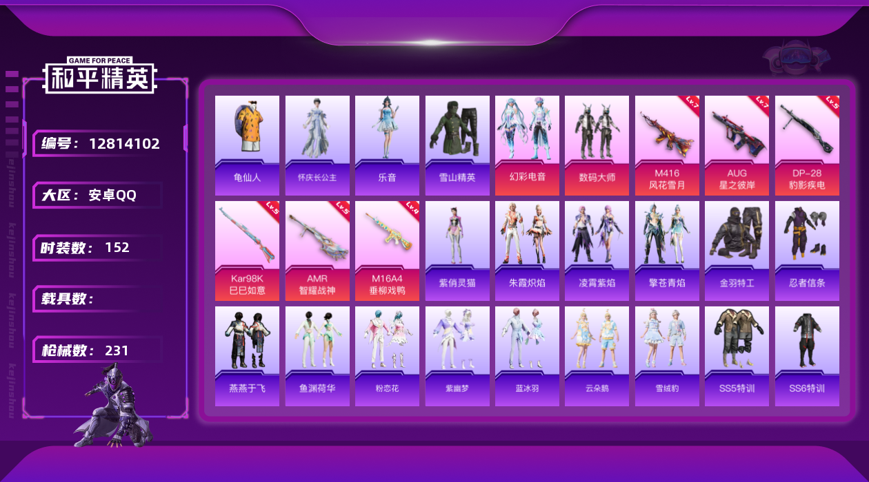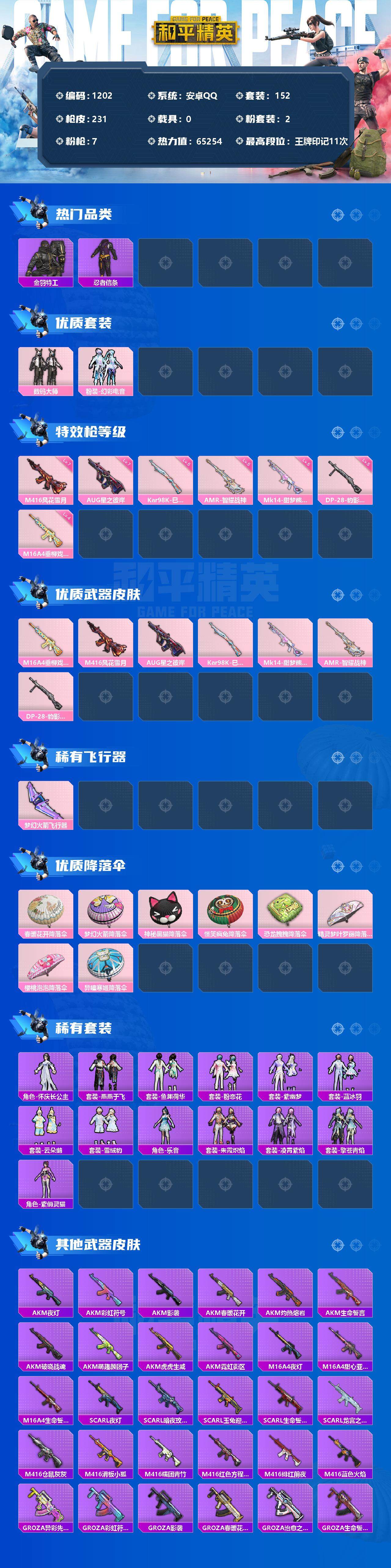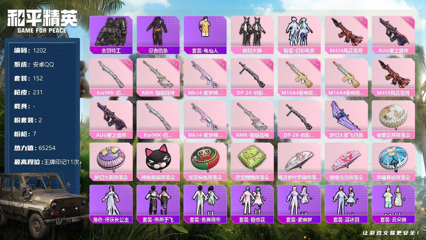 [12814102]安卓 手Q-2粉装-7特效枪-0载具-1粉色飞行器-65254热力值-11王牌印记-152套装-231枪皮 【热门品类】:套装-金羽特工,套装-忍者信条,套装-龟仙人 【粉色套装】:粉装-数码大师,粉装-幻彩电音 【粉色枪皮等级】:M16A4-垂柳戏鸭(四级),M416-风花雪月(七级),AUG-星之彼岸(七级),Kar98K-巳巳如意(五级),Mk14-甜梦熊击(五级),AMR-智耀战神(五级),DP-28-豹影疾电(五级) 【粉色枪皮】:M16A4-垂柳戏鸭,M416-风花雪月,AUG-星之彼岸,Kar98K-巳巳如意,Mk14-甜梦熊击,AMR-智耀战神,DP-28-豹影疾电 【粉色飞行器】:梦幻火箭飞行器 【粉色降落伞】:春暖花开降落伞,梦幻火箭降落伞,神秘黑猫降落伞,怪笑疯兔降落伞,恐龙拽拽降落伞,精灵梦叶罗丽降落伞,樱桃泡泡降落伞,异瞳寒姬降落伞 【稀有套装】:套装-龟仙人,角色-怀庆长公主,套装-燕燕于飞,套装-鱼渊荷华,套装-粉恋花,套装-紫幽梦,套装-蓝冰羽,套装-云朵鹅,套装-雪绒豹,角色-乐音,套装-朱霞炽焰,套装-凌霄紫焰,套装-擎苍青焰,角色-紫俏灵猫 【稀有枪皮】:AKM-夜灯,AKM-彩虹符号,AKM-影袭,AKM-春暖花开,AKM-灼热熔岩,AKM-生命誓言,AKM-破晓战魂,AKM-萌趣颜团子,AKM-虎虎生威,AKM-霓虹街区,M16A4-夜灯,M16A4-甜心亚梦,M16A4-生命誓言,SCAR-L-夜灯,SCAR-L-暗夜玫瑰,SCAR-L-玉兔迎春,SCAR-L-生命誓言,SCAR-L-龙宫之主,M416-仓鼠灰灰,M416-滑板小狐,M416-糯团青竹,M416-红色方程式,M416-绯红前夜,M416-蓝色火焰,GROZA-异彩先驱,GROZA-彩虹符号,GROZA-影袭,GROZA-春暖花开,GROZA-治愈之星,GROZA-生命誓言,GROZA-黑色刀锋,AUG-耀粉歌者,AUG-青春冒险家,M762-天降萌叽,M762-彩虹符号,M762-拳皇97,M762-牛气冲天,M762-瑞龙福将,M762-甜心宝贝,M762-绯红前夜,M762-云朵鹅,M762-幻影飞狐,Mk47-青春冒险家,G36C-时空追击者,G36C-星穹咏叹调,AC-VAL-天降萌叽,AC-VAL-甜心亚梦,蜜獾-垂柳戏鸭,蜜獾-娇憨猪猪,AR