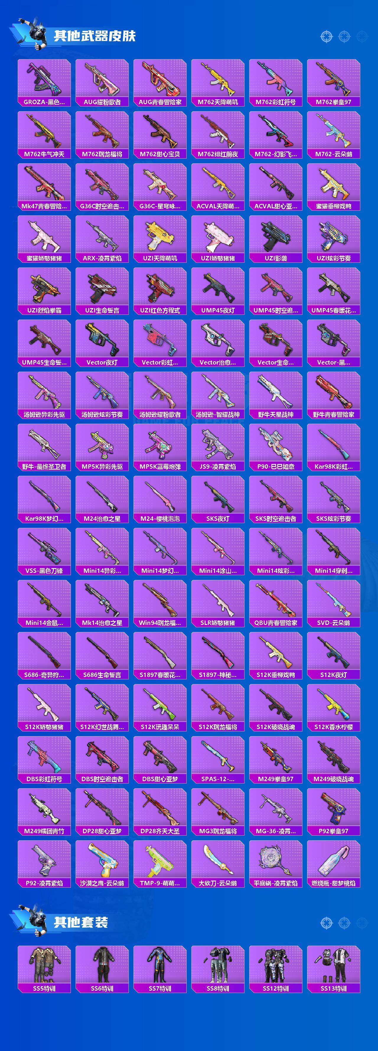 【稀有枪皮】:AKM-夜灯,AKM-彩虹符号,AKM-影袭,AKM-春暖花开,AKM-灼热熔岩,AKM-生命誓言,AKM-破晓战魂,AKM-萌趣颜团子,AKM-虎虎生威,AKM-霓虹街区,M16A4-夜灯,M16A4-甜心亚梦,M16A4-生命誓言,SCAR-L-夜灯,SCAR-L-暗夜玫瑰,SCAR-L-玉兔迎春,SCAR-L-生命誓言,SCAR-L-龙宫之主,M416-仓鼠灰灰,M416-滑板小狐,M416-糯团青竹,M416-红色方程式,M416-绯红前夜,M416-蓝色火焰,GROZA-异彩先驱,GROZA-彩虹符号,GROZA-影袭,GROZA-春暖花开,GROZA-治愈之星,GROZA-生命誓言,GROZA-黑色刀锋,AUG-耀粉歌者,AUG-青春冒险家,M762-天降萌叽,M762-彩虹符号,M762-拳皇97,M762-牛气冲天,M762-瑞龙福将,M762-甜心宝贝,M762-绯红前夜,M762-云朵鹅,M762-幻影飞狐,Mk47-青春冒险家,G36C-时空追击者,G36C-星穹咏叹调,AC-VAL-天降萌叽,AC-VAL-甜心亚梦,蜜獾-垂柳戏鸭,蜜獾-娇憨猪猪,AR