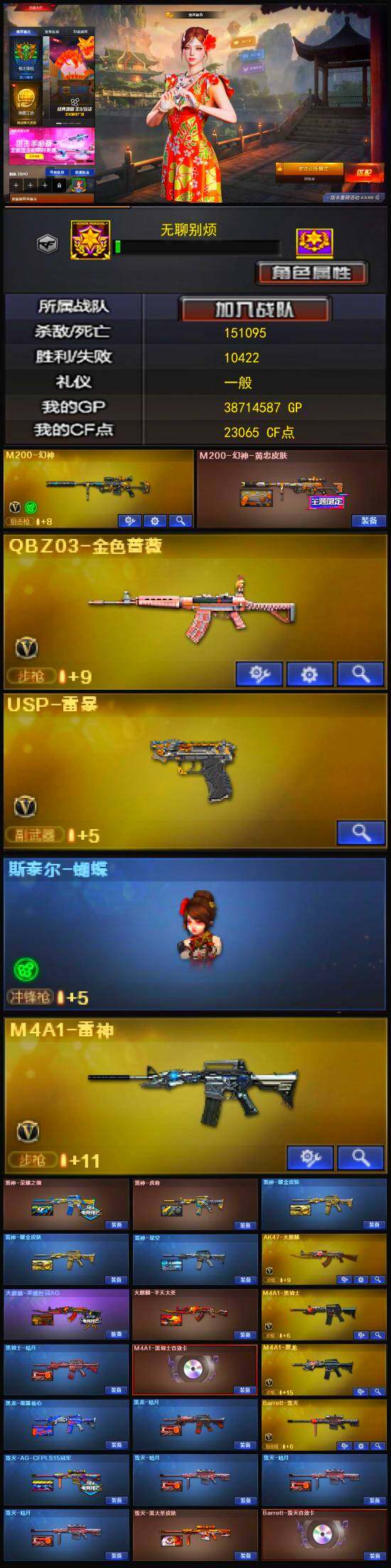 【热门武器】:QBZ03-金色蔷薇,M200-幻神,M4A1-黑骑士,斯泰尔-蝴蝶,COP-白鲨,USP-雷暴,沙鹰-修罗