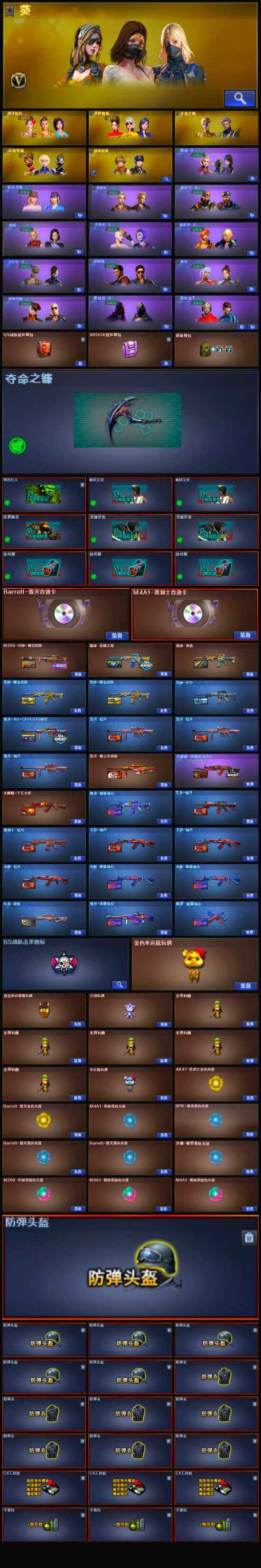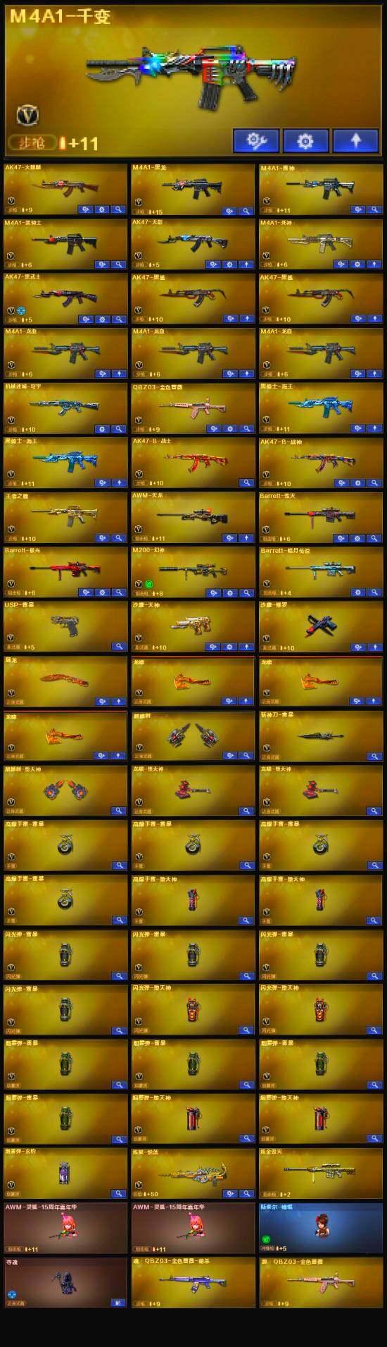 【英雄级武器】:麒麟刺-堕天神,龙啸-堕天神*2,USP-雷暴,斩神刀-雷暴,QBZ03-金色蔷薇,M4A1-雷神,M4A1-黑龙,M4A1-黑骑士,M4A1-死神,AK47-无影,AK47-火麒麟,AK47-黑武士,AWM-天龙,Barrett-毁灭,Barrett-极光,M4A1-龙血*3,M200-幻神,AK47-黑鲨*2,M4A1-千变,黑骑士-海王*2,AK47-B-战神,M4A1-赤狱骑士,沙鹰-天神,沙鹰-修罗,麒麟刺,龙啸*3,屠龙
