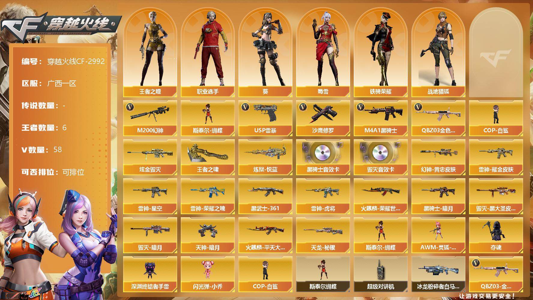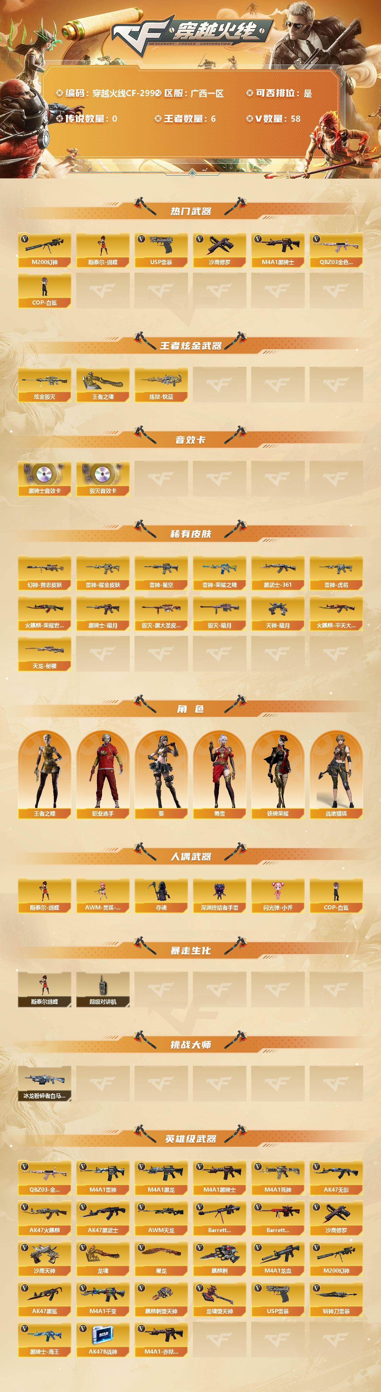 [12814481]广西一区-58V-6王者-1炫金 【热门武器】:QBZ03-金色蔷薇,M200-幻神,M4A1-黑骑士,斯泰尔-蝴蝶,COP-白鲨,USP-雷暴,沙鹰-修罗 【王者炫金武器】:炫金毁灭,炼狱-悦蓝,王者之啸 【音效卡】:M4A1-黑骑士音效卡,Barrett-毁灭音效卡 【稀有皮肤】:M200-幻神-黄忠皮肤,雷神-荣耀之魄,雷神-星空,雷神-虎将,雷神-耀金皮肤*2,火麒麟-平天大圣,火麒麟-荣耀世冠AG,黑骑士-暗月,毁灭-暗月*3,毁灭-黑大圣皮肤,天龙-秘银,AK47-黑武士-361,天神-暗月*2 【角色】:王者之瞳,葵,战地猎狐,蜀雪,铁骑荣耀,职业选手 【人偶武器】:COP-白鲨,斯泰尔-蝴蝶,AWM-灵狐-15周年嘉年华*2,夺魂,深渊终结者手雷,闪光弹-小乔 【暴走生化】:斯泰尔-蝴蝶,超级对讲机 【挑战大师】:冰龙粉碎者-白马银枪 【英雄级武器】:麒麟刺-堕天神,龙啸-堕天神*2,USP-雷暴,斩神刀-雷暴,QBZ03-金色蔷薇,M4A1-雷神,M4A1-黑龙,M4A1-黑骑士,M4A1-死神,AK47-无影,AK47-火麒麟,AK47-黑武士,AWM-天龙,Barrett-毁灭,Barrett-极光,M4A1-龙血*3,M200-幻神,AK47-黑鲨*2,M4A1-千变,黑骑士-海王*2,AK47-B-战神,M4A1-赤狱骑士,沙鹰-天神,沙鹰-修罗,麒麟刺,龙啸*3,屠龙 【特殊枪械】:蝴蝶斯泰尔+0烈龙,1黑骑士,1蝴蝶斯泰尔