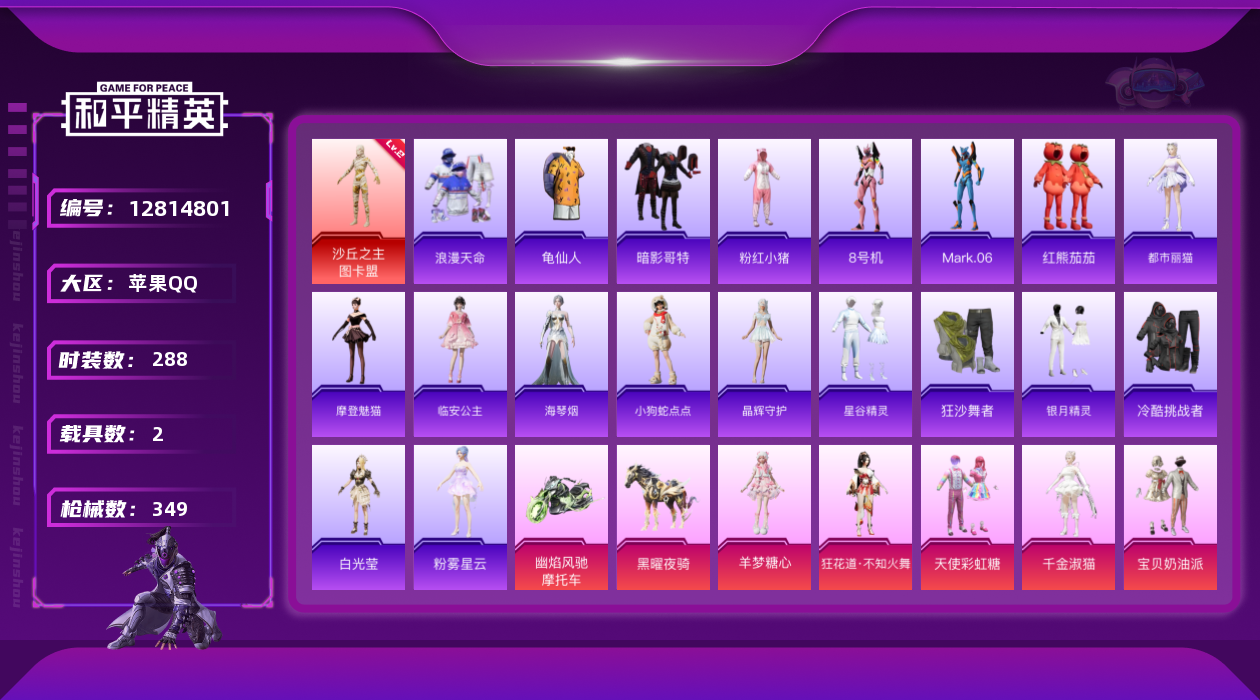 [12814801]苹果 手Q-1神装-26粉装-13特效枪-2载具-14粉色飞行器-127606热力值-19王牌印记-288套装-349枪皮 【红色神装等级】:沙丘之主-图卡盟(二级) 【红色角色神装】:沙丘之主-图卡盟 【热门品类】:粉装-梦幻火箭,粉装-缤纷油彩,套装-浪漫天命,套装-火箭少女101,套装-都市猎人,套装-派对舞王,套装-小丑鱼,角色-军刀雅典娜,套装-胖达团团,套装-胖达圆圆,套装-动感兔斯基人偶服,角色-忠猛周仓,角色-忠真马岱,套装-龟仙人,套装-暗影哥特,套装-粉红小猪,角色-8号机,角色-Mark.06,撬棍-龙胆亮银枪,套装-红熊茄茄 【粉色载具】:幽焰风驰摩托车,黑曜夜骑 【粉色套装】:粉装-宝贝奶油派,粉装-天使彩虹糖,粉装-梦幻火箭,粉装-缤纷油彩,粉装-放客神游,粉装-冰霜白皇,粉装-炙焰红王,粉装-蜜桃特工,粉装-蝶舞蔷薇,粉装-彩虹鹿灵,角色-复仇流浪者,粉装-暖熊萌萌,粉装-垂柳戏鸭,粉装-旋转彩虹,粉装-暗夜鎏金,粉装-第五大道,粉装-炫光之旅,粉装-憨憨奶龙,粉装-蜜语绒猫,角色-初号机 觉醒Ver.,角色-狂花道·不知火舞,角色-千金淑猫,粉装-雪月幻音,角色-狂魅哈莉,角色-绯穹魔姬,角色-羊梦糖心 【粉色枪皮等级】:AKM-星际浪客(四级),AKM-幽焰骑士(三级),M16A4-垂柳戏鸭(五级),SCAR-L-锦绣绵绵(五级),M416-五爪金龙(七级),Famas-初号机 觉醒Ver.(七级),UMP45-量子极限(五级),UMP45-宇宙意志(三级),Kar98K-巳巳如意(五级),M417-第五大道(三级),DP-28-千金淑猫(四级),DP-28-豹影疾电(五级),破片手榴弹-热量炸弹(七级) 【粉色枪皮】:AKM-星际浪客,AKM-幽焰骑士,M16A4-垂柳戏鸭,SCAR-L-锦绣绵绵,M416-五爪金龙,Famas-初号机 觉醒Ver.,UMP45-量子极限,UMP45-宇宙意志,Kar98K-巳巳如意,M417-第五大道,DP-28-千金淑猫,DP-28-豹影疾电,破片手榴弹-热量炸弹 【粉色飞行器】:酣梦熊熊飞行器,星际浪客飞行器,歌者泠鸢飞行器,沙丘之主天马,繁龙极客飞行器,镜域双华-灵镜之阶,龙翔九天飞行器,星梦奇缘飞行器,曦光华影飞行器,幽焰列车飞行器,凤舞九天飞行器,灵猫魔法师飞行器,灵珠游龙飞行器 【