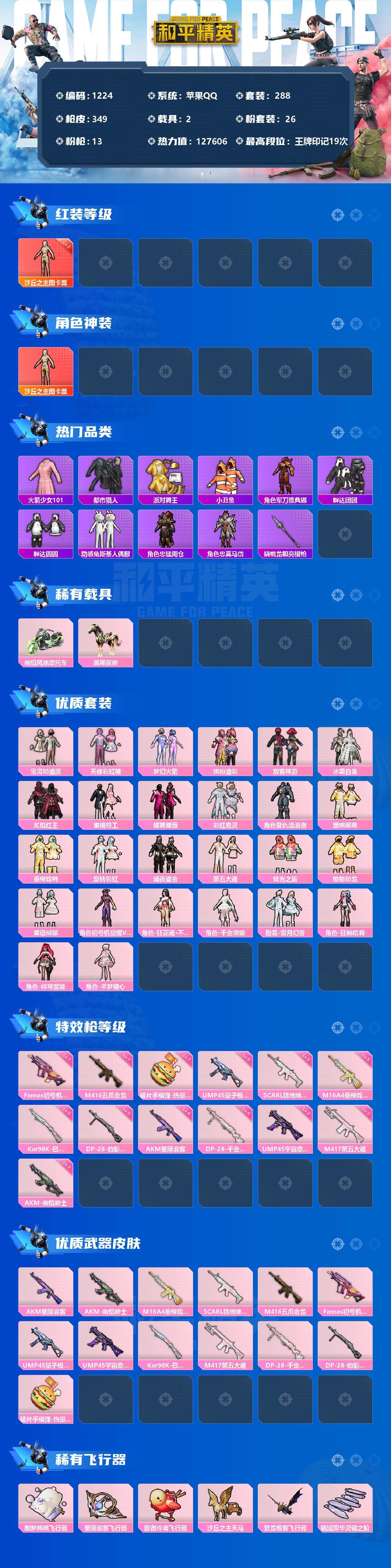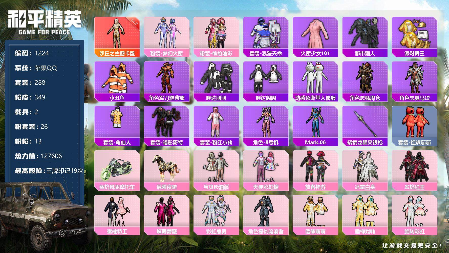 [12814801]苹果 手Q-1神装-26粉装-13特效枪-2载具-14粉色飞行器-127606热力值-19王牌印记-288套装-349枪皮