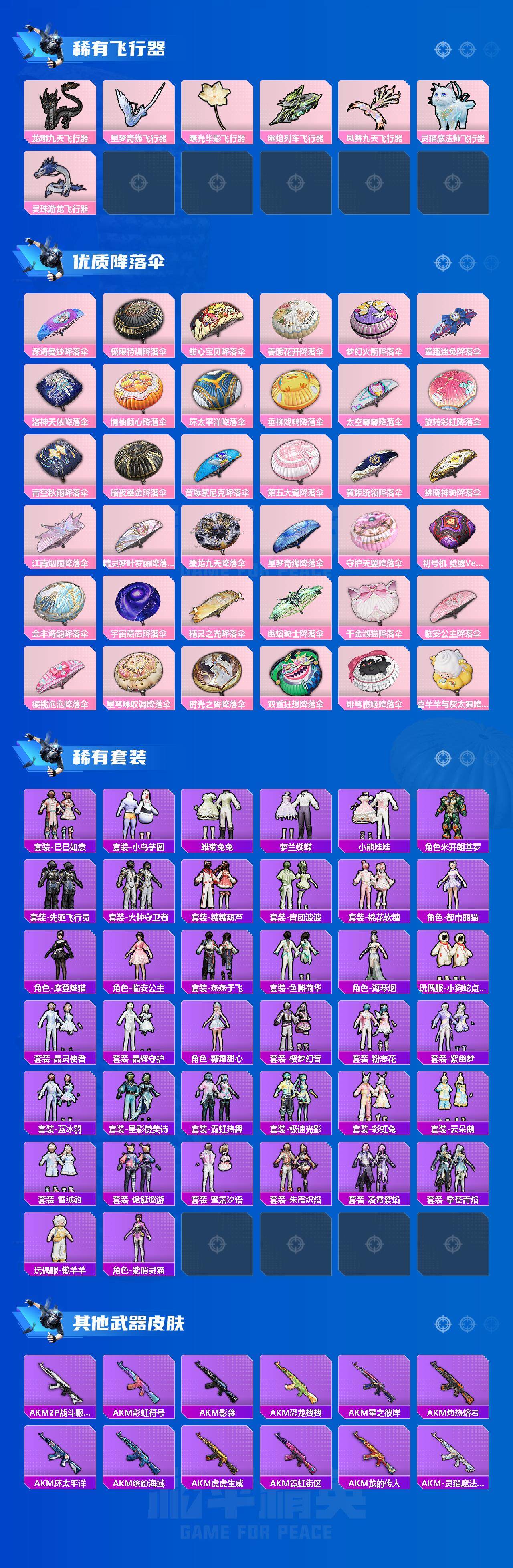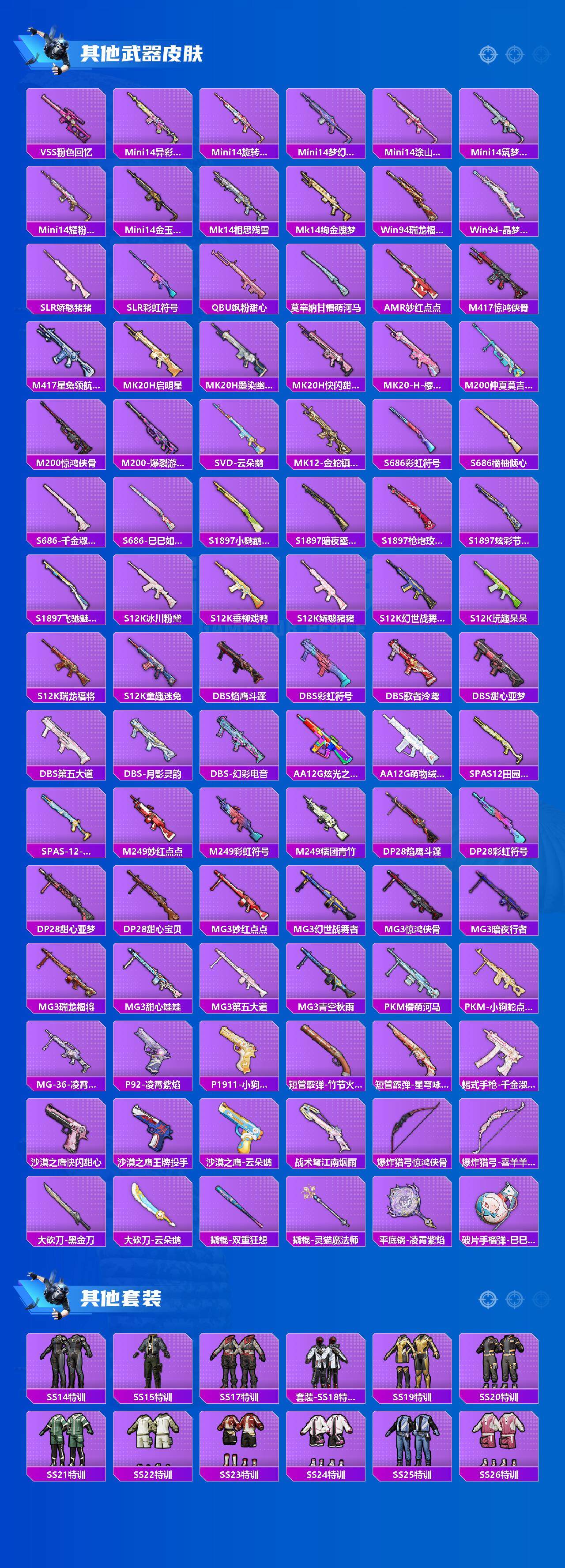 AKM-星际浪客,AKM-幽焰骑士,M16A4-垂柳戏鸭,M416-五爪金龙,Famas-觉醒初号机,UMP45-量子极限,UMP45-宇宙意志,Kar98K-巳巳如意,M417-第五大道,DP-28-千金淑猫,破片手榴弹-热量炸弹