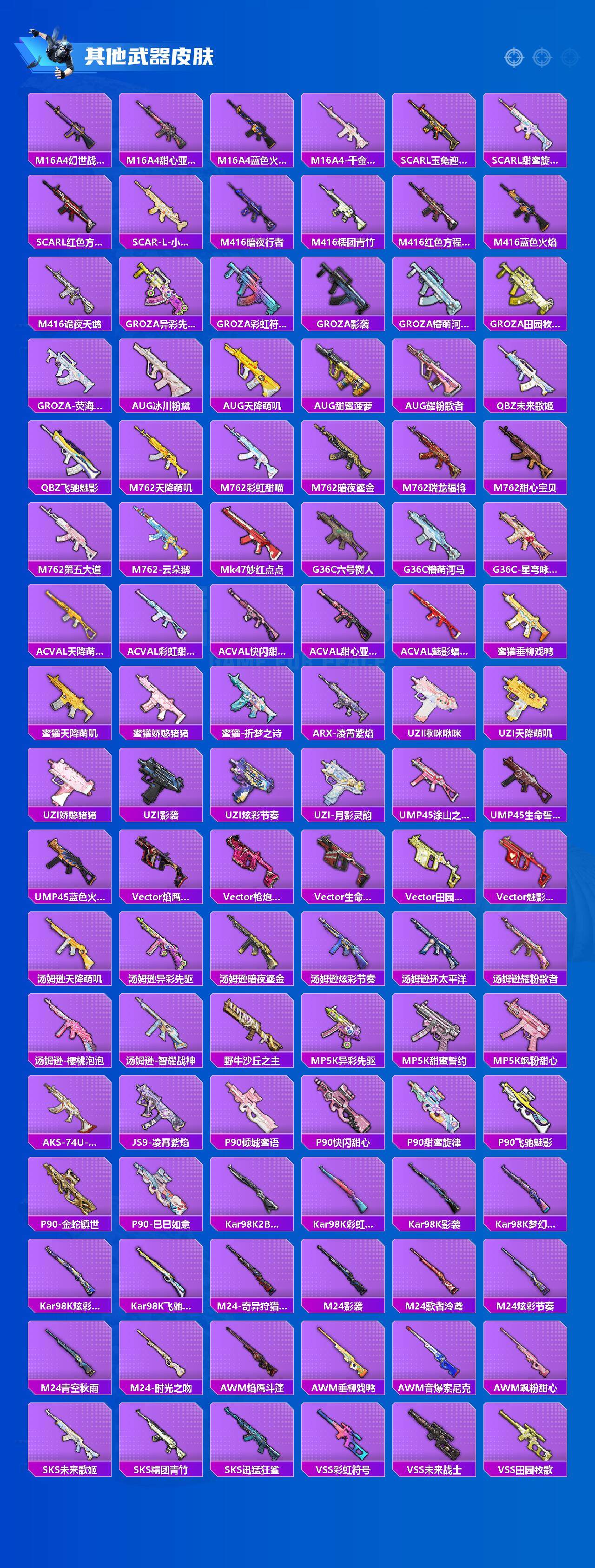 【粉色枪皮】:AKM-星际浪客,AKM-幽焰骑士,M16A4-垂柳戏鸭,SCAR-L-锦绣绵绵,M416-五爪金龙,Famas-初号机 觉醒Ver.,UMP45-量子极限,UMP45-宇宙意志,Kar98K-巳巳如意,M417-第五大道,DP-28-千金淑猫,DP-28-豹影疾电,破片手榴弹-热量炸弹