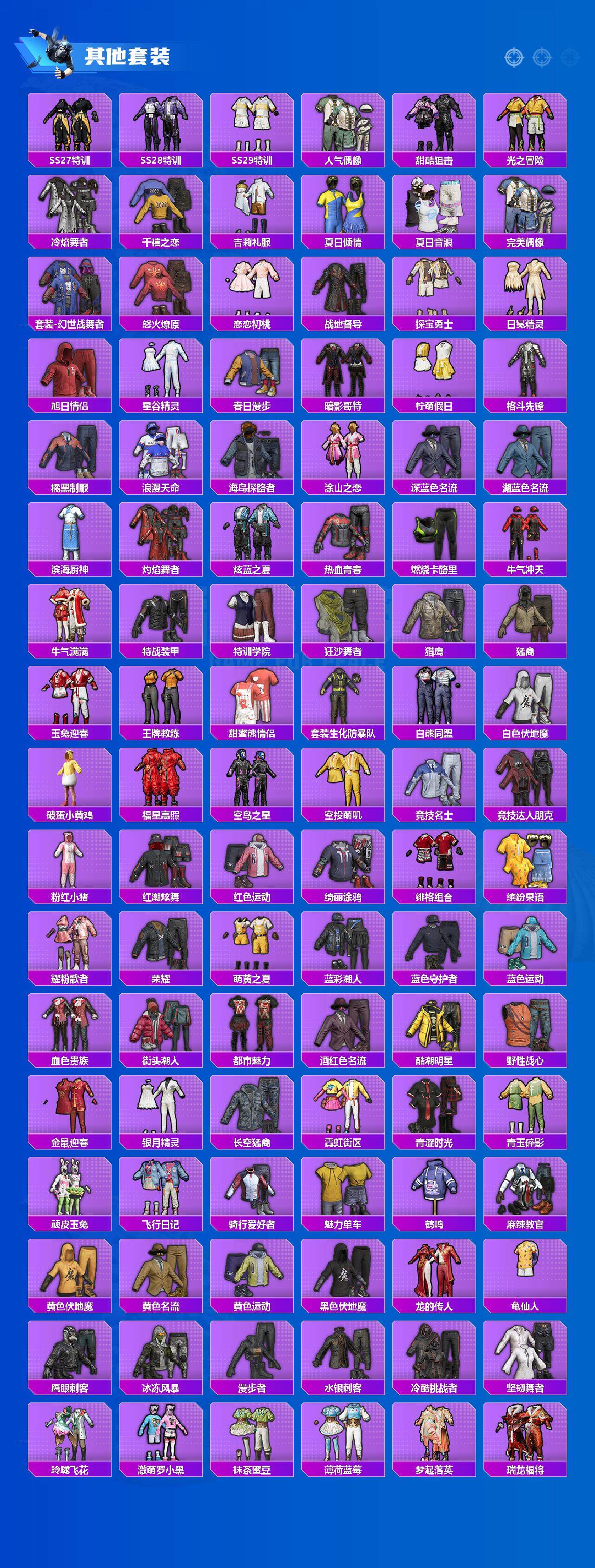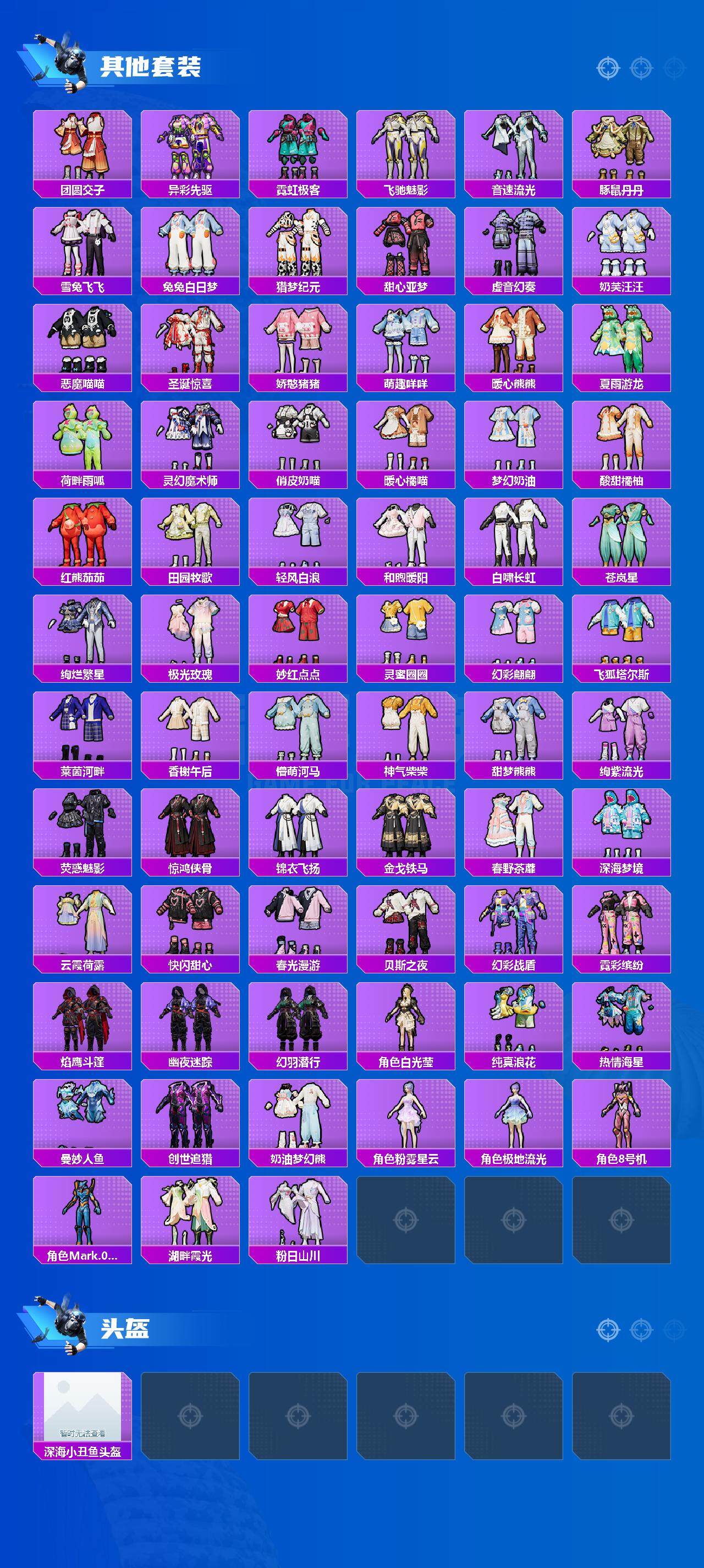 套装-浪漫天命,角色-军刀雅典娜,套装-龟仙人,套装-暗影哥特,套装-粉红小猪,角色-8号机,角色-Mark.06,套装-狂沙舞者,套装-破蛋小黄鸡,套装-漫步者,套装-水银刺客,抹茶蜜豆套装,薄荷蓝莓套装,套装-梦起落英,套装-瑞龙福将,套装-团圆交子,套装-豚鼠丹丹